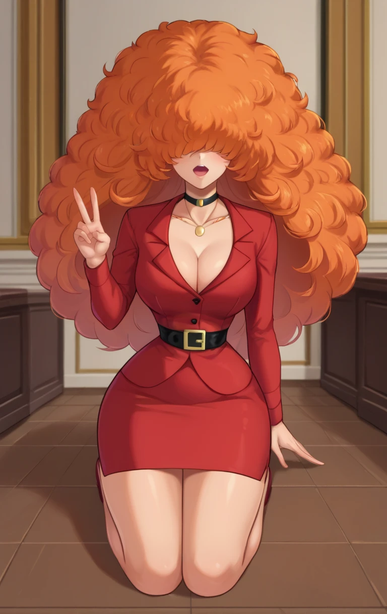 BellumSDXL,1girl,long hair,skirt,cleavage,jewelry,thighs,choker,belt,miniskirt,necklace,orange hair,lips,red skirt,formal,suit,pencil skirt,lipstick,red lips,hair over eyes,afro,big hair