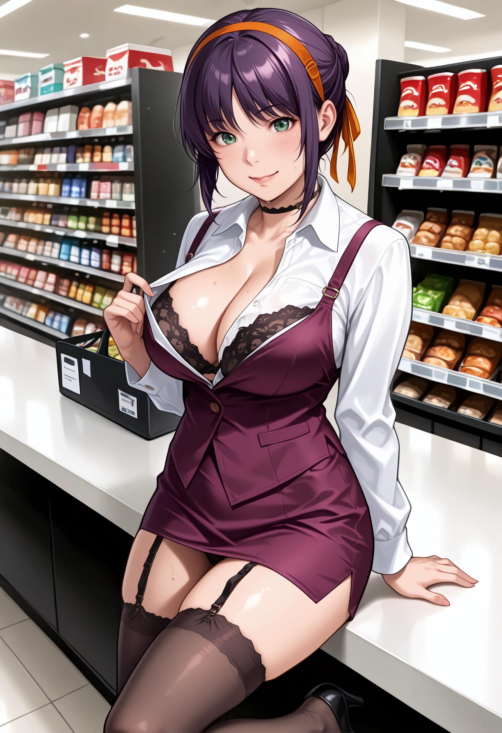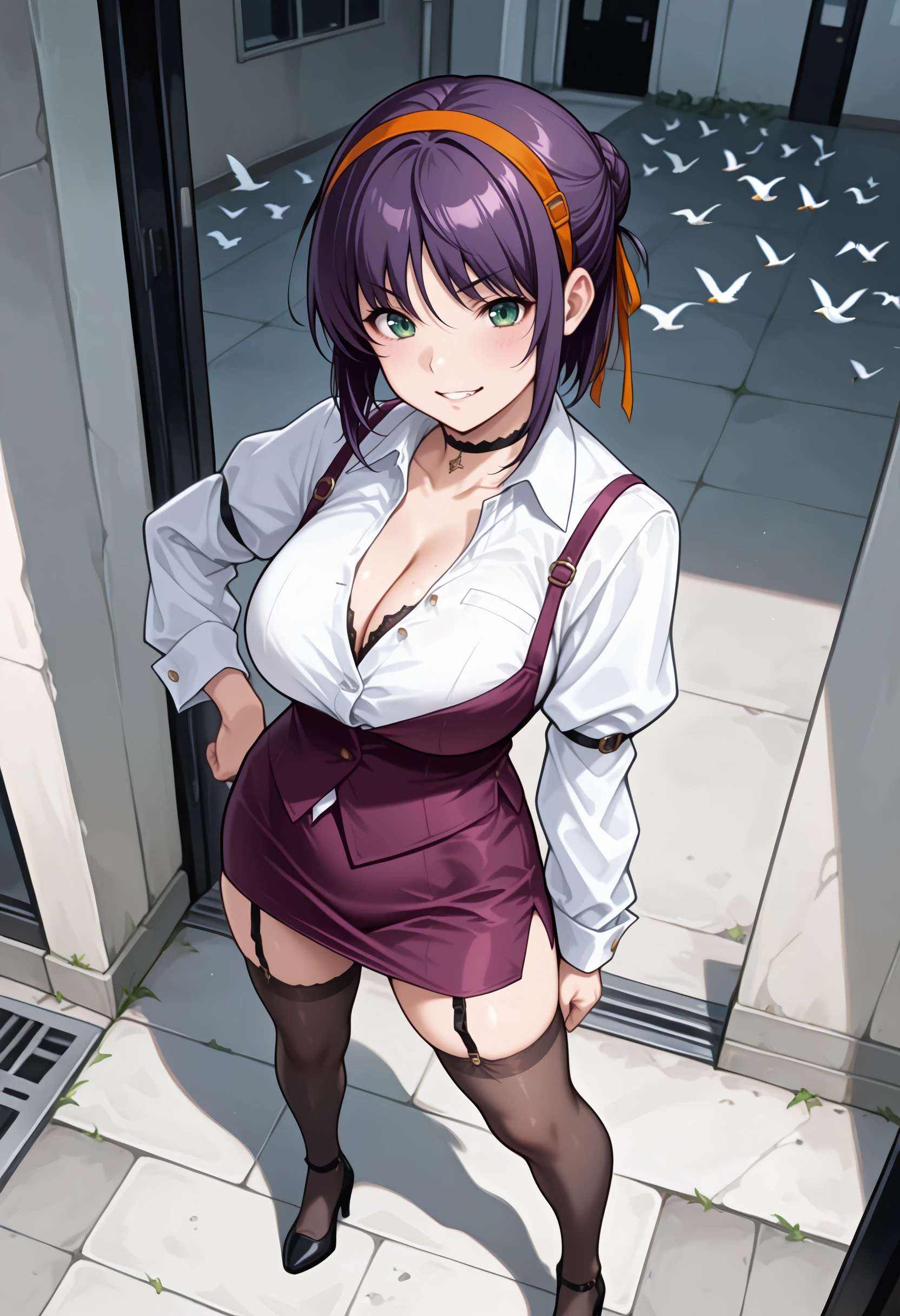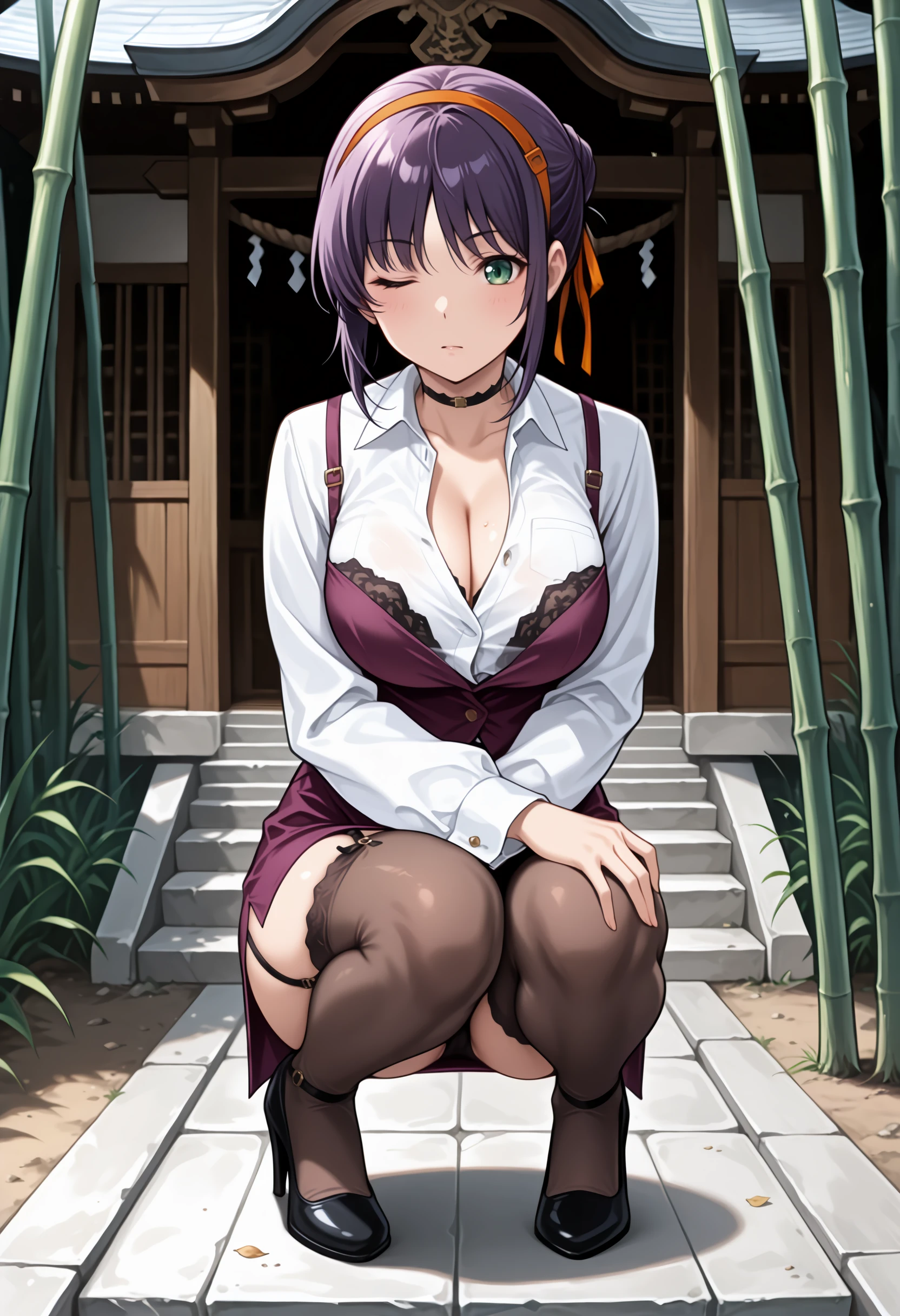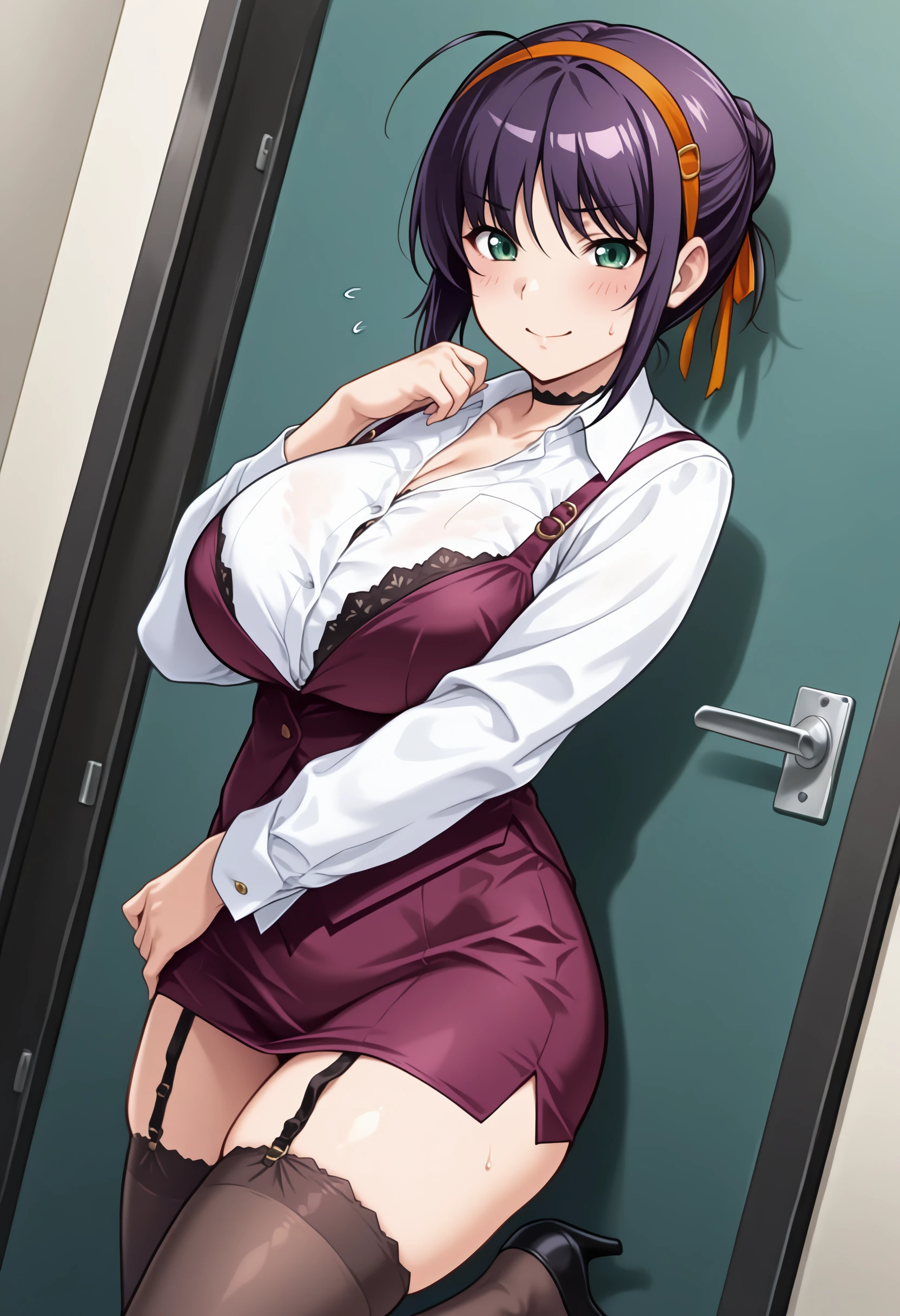 Default Outfit: white shirt, purple skirt, purple dress, shirt under dress, orange hairband, hair ribbon, black footwear, choker, black thighhighs, miniskirt, high heels, garter straps, single hair bun, pencil skirt, lace bra, black bra,