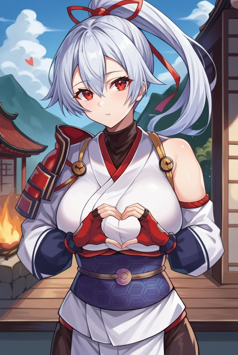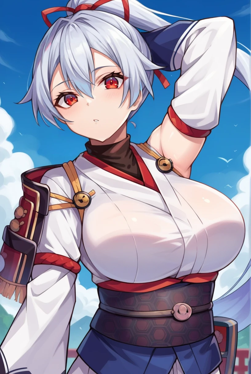 Outfit 1: [Def outfit: "tomoe_def_sdxl, hair ribbon, red ribbon, black undershirt, turtleneck, obi, sash, single shoulder pad, red gloves, fingerless gloves, single detached sleeve, white sleeves, asymmetrical sleeves, uneven sleeves, blue hakama, hakama"]