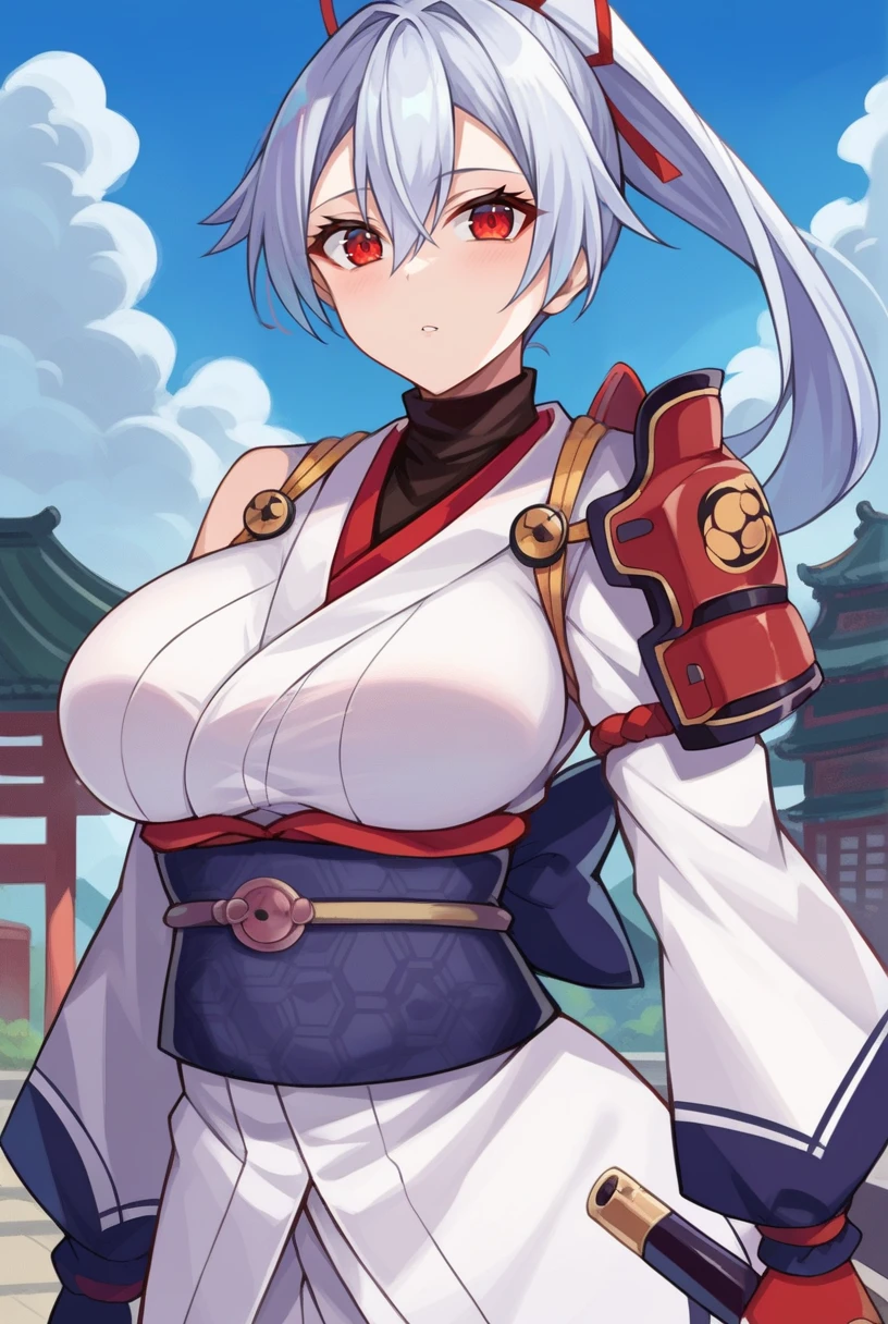 Appearance: "white hair, ponytail, long hair, red eyes"