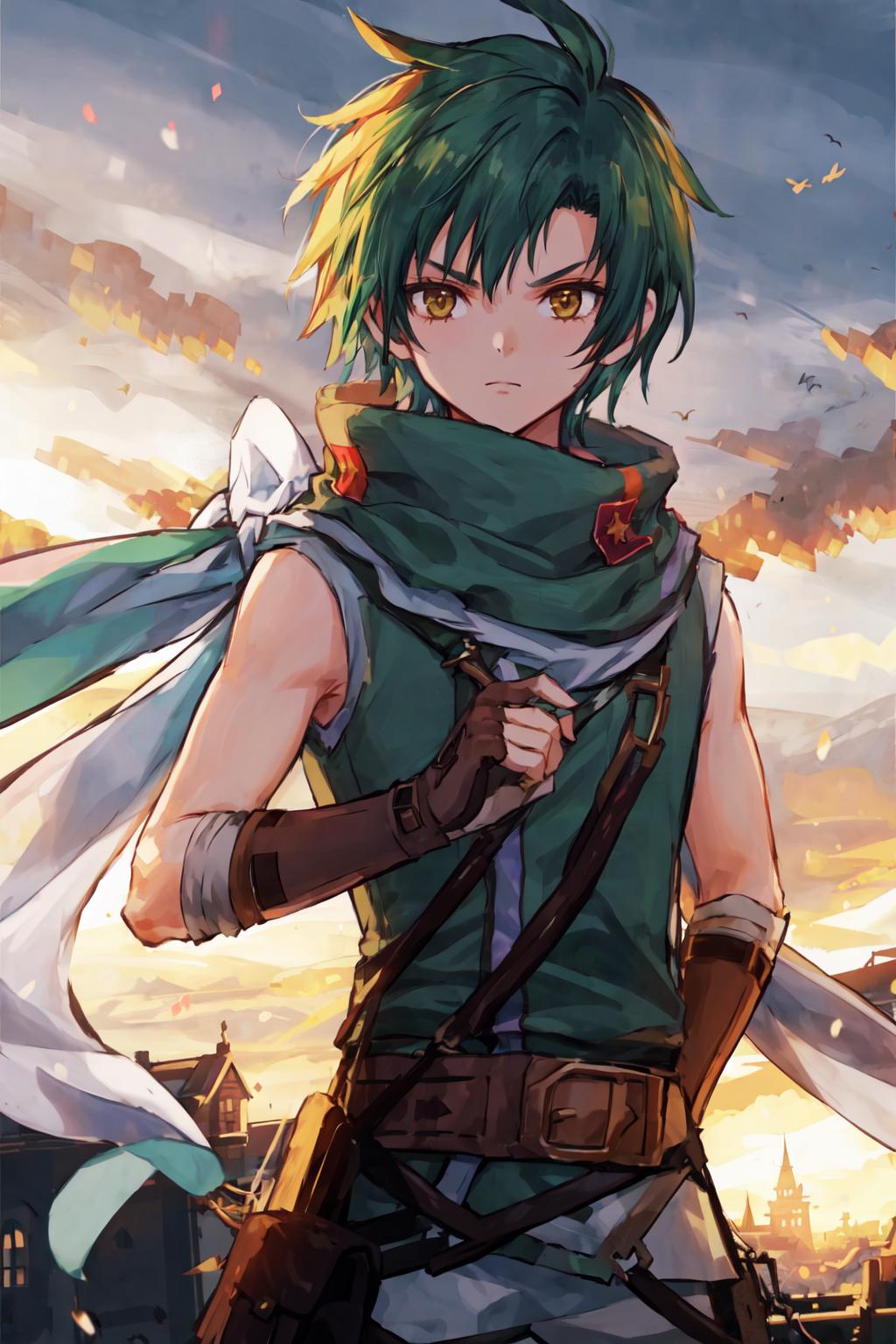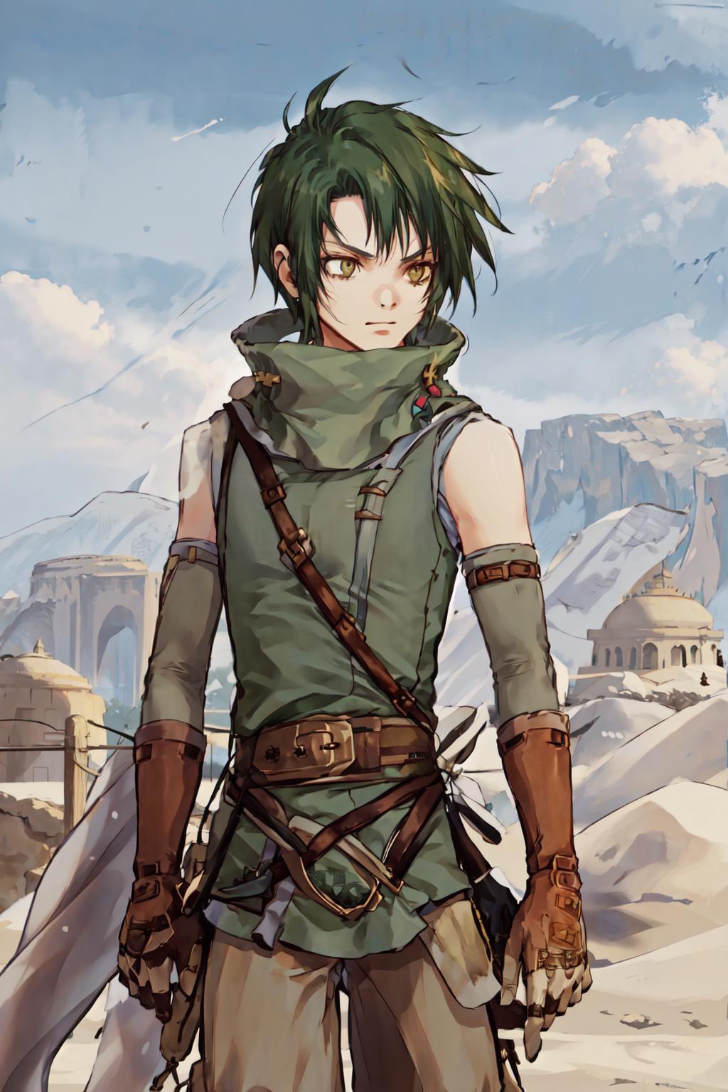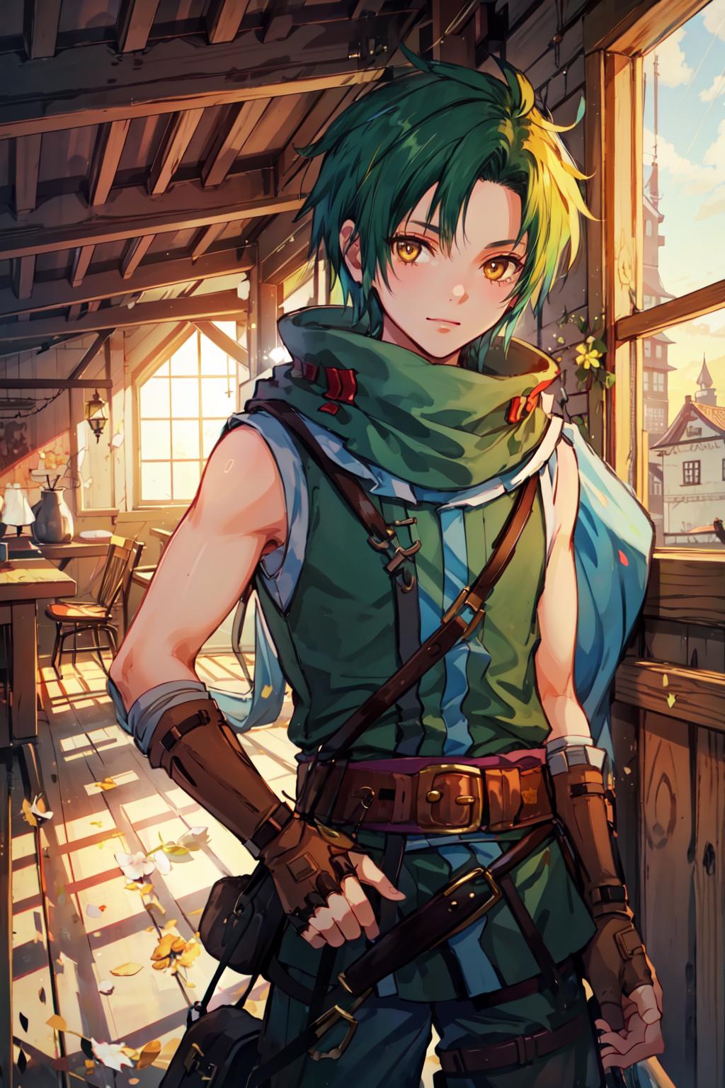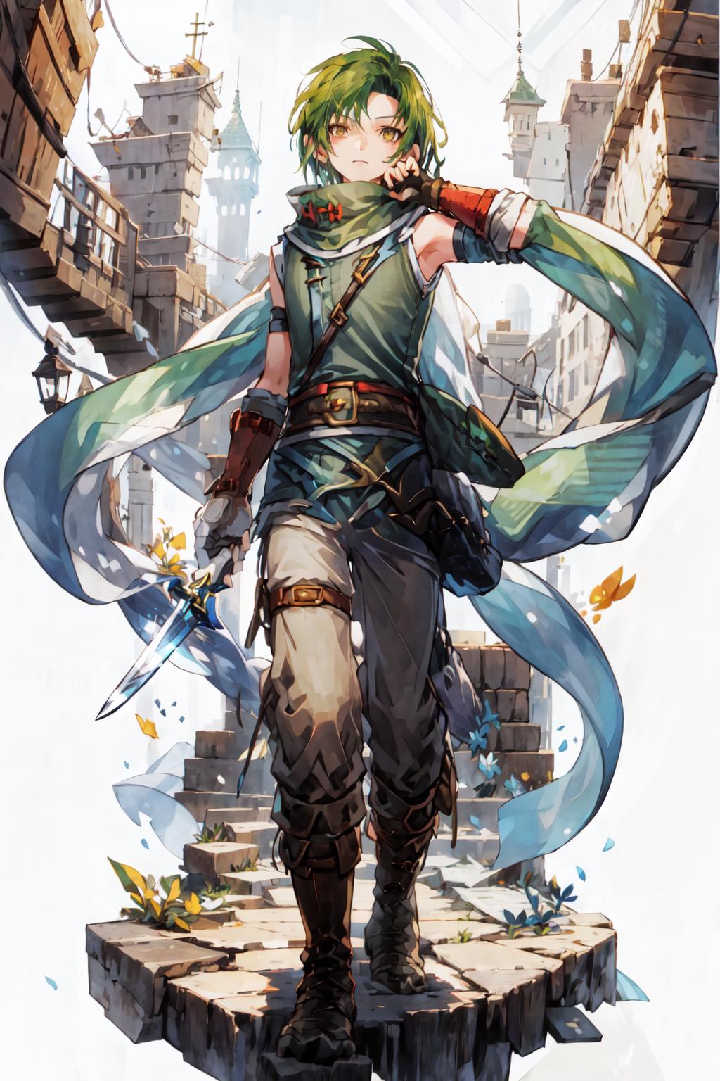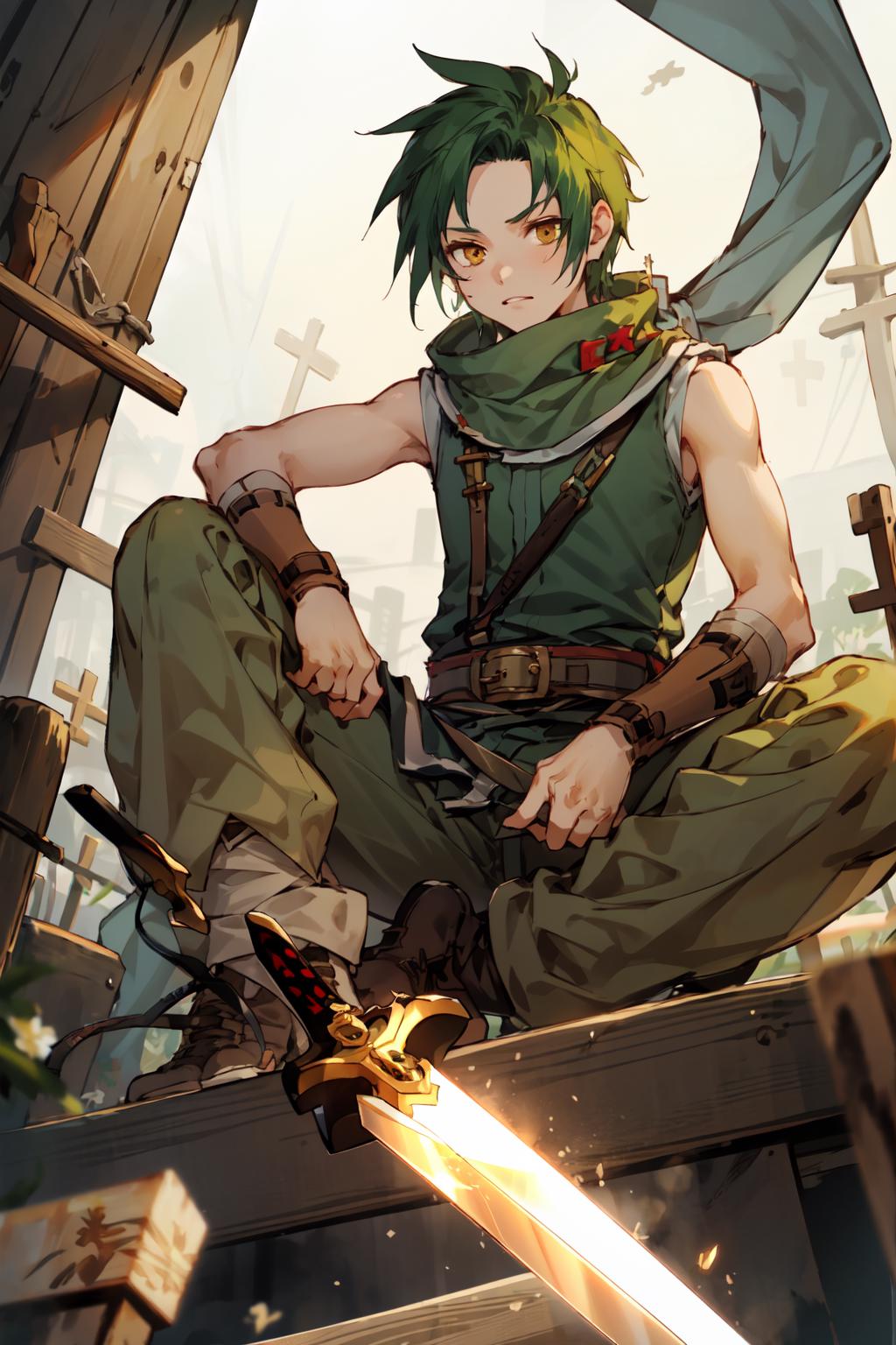 This is Sothe's Path of Radiance design, not his Radiant Dawn one. But since his clothes in both games are pretty much the same, you can prompt midriff and get something that looks very similar to RD Sothe. That said, his PoR design is cooler and I will DIE ON THAT HILL.............. fite me.
