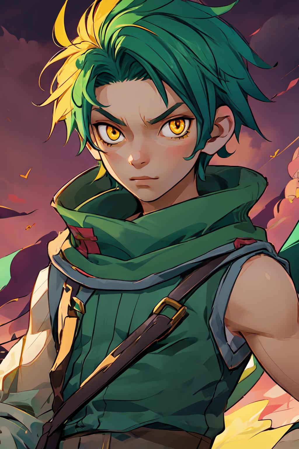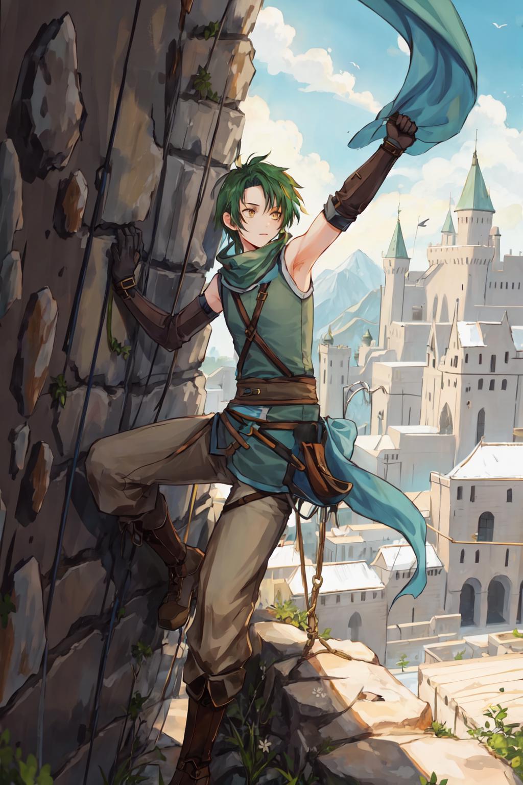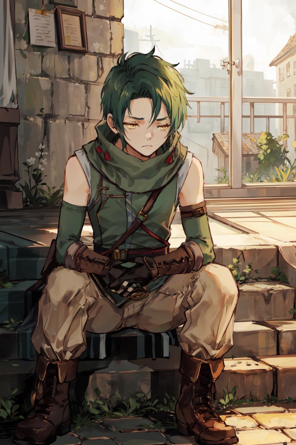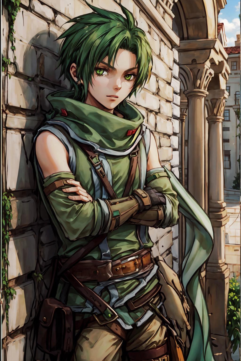 This is Sothe's Path of Radiance design, not his Radiant Dawn one. But since his clothes in both games are pretty much the same, you can prompt midriff and get something that looks very similar to RD Sothe. That said, his PoR design is cooler and I will DIE ON THAT HILL.............. fite me.