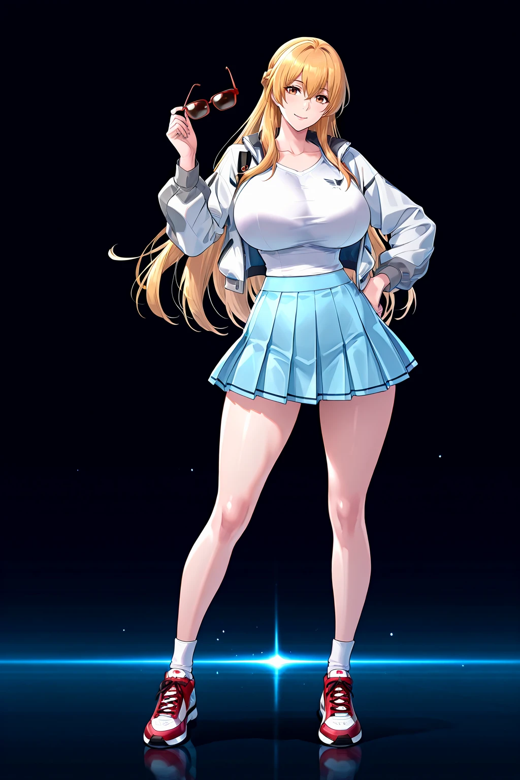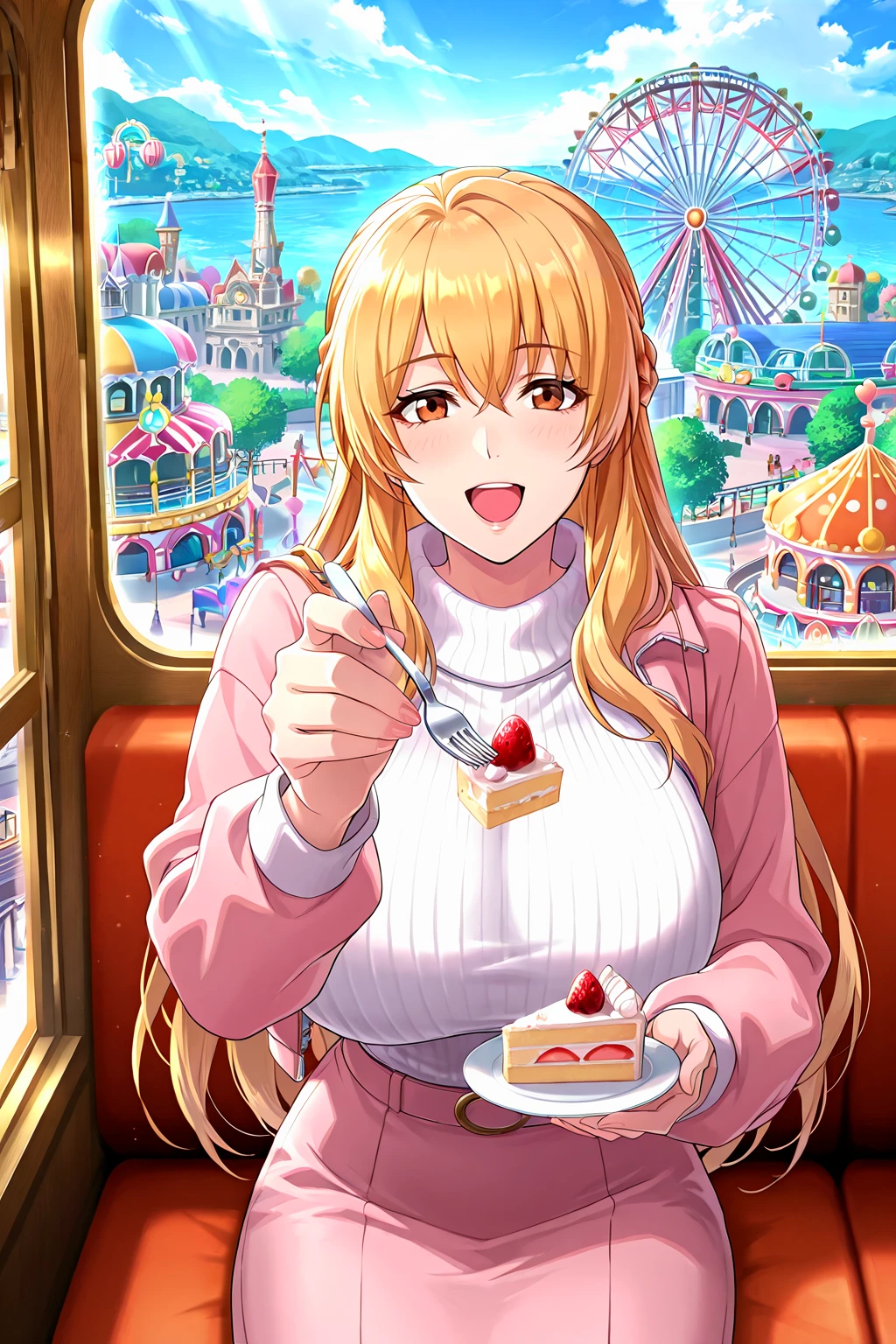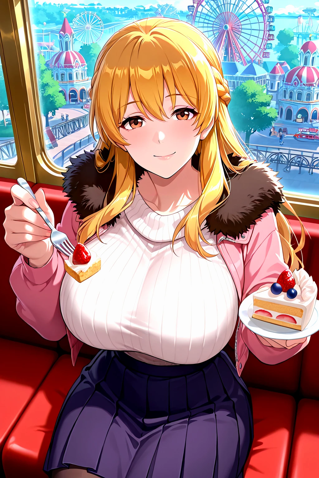sumucheng, brown eyes, long hair, blonde hair, french braid, pink jacket, fur trim, white sweater