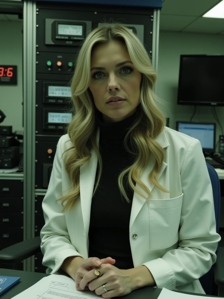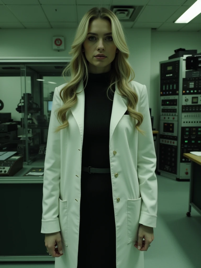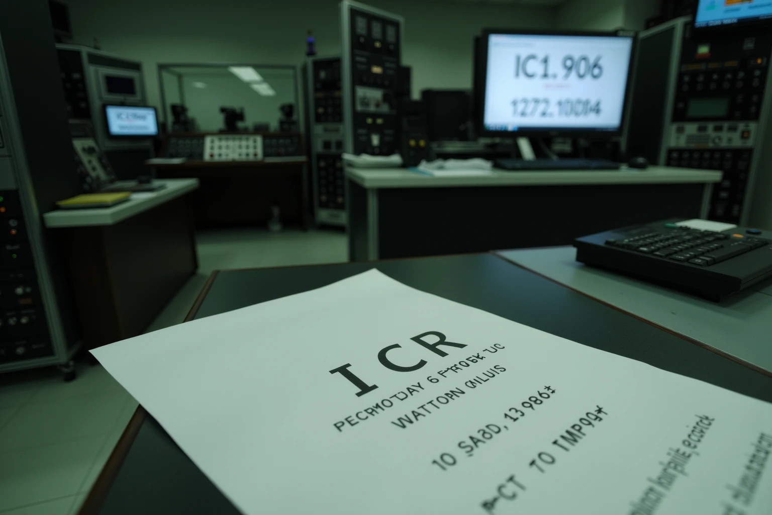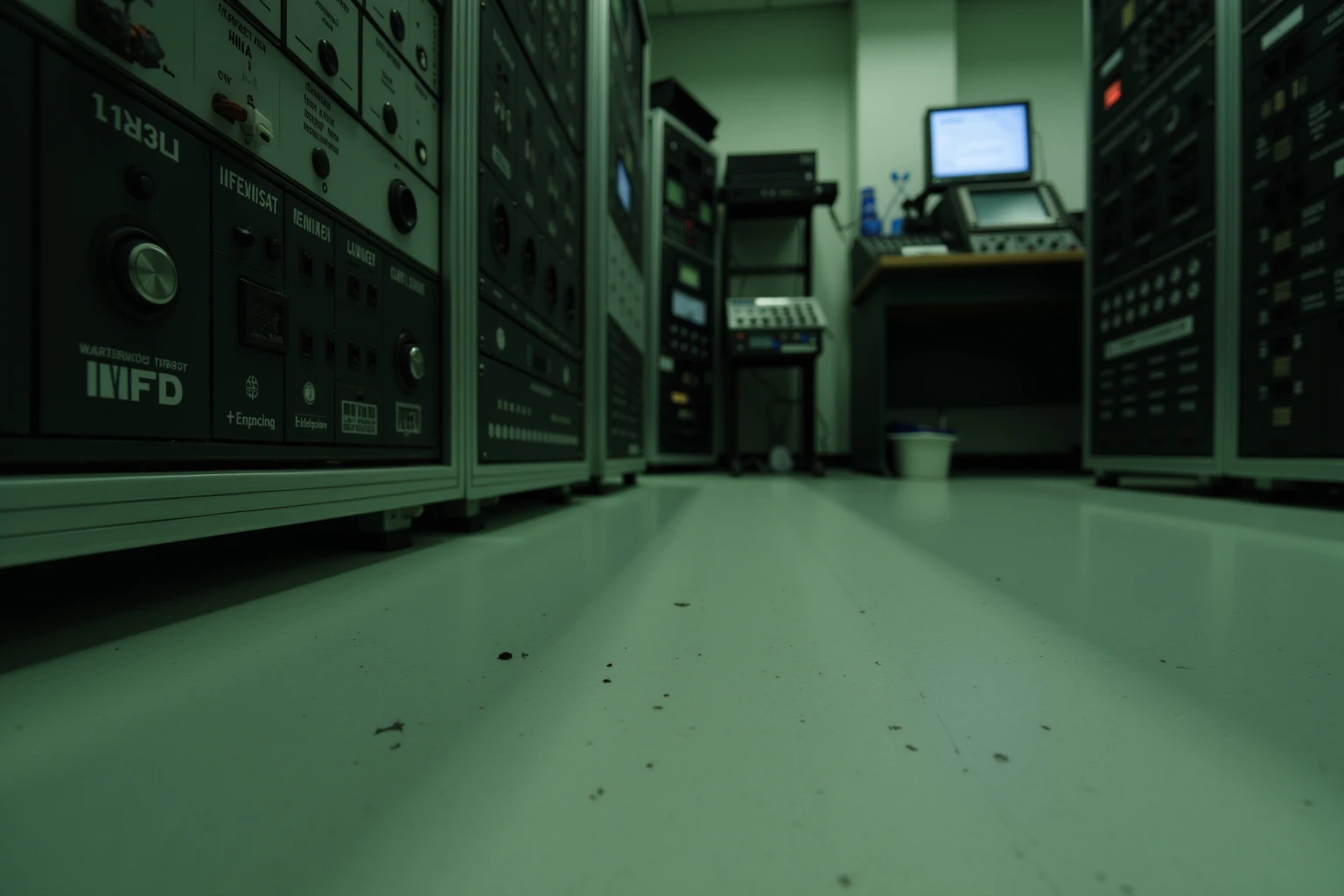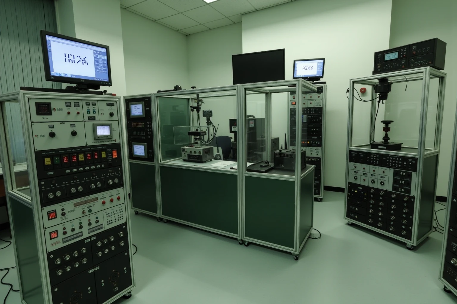 Industrial Control Room, a meticulously organized retro-futuristic laboratory rendered in a realistic cinematic style, defined by muted green and gray tones and a sterile, functional atmosphere. A large rectangular wooden desk anchors the center of the room, covered with analog control panels, stacked books, scattered documentation, and intertwined cables running across a pale tiled floor. Above the desk, three stacked CRT monitors glow softly, displaying robotic arm diagnostics and test imagery. Tall metal control panel both sides, filled with oscilloscopes, dials, switches, reel-to-reel units, and illuminated indicator lights. Fluorescent ceiling panels cast cool, diffused overhead lighting, producing soft reflections on metal surfaces and glass. In the background is a testing facility, which is a clear glass chamber containing an articulated industrial robotic arm engaged in precise mechanical operations. The environment feels serious, technical, and purpose-built, emphasizing interconnected systems, symmetry, depth, and engineered precision.