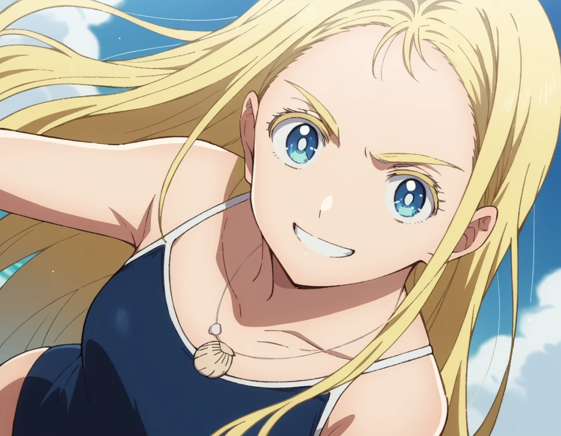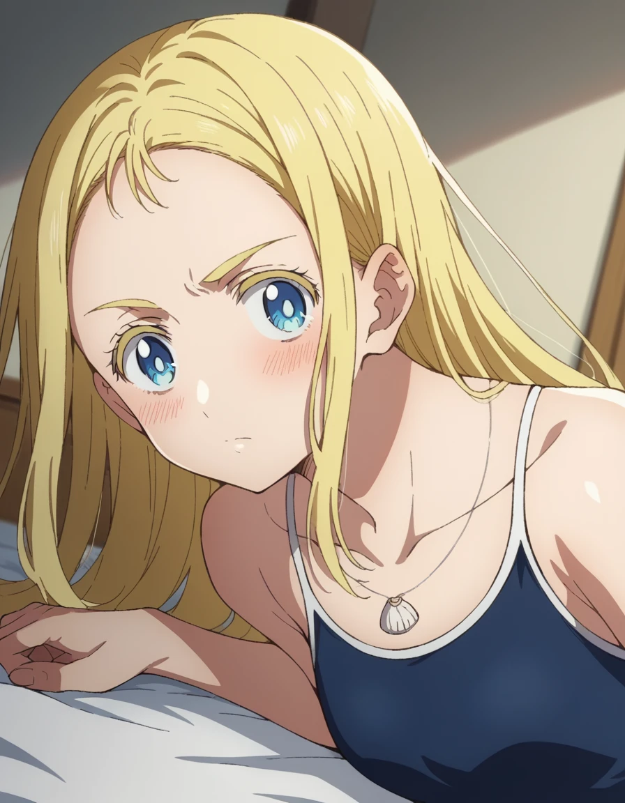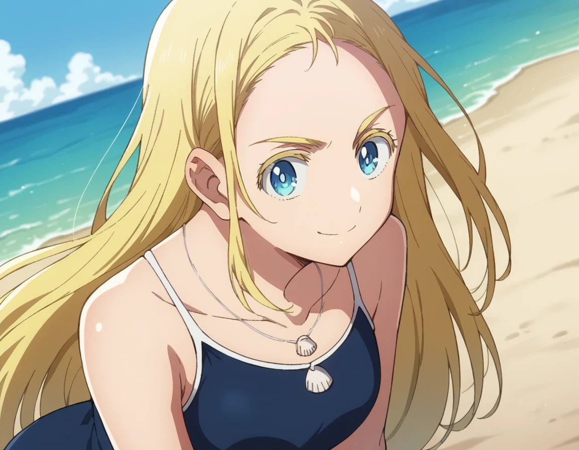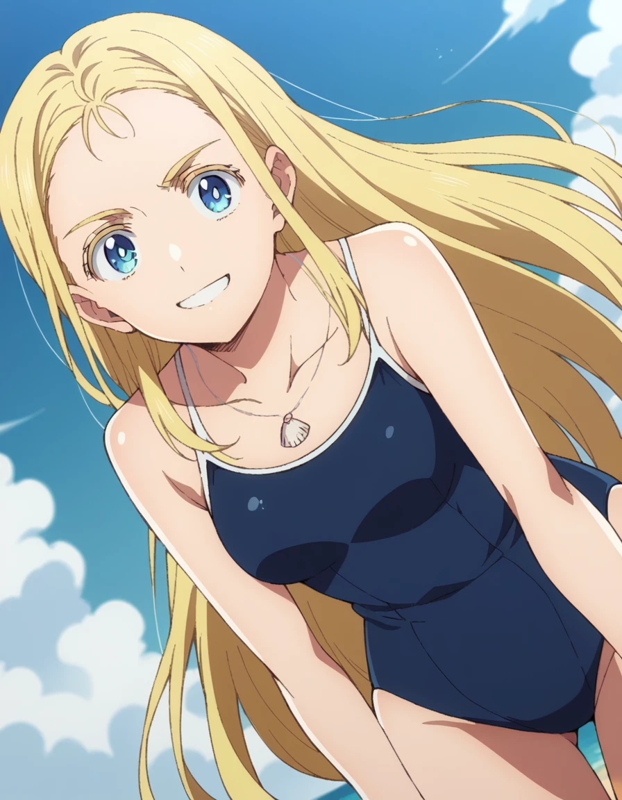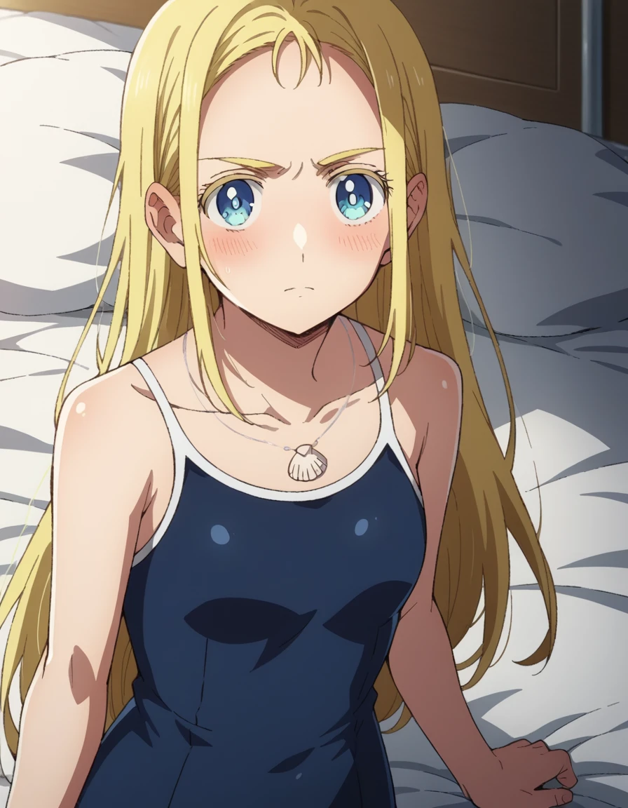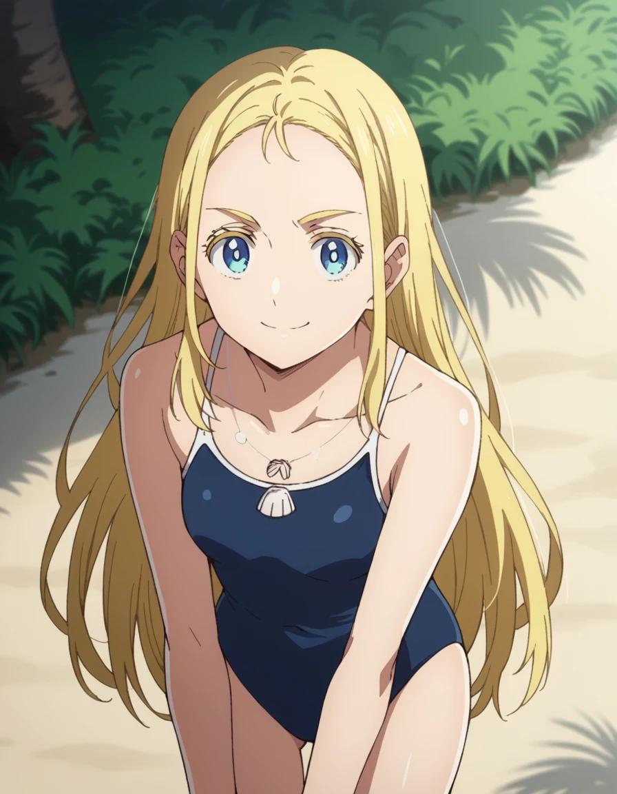 jewelry, collarbone, swimsuit, necklace, one-piece swimsuit, school swimsuit, blue one-piece swimsuit, competition school swimsuit, shell necklace,