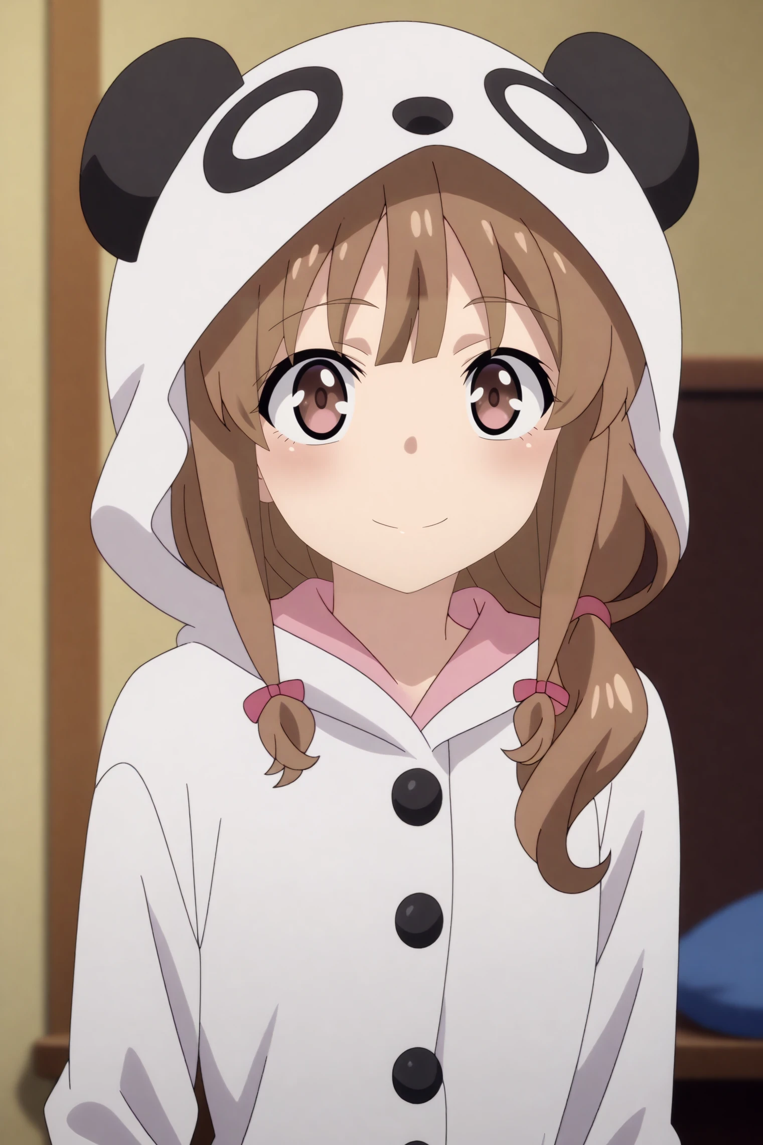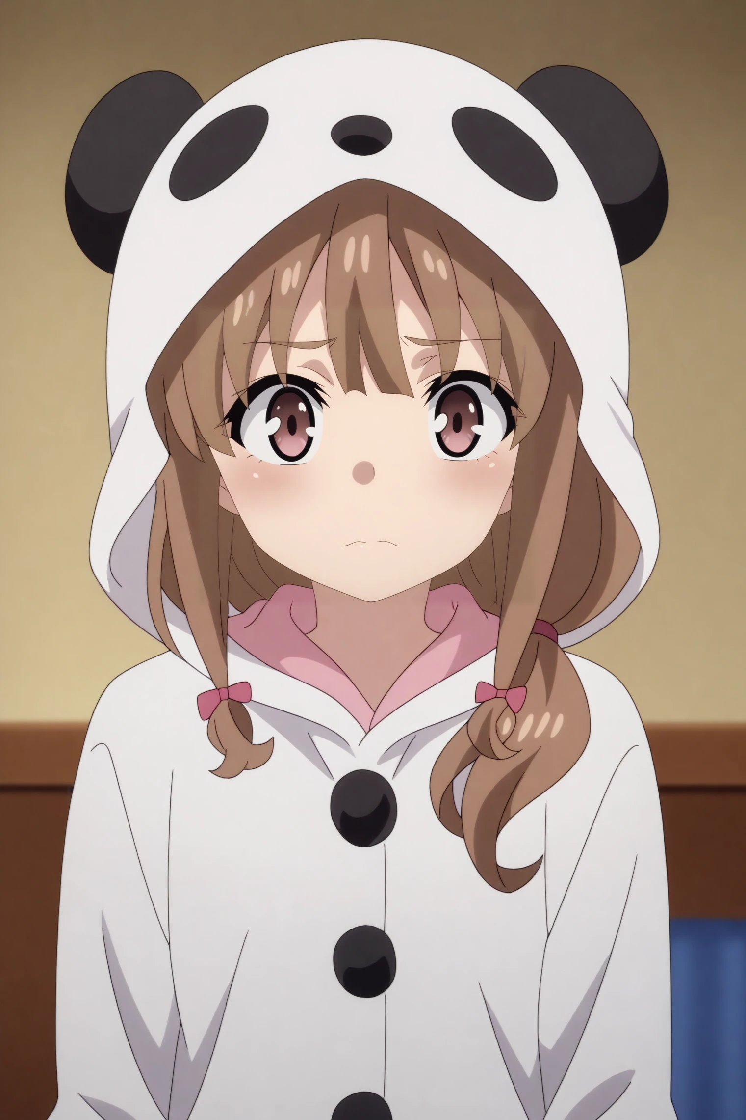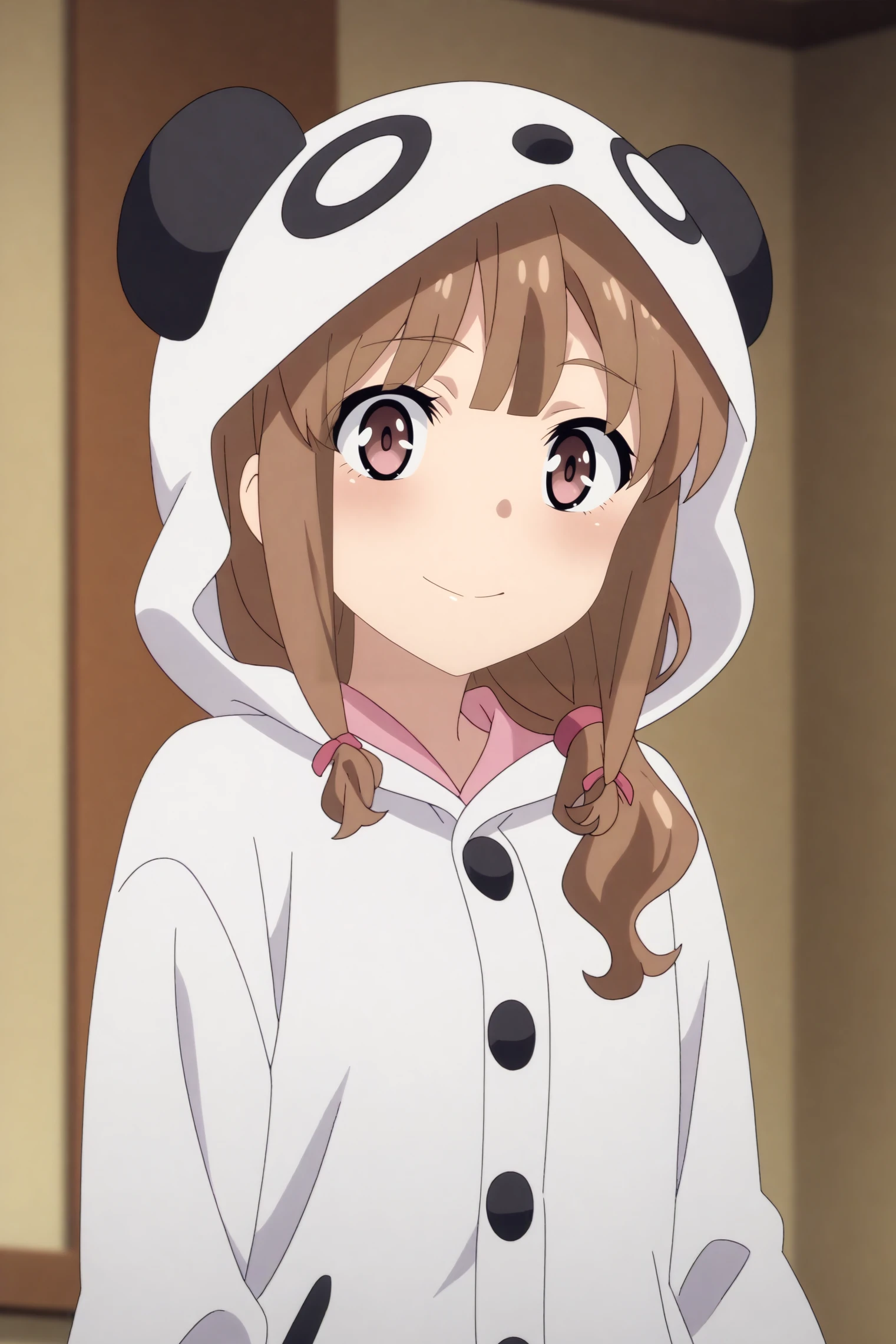 kaede azusagawa,1girl,solo,bangs,animal hood,panda print hood,hood,long hair,pajamas,twintails,animal costume