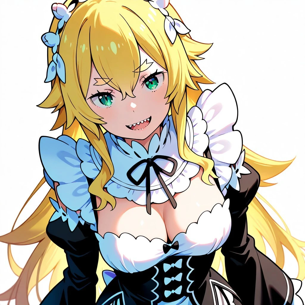 mature female,long hair,blonde hair,hair between eyes,green eyes,sharp teeth,medium breasts,