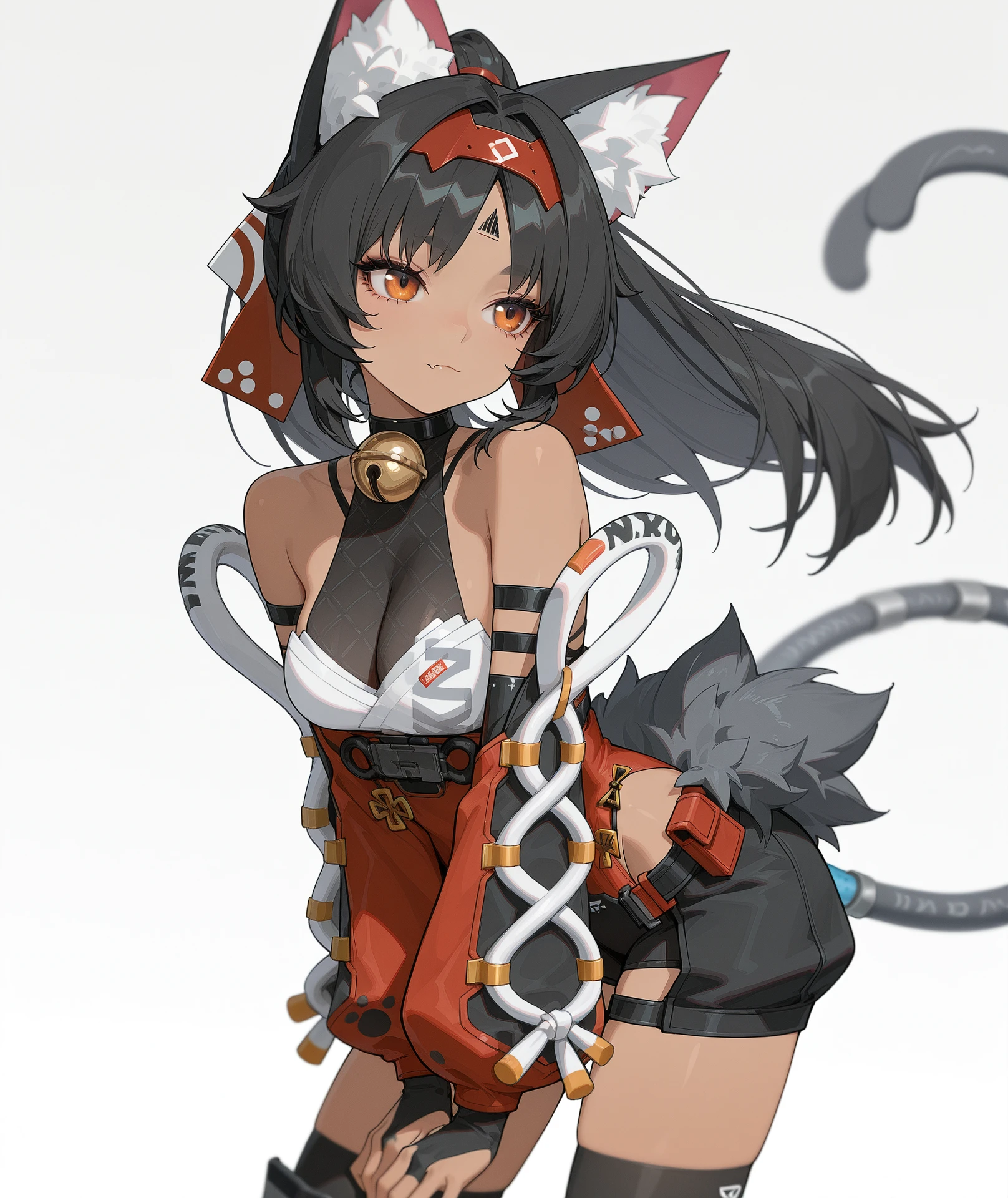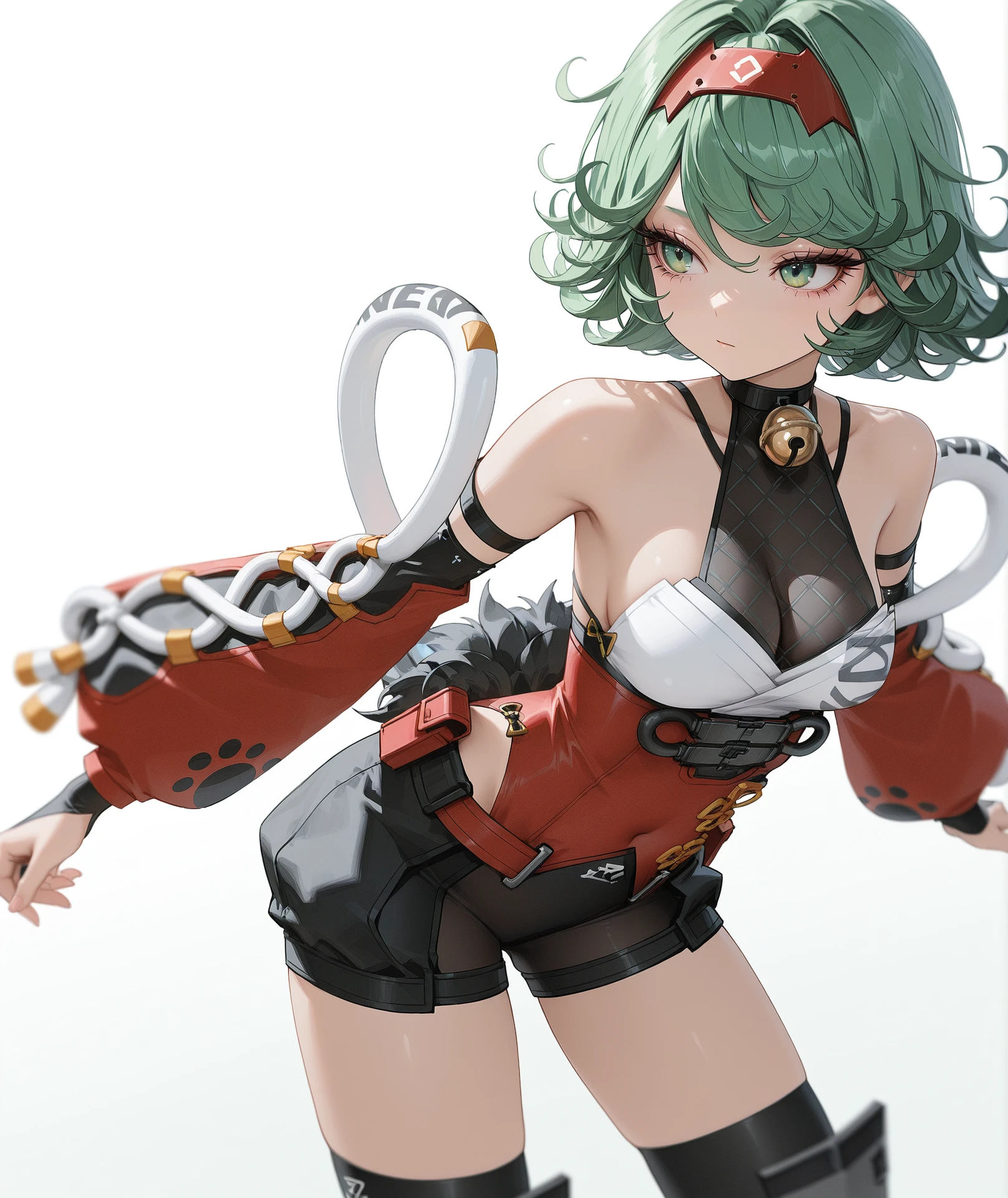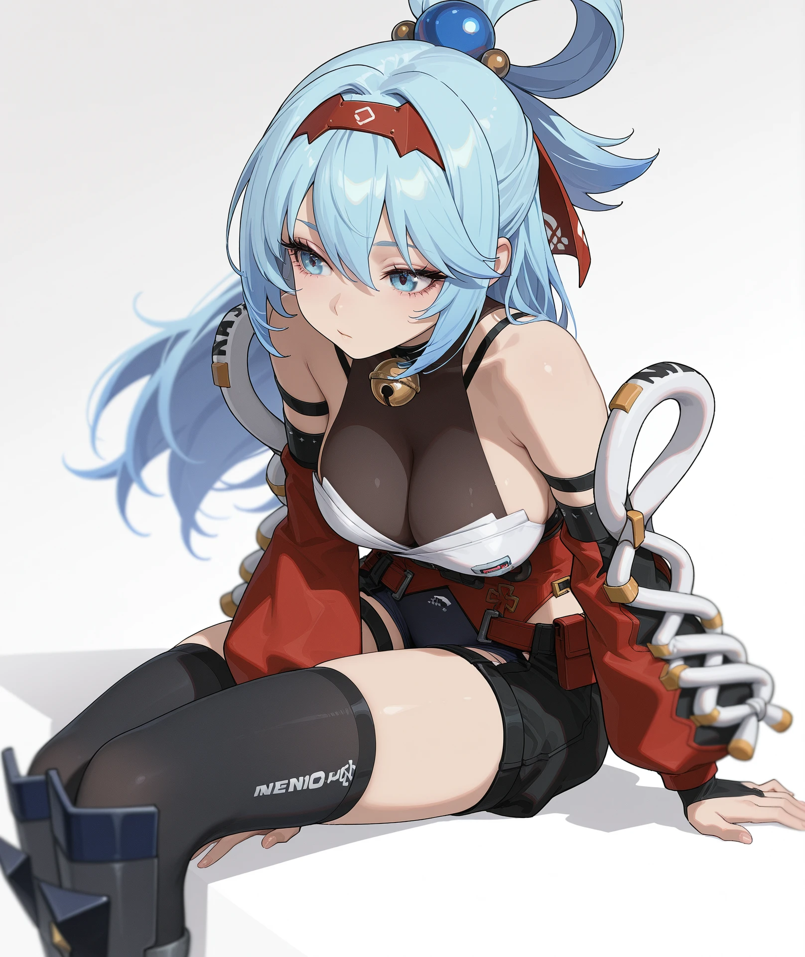 breasts, medium breasts, cleavage, bare shoulders, red hairband, hairband, gloves, elbow gloves, fingerless gloves, detached sleeves, collar, bell, bodysuit, red dress, bridal gauntlets, jingle bell, neck bell, ninja, black collar, red sleeves,