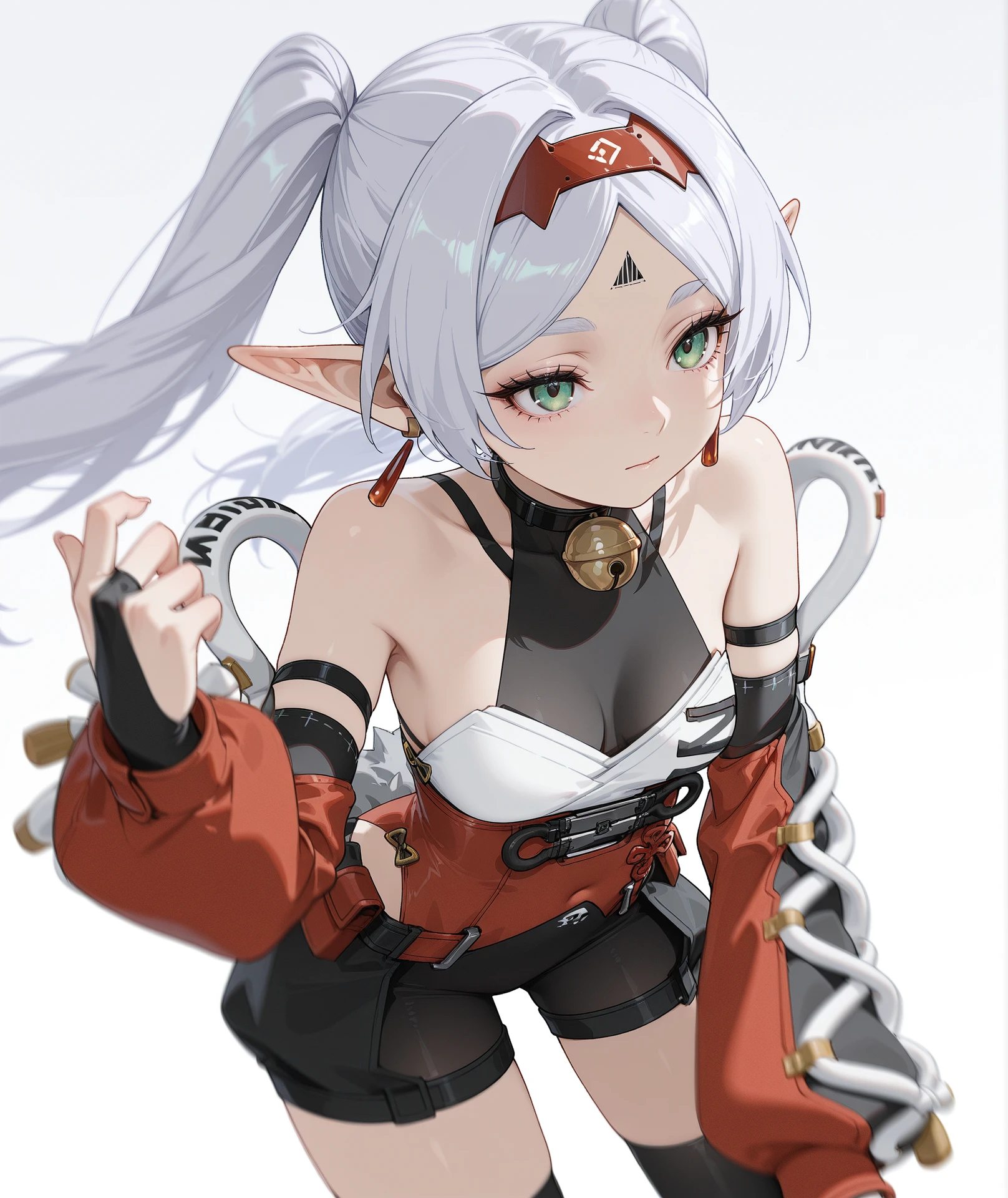 red hairband, hairband, gloves, elbow gloves, fingerless gloves, detached sleeves, collar, bell, bodysuit, red dress, bridal gauntlets, jingle bell, neck bell, ninja, black collar, red sleeves,