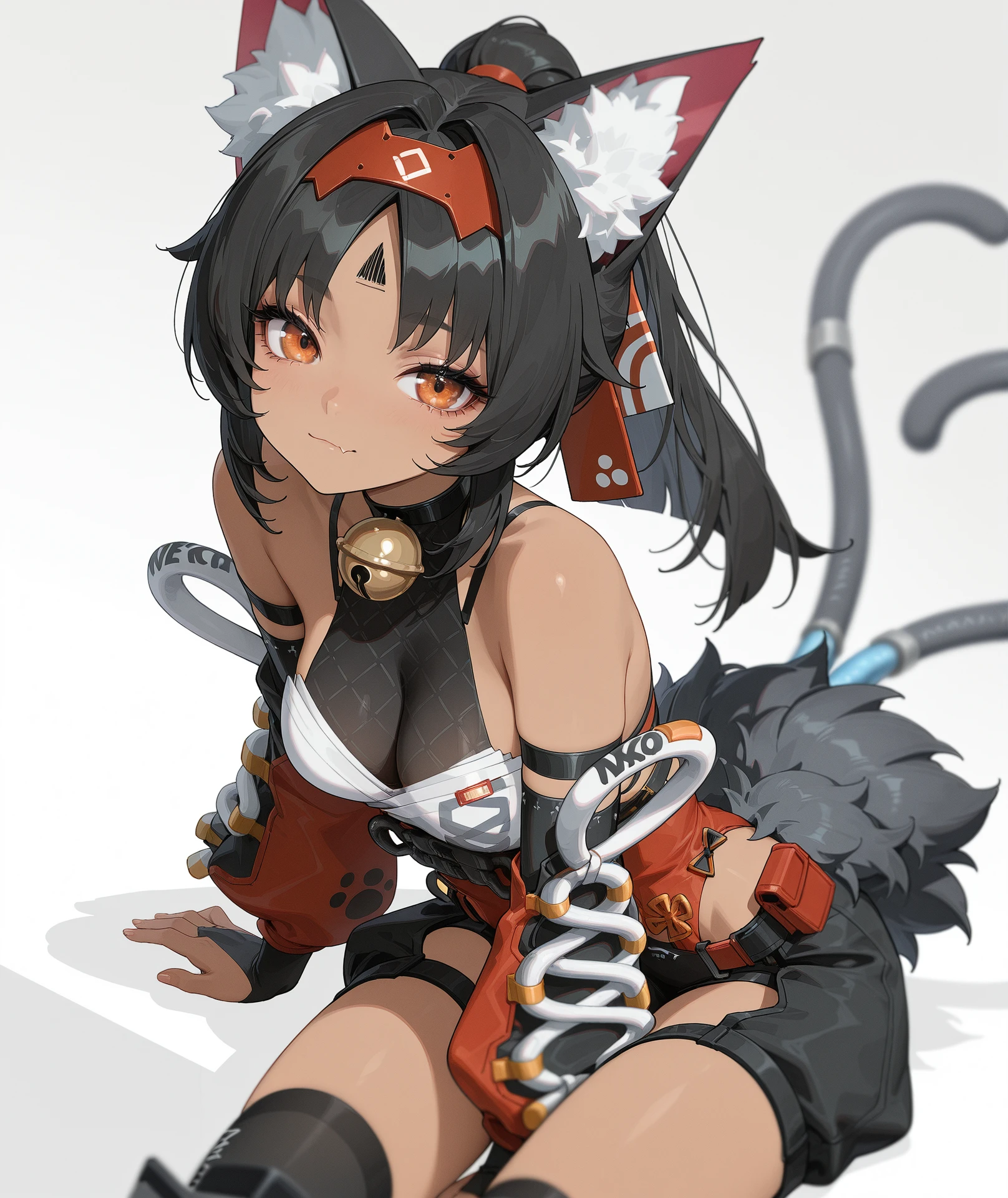 eyelashes, nose, long hair, bangs, black hair, animal ears, brown eyes, very long hair, tail, ponytail, fang, cat ears, cat tail, two tails, orange eyes, animal ear fluff, dark skin, dark-skinned female, facial mark, cat girl, multiple tails, skin fang, fang out, forehead mark,