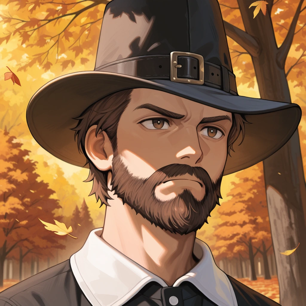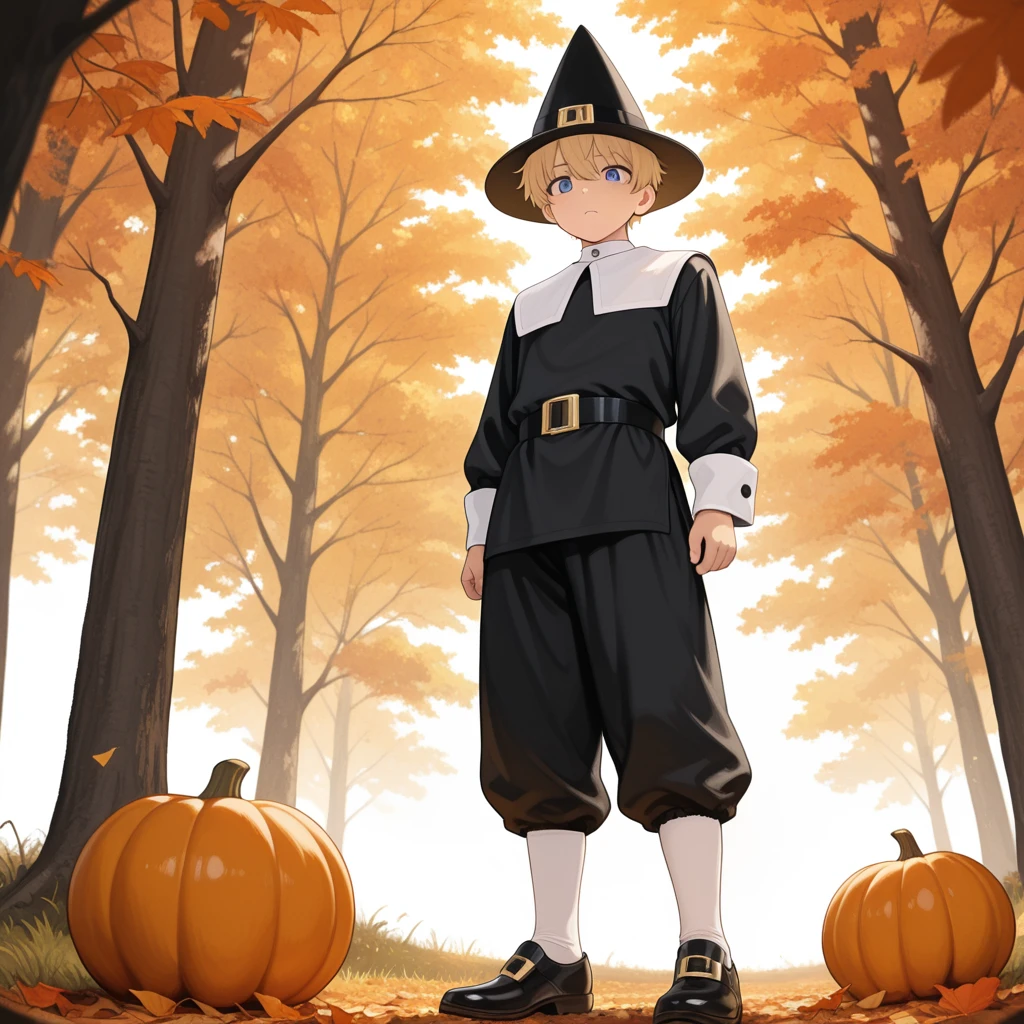 pilgrim hat,buckle on hat,black shirt,white collar,white cuffs,black belt,gold buckle,black pants,baggy pants,white kneehighs,black shoes,monk shoes