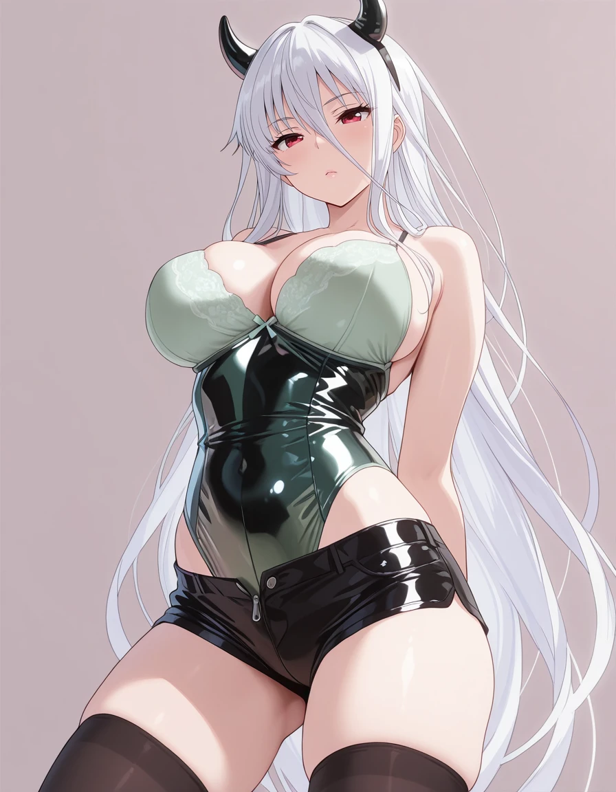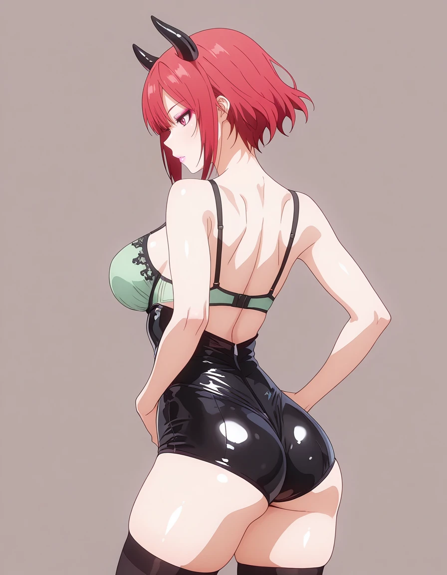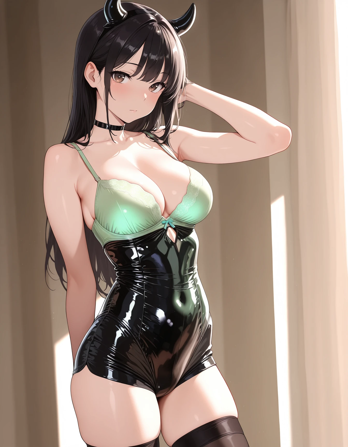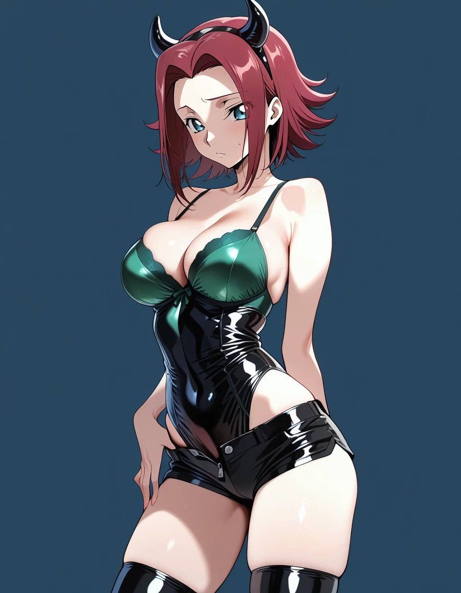 mai_latex_leotard,fake_horns,green_bra,black_shorts,thighhighs,bare_shoulders