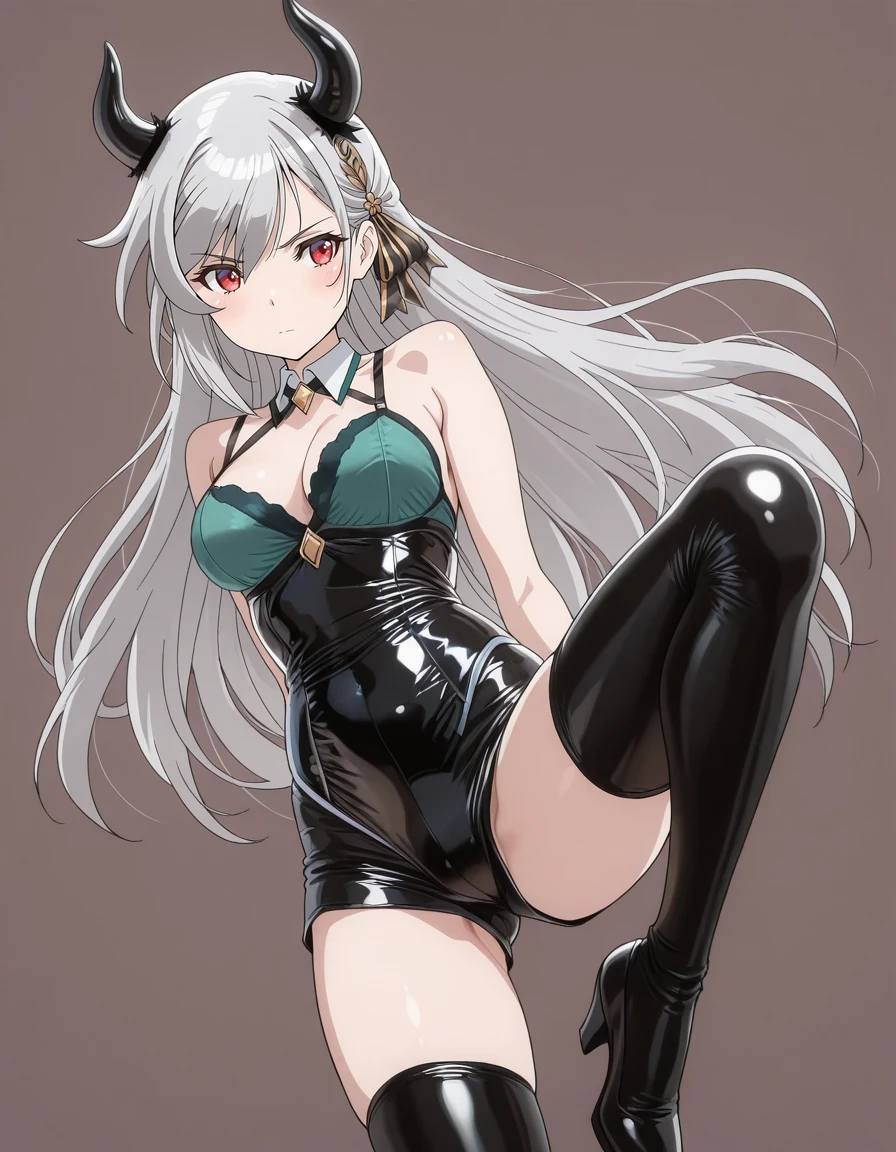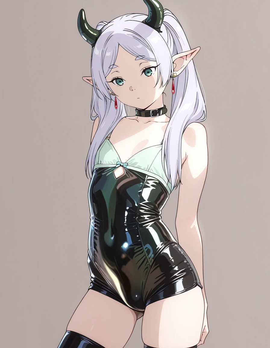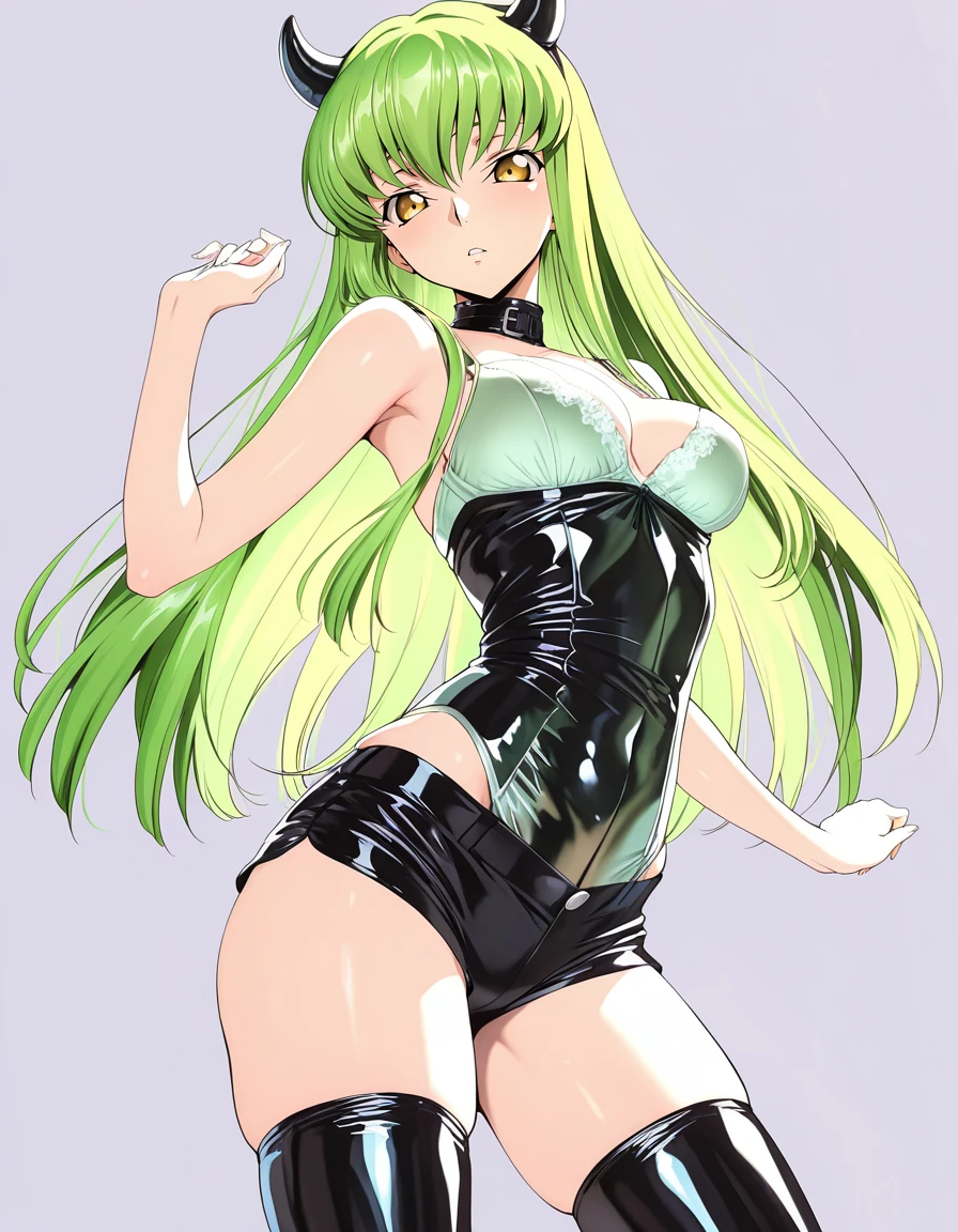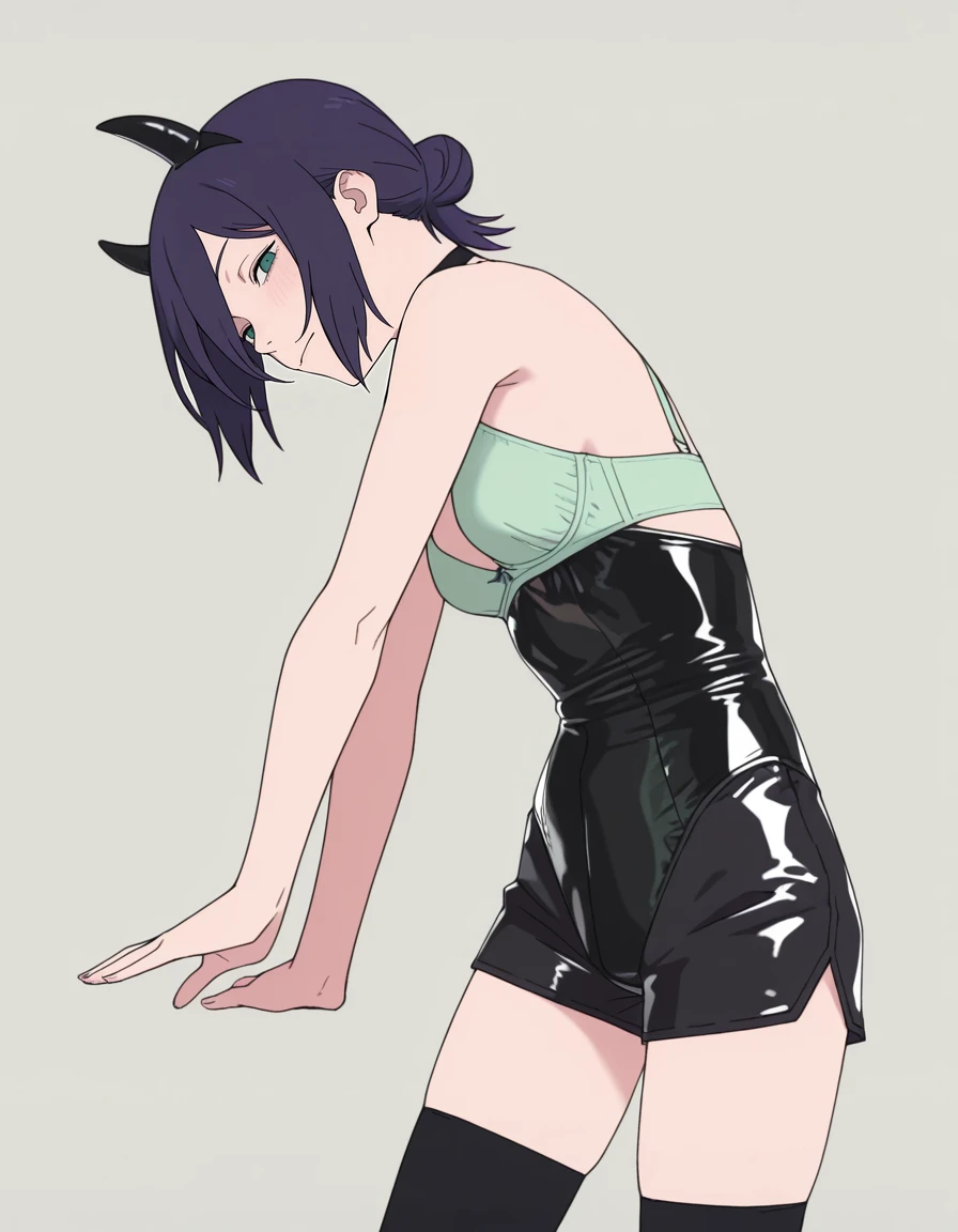 mai_latex_leotard,fake_horns,green_bra,black_shorts,thighhighs,bare_shoulders