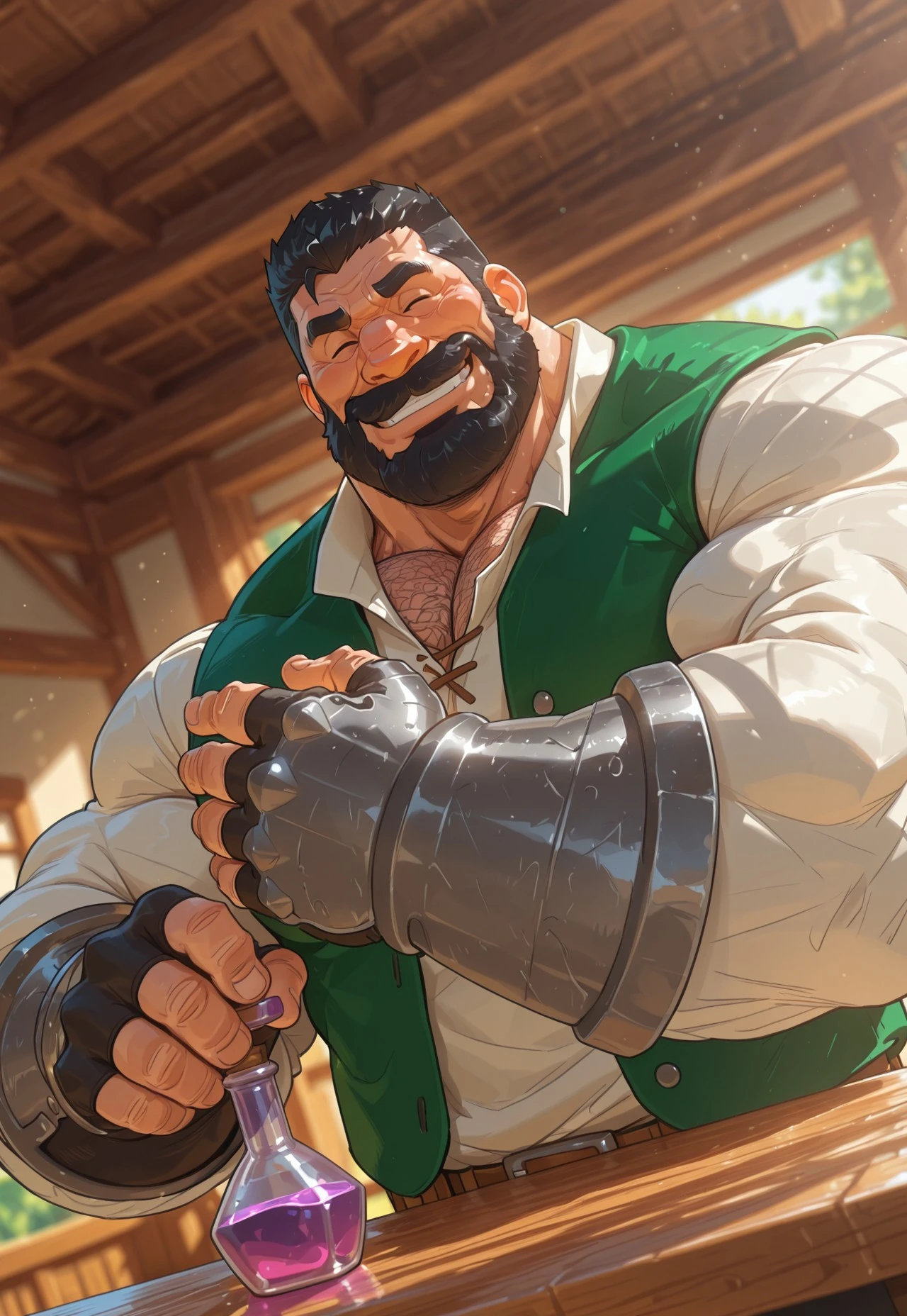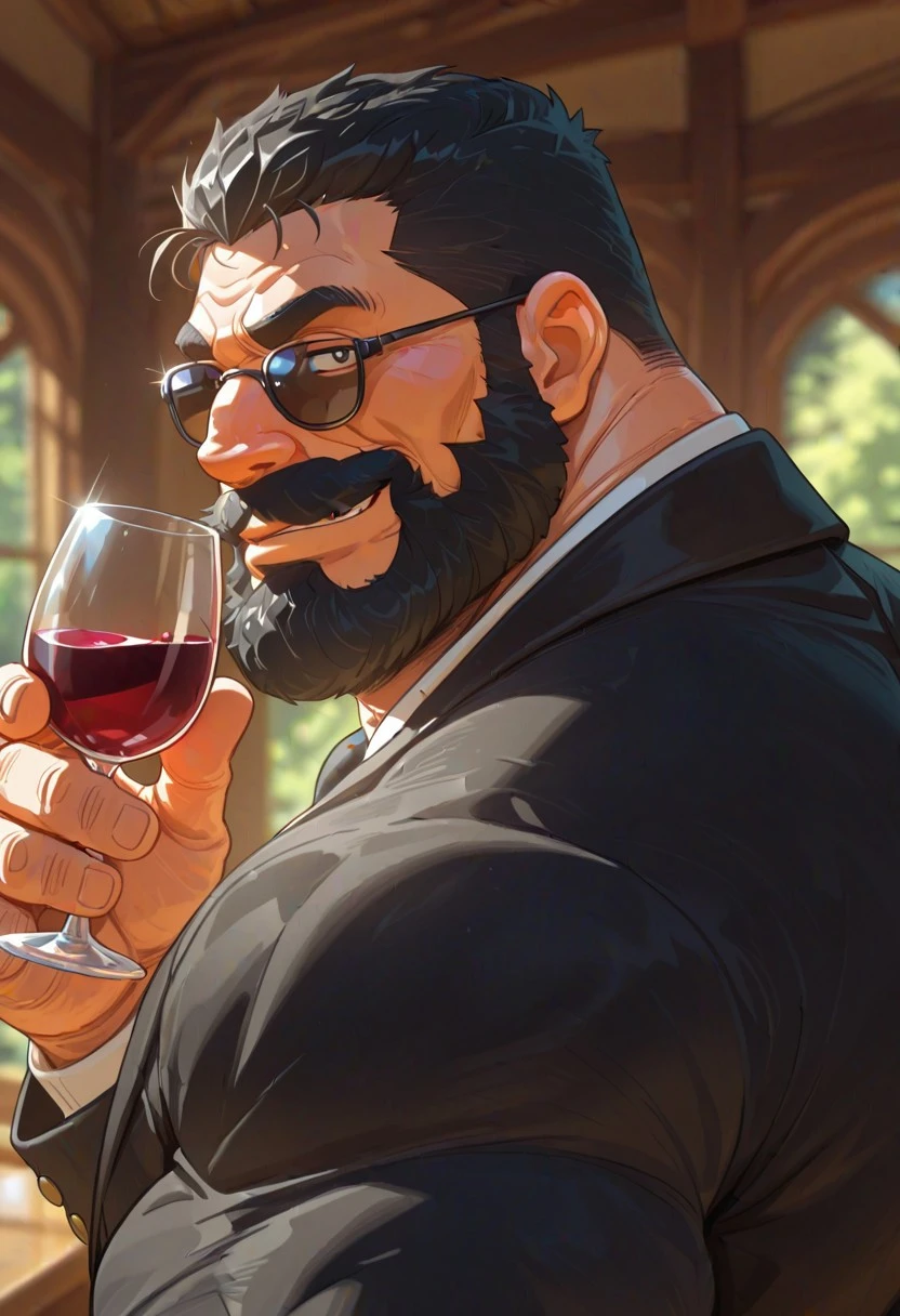 1boy, solo, Bernard, human, close up, side angle, smirk, looking at viewer, large muscles, hairy, black hair, beard, short hair, thick eye brows