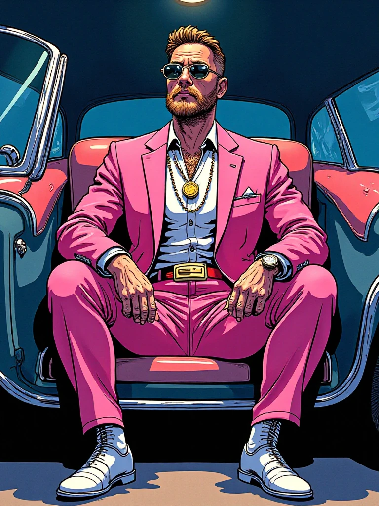 5. Moebius, a woman with long black hair and tattoos sits on a box