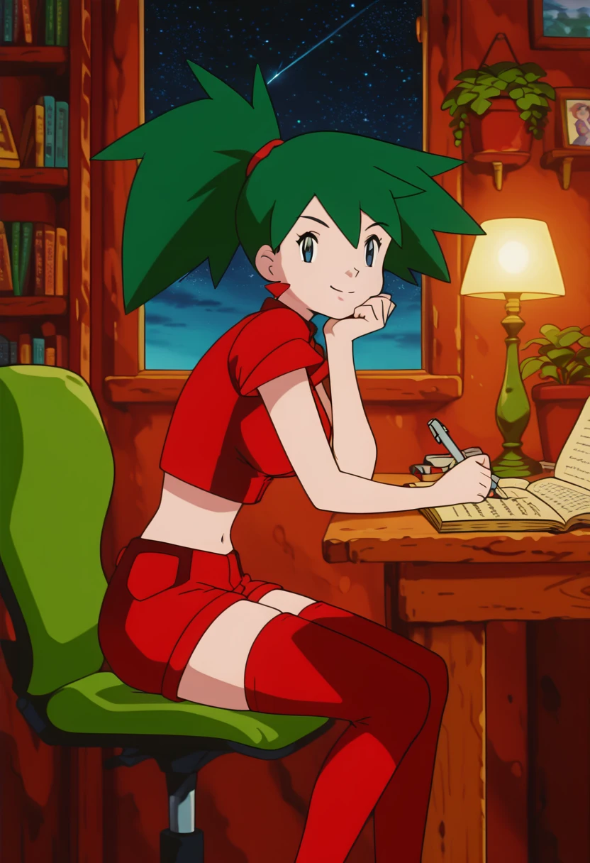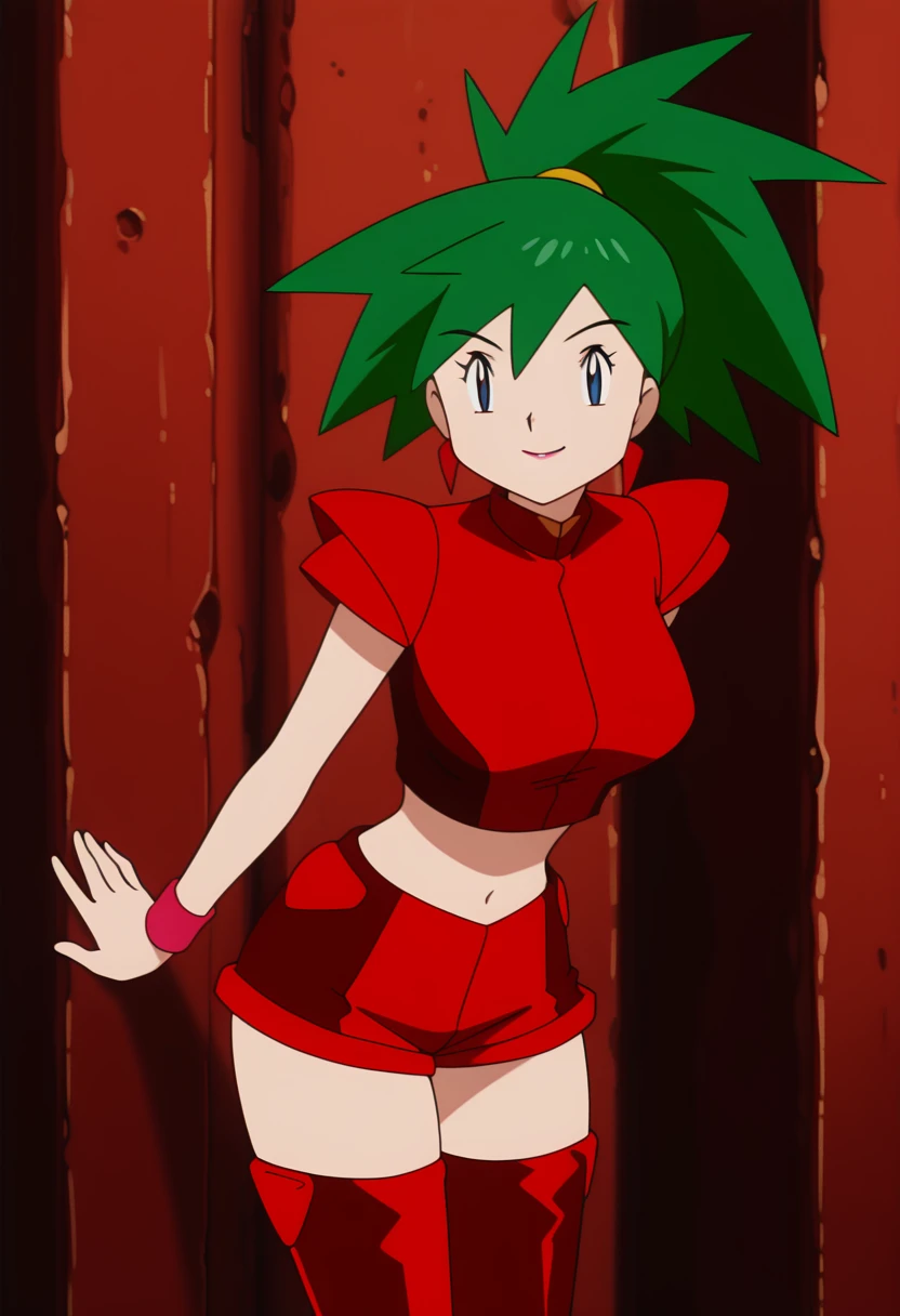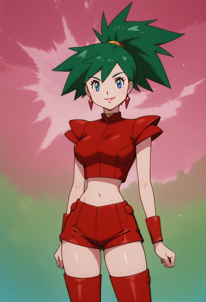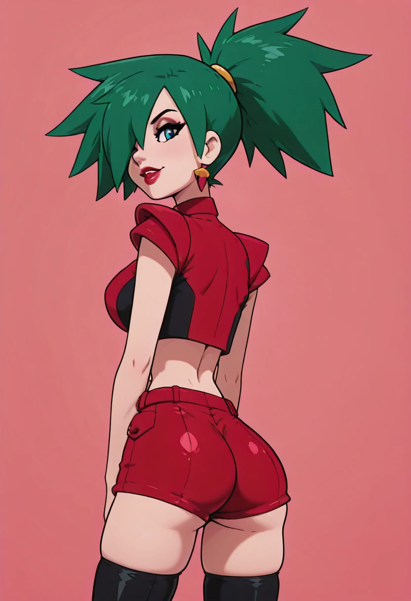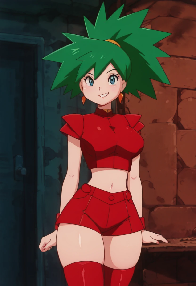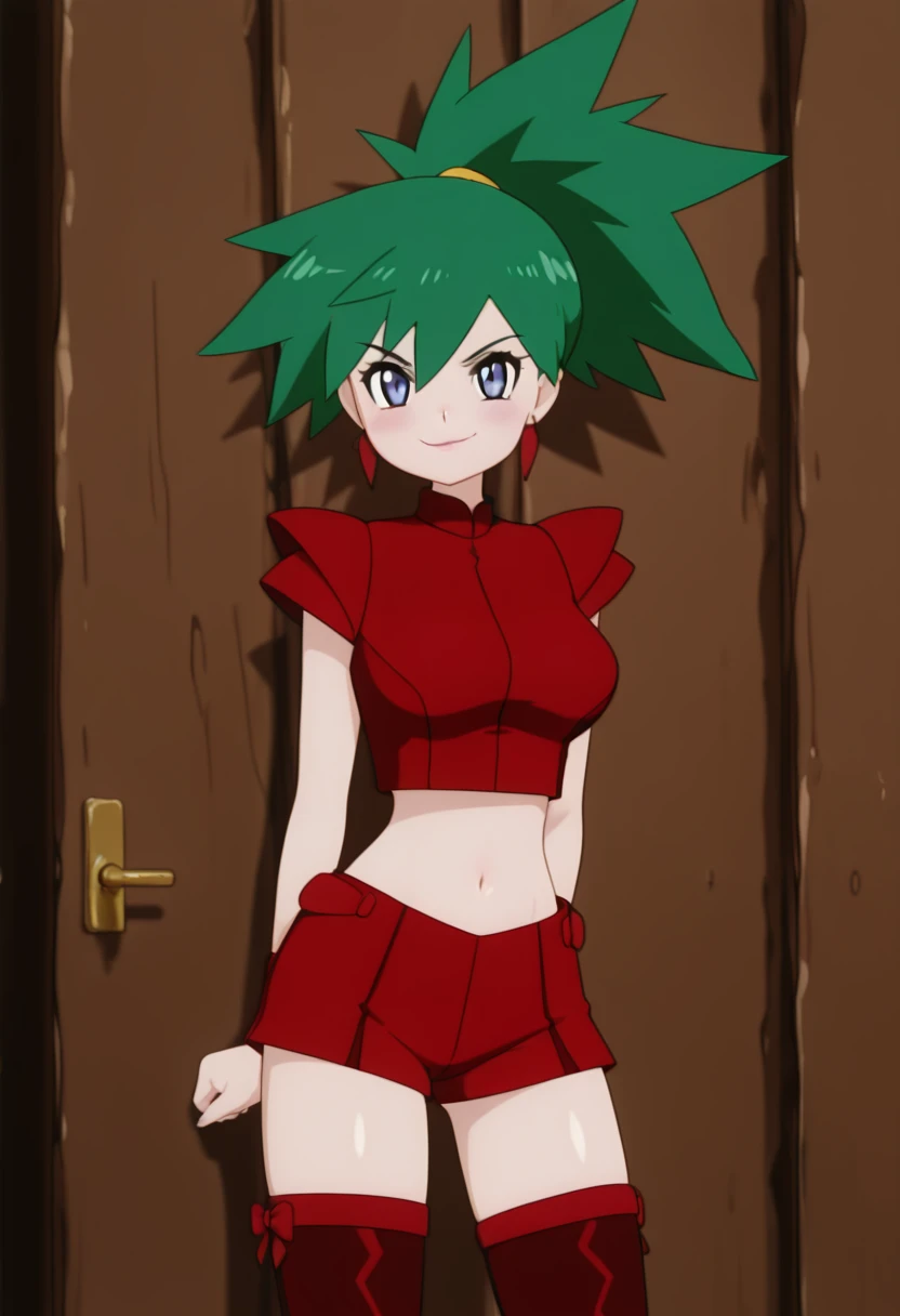 zzLiza, blue eyes, spiked hair, green hair, ponytail, crop top, midriff, navel, short, thighhighs,