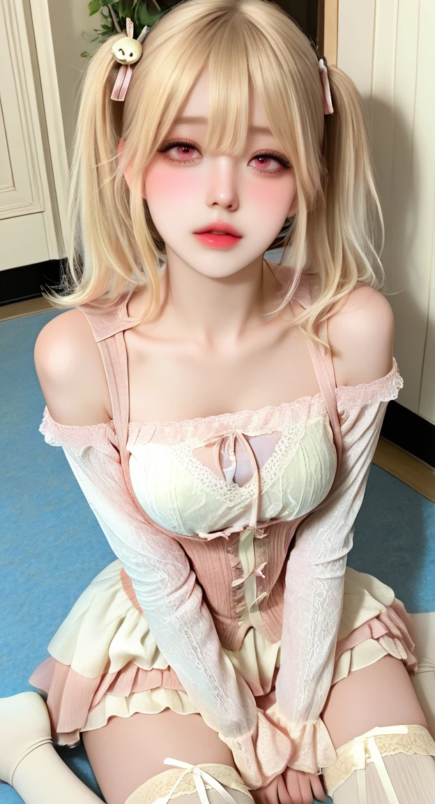 xg1,zettai ryouiki, blush pink satin corset babydoll lingerie dress, long white lace bell sleeves with layered ruffle cuffs, white lace garter straps and white thigh-high stockings, multi-tiered white tulle skirt with pink lace accents