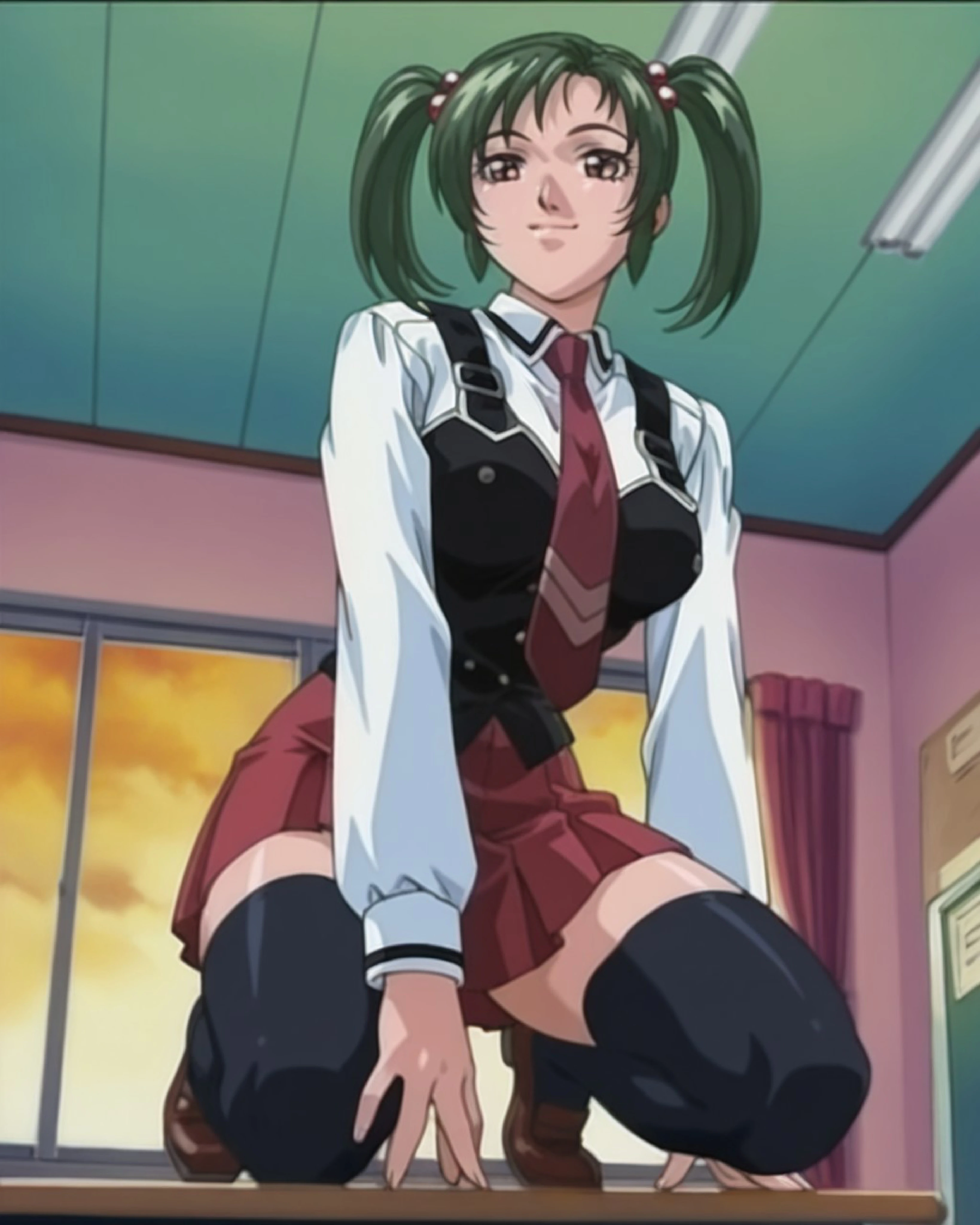 Rie Morita, rie_m, dark green hair, twintails, hair ornament, short hair, brown eyes, 1girl, solo, retro artstyle, 1990s (style)