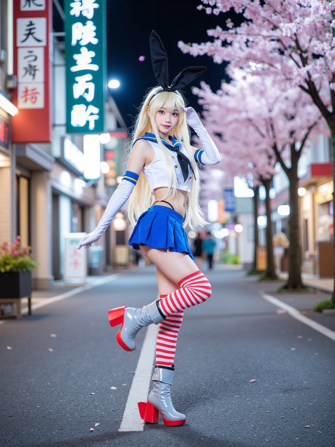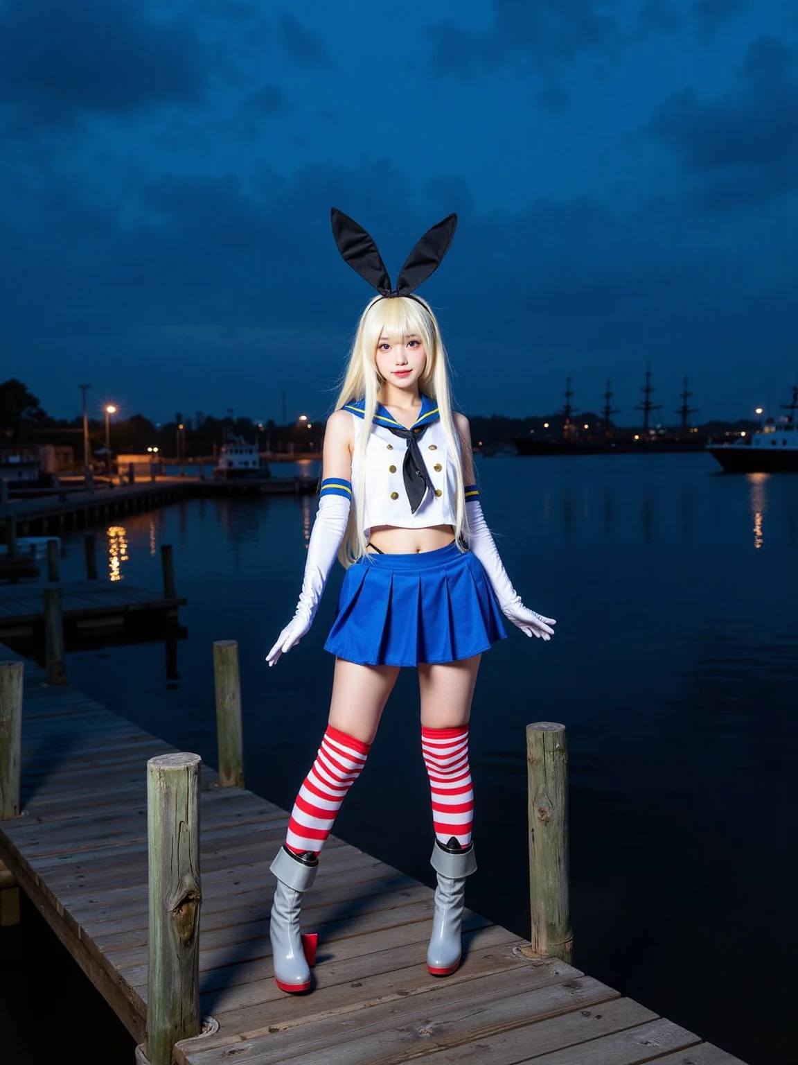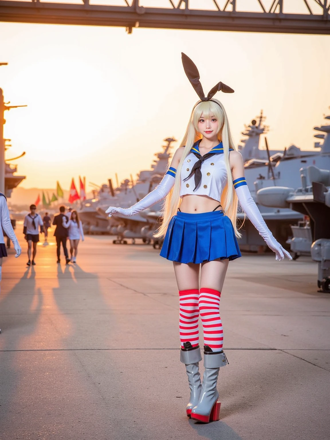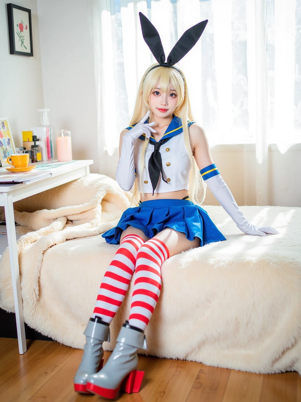 A realistic photo of a beautiful woman in cyb-shimakaze cosplay costume, include blue skirt and white shirt with blue collar and black neckrief. She is also wearing elbow gloves and white and red striped thighhighs and grey and red high heeled boots. She has long blonde hair with rabbit ears hairband.