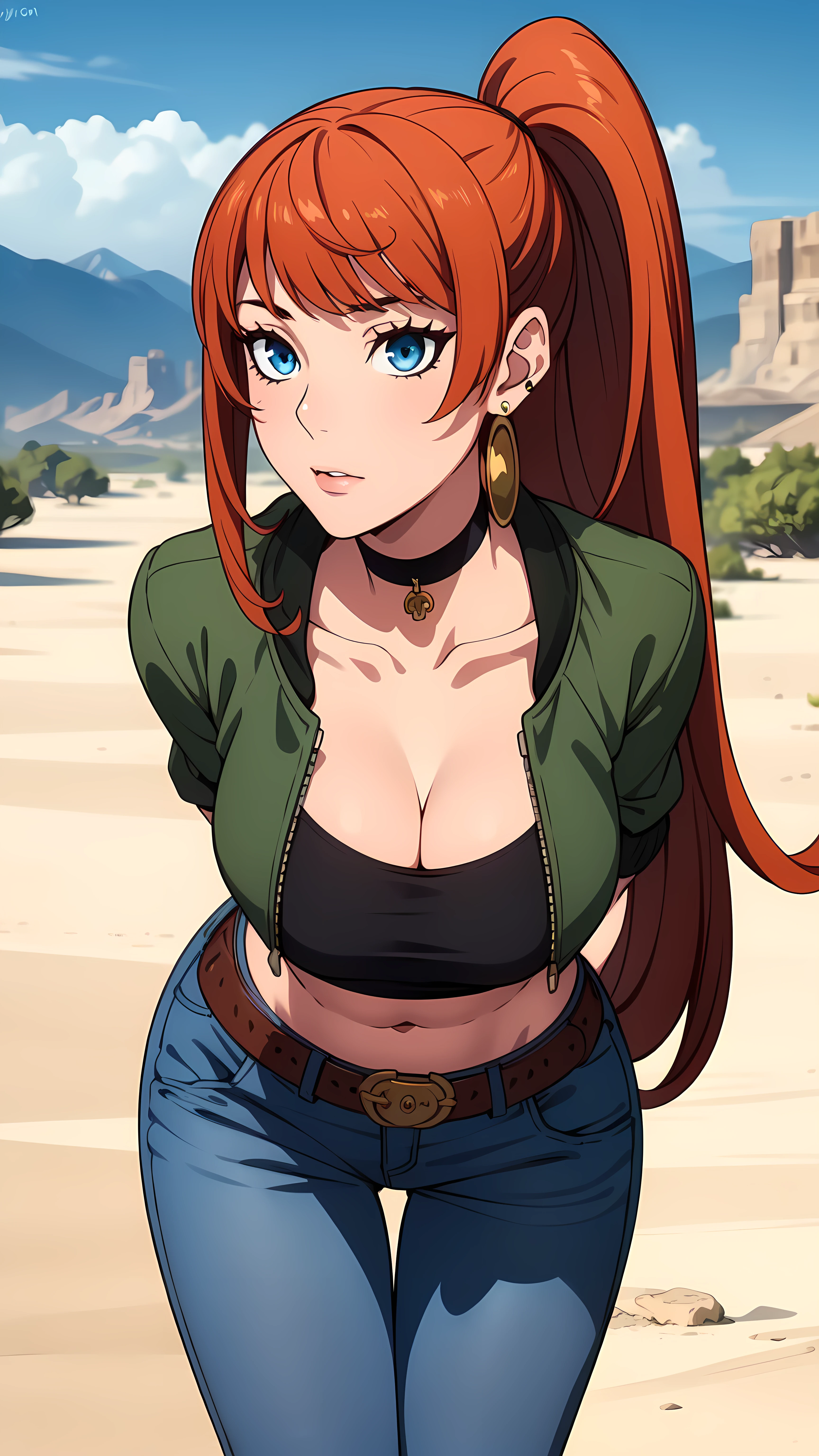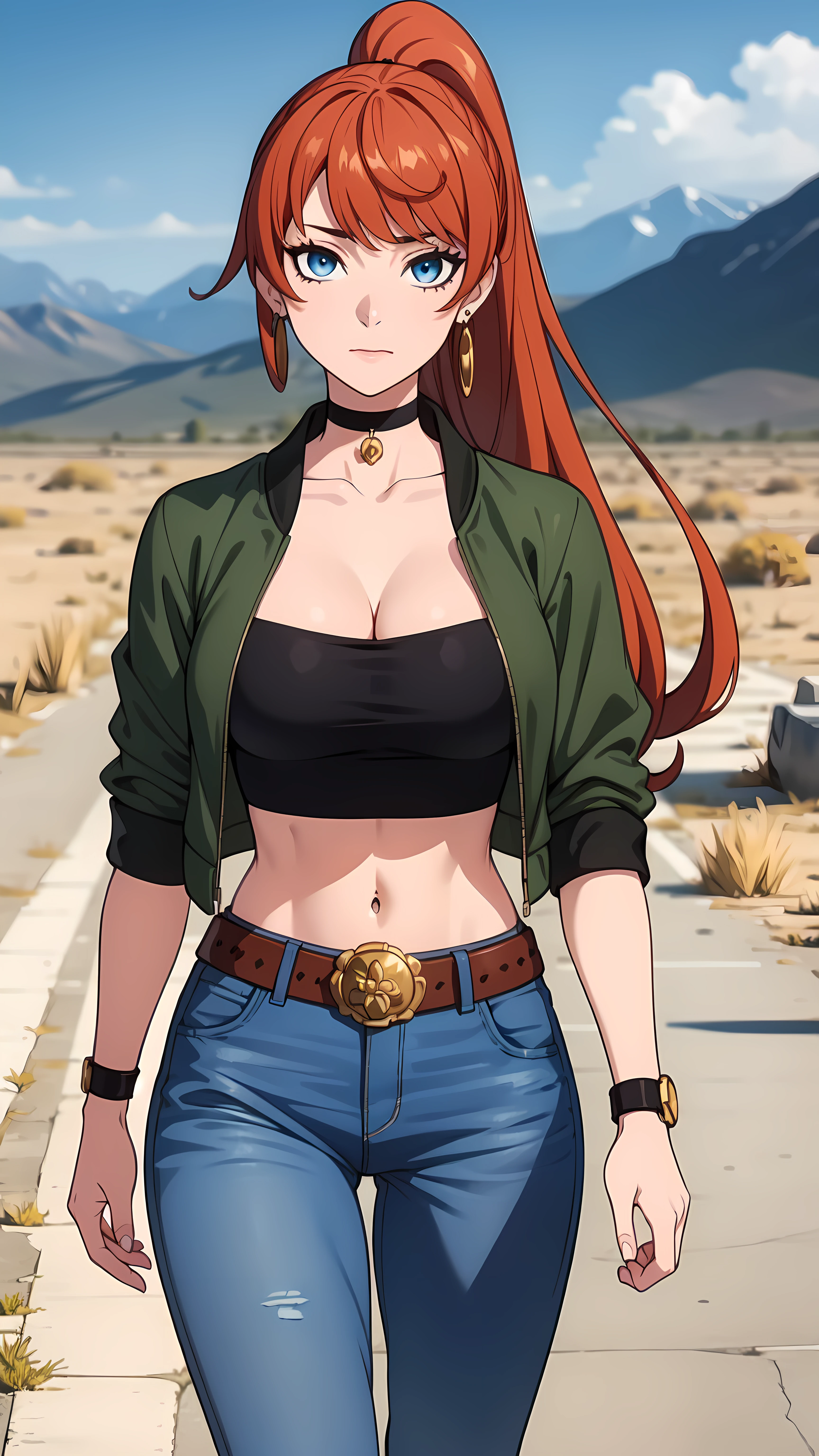 exposed midriff_blue eyes_very long hair_ponytail_(one earring_choker:1.3)
