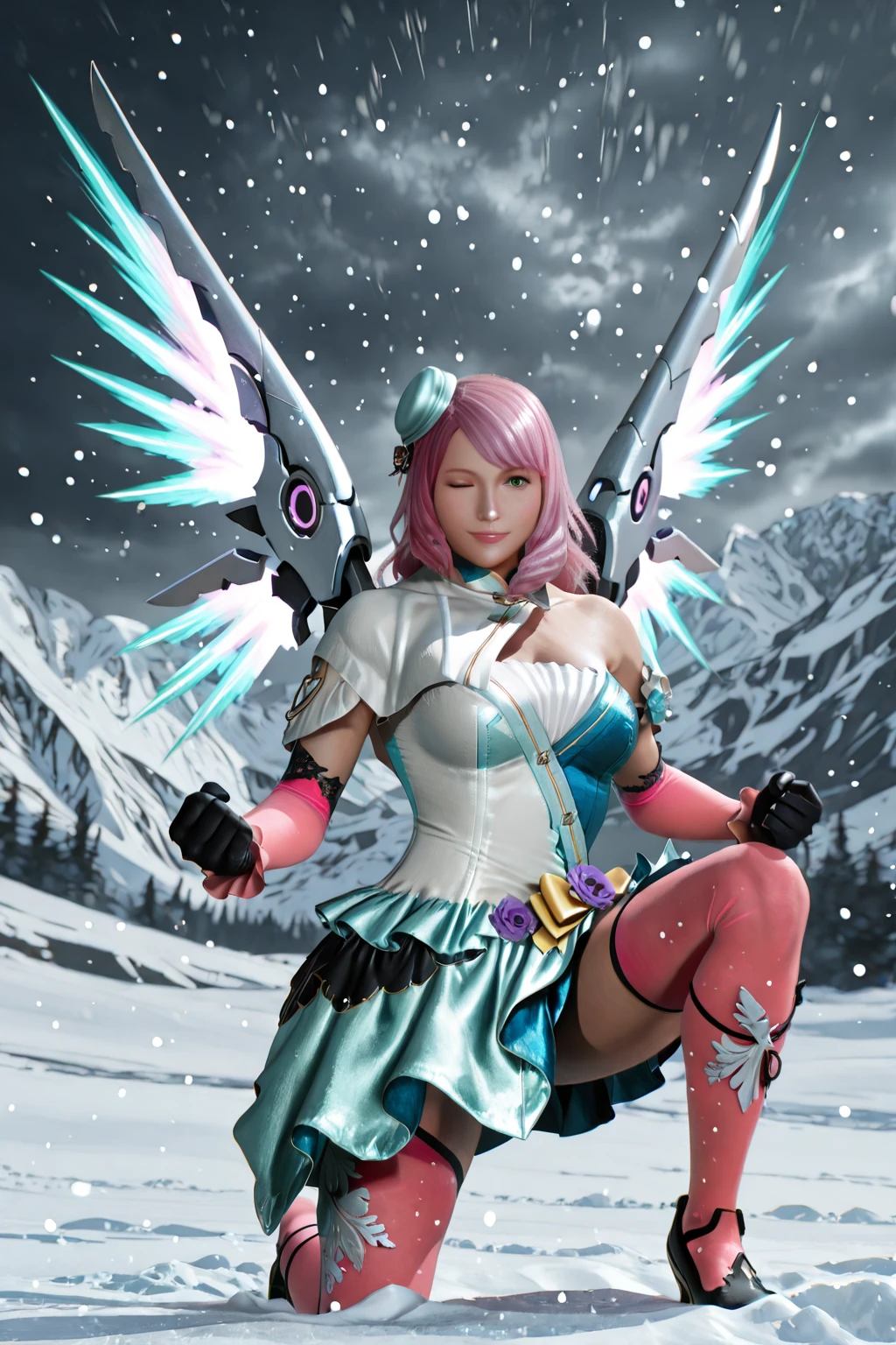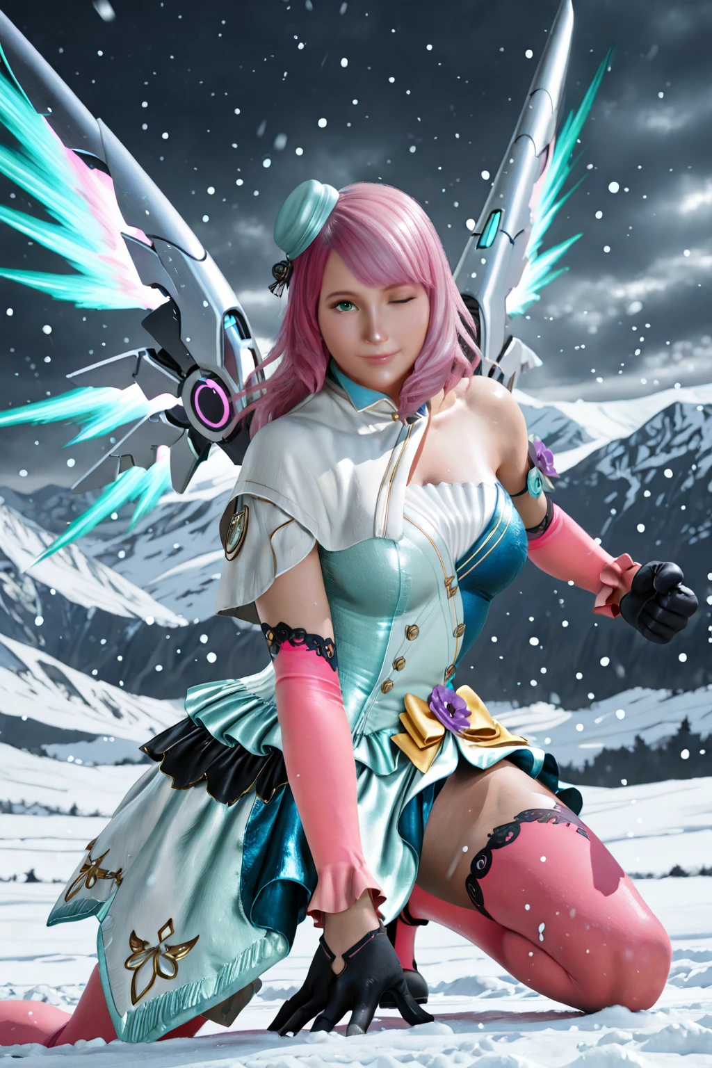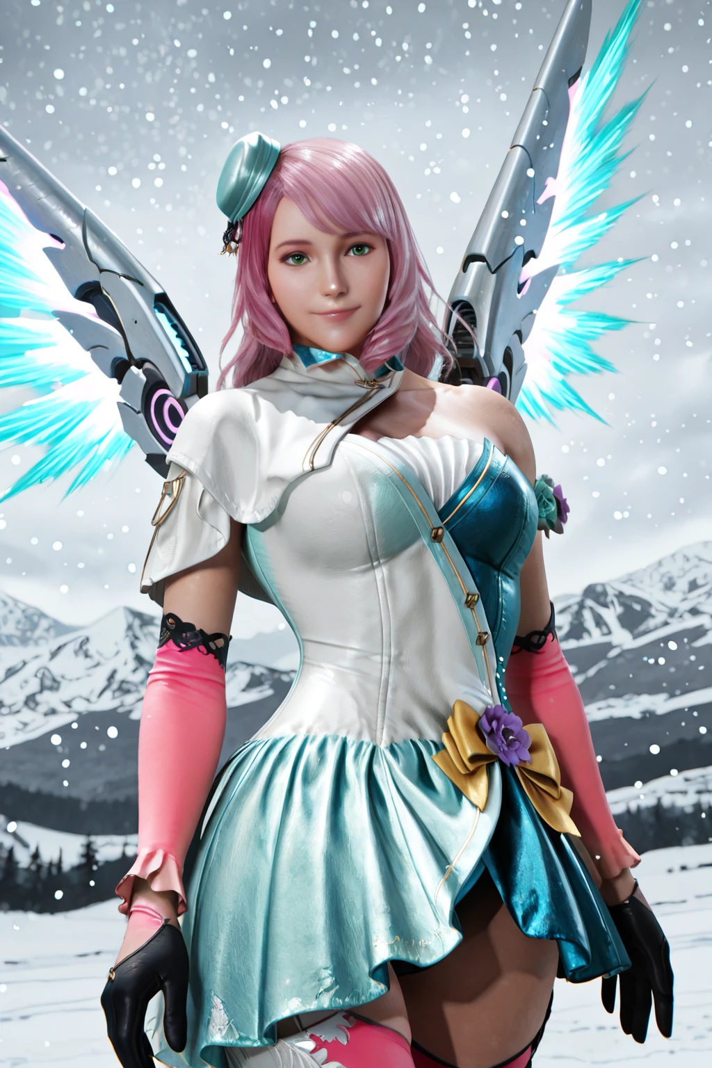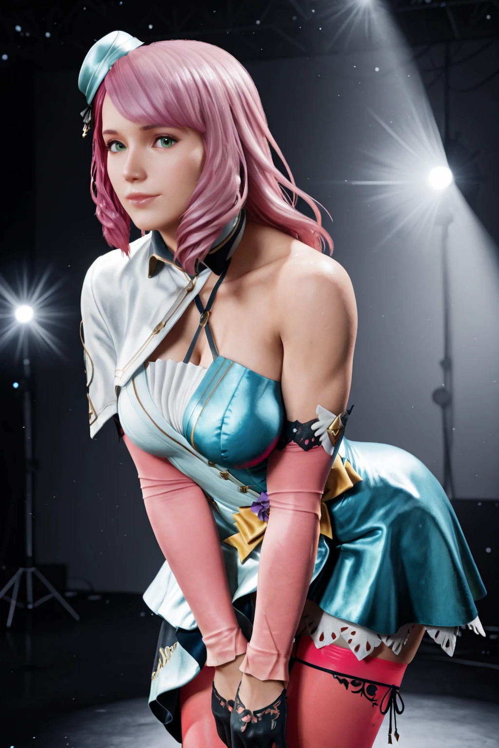 Alisa Bosconovitch, long hair, pink hair, green eyes, yellow bow, elbow gloves, white dress, aqua dress, blue dress, short dress, purple flower, mini hat, two-tone dress, asymmetrical clothes, single bare shoulder, capelet, gloves, pink thighhighs, multicolored dress, high heels, black footwear