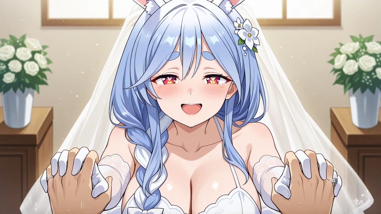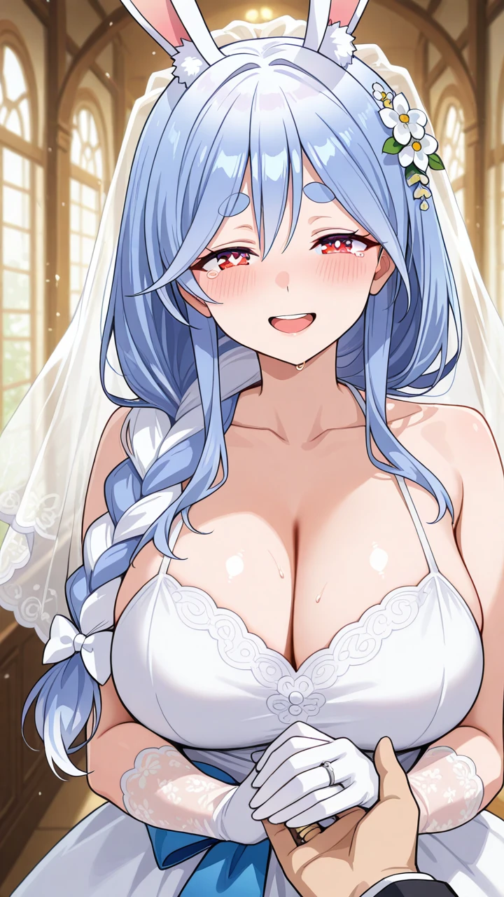 pekomama, mature female, rabbit girl, rabbit-shaped pupils, short eyebrows, braided ponytail, rabbit ears, thick eyebrows, animal ear fluff, braid, red eyes, Dress (Optional, most of the time, works even without the tags) :