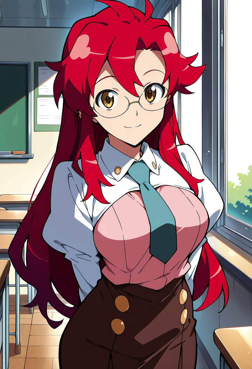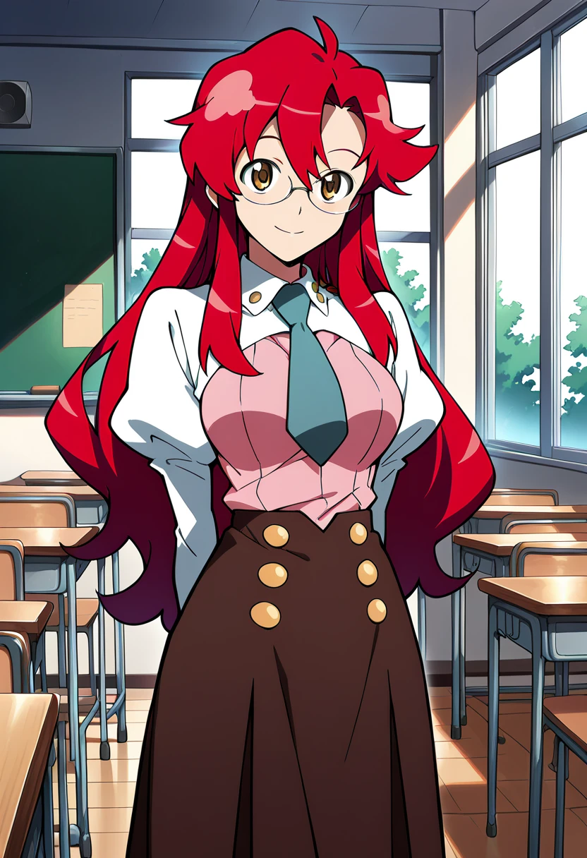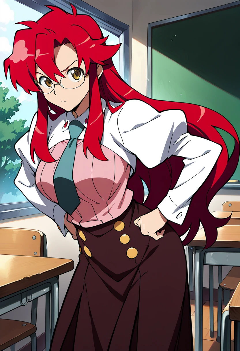 yoko-teacher, shrug \(clothing\), long sleeves, white sleeves, pink shirt, teacher, glasses, bespectacled, aged up, necktie, hair down, skirt, long skirt, brown skirt, alternate hairstyle, puffy sleeves,Space: