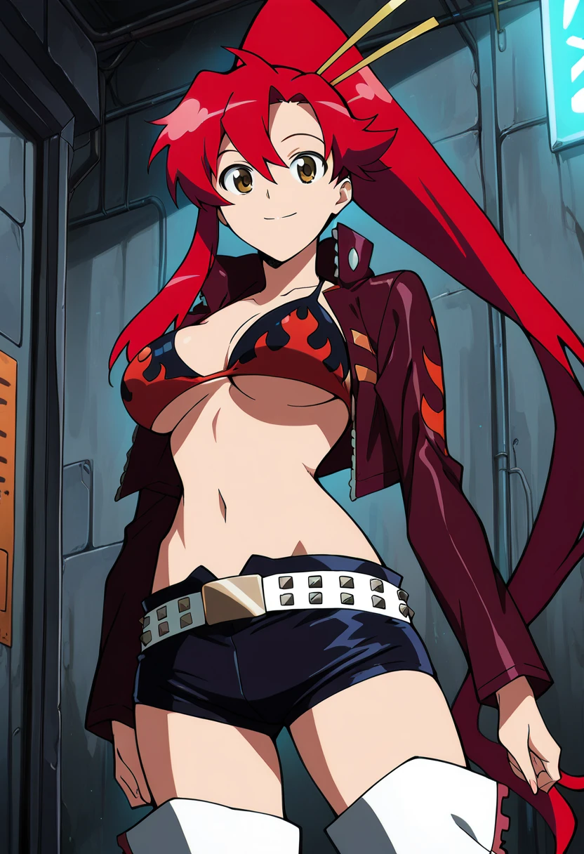 yoko-post-timeskip, jacket, maroon jacket, thighhighs, shorts, short shorts, black shorts, bikini top only, flame print bikini, breasts, underboob, navel, midriff, belt, white belt, studded belt, boots, thigh boots, Teacher:
