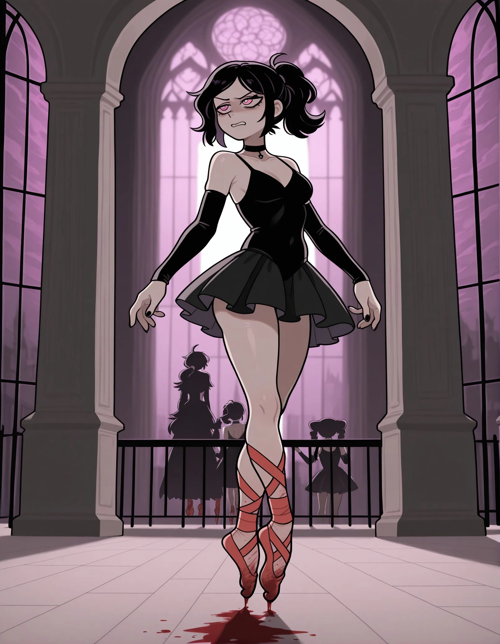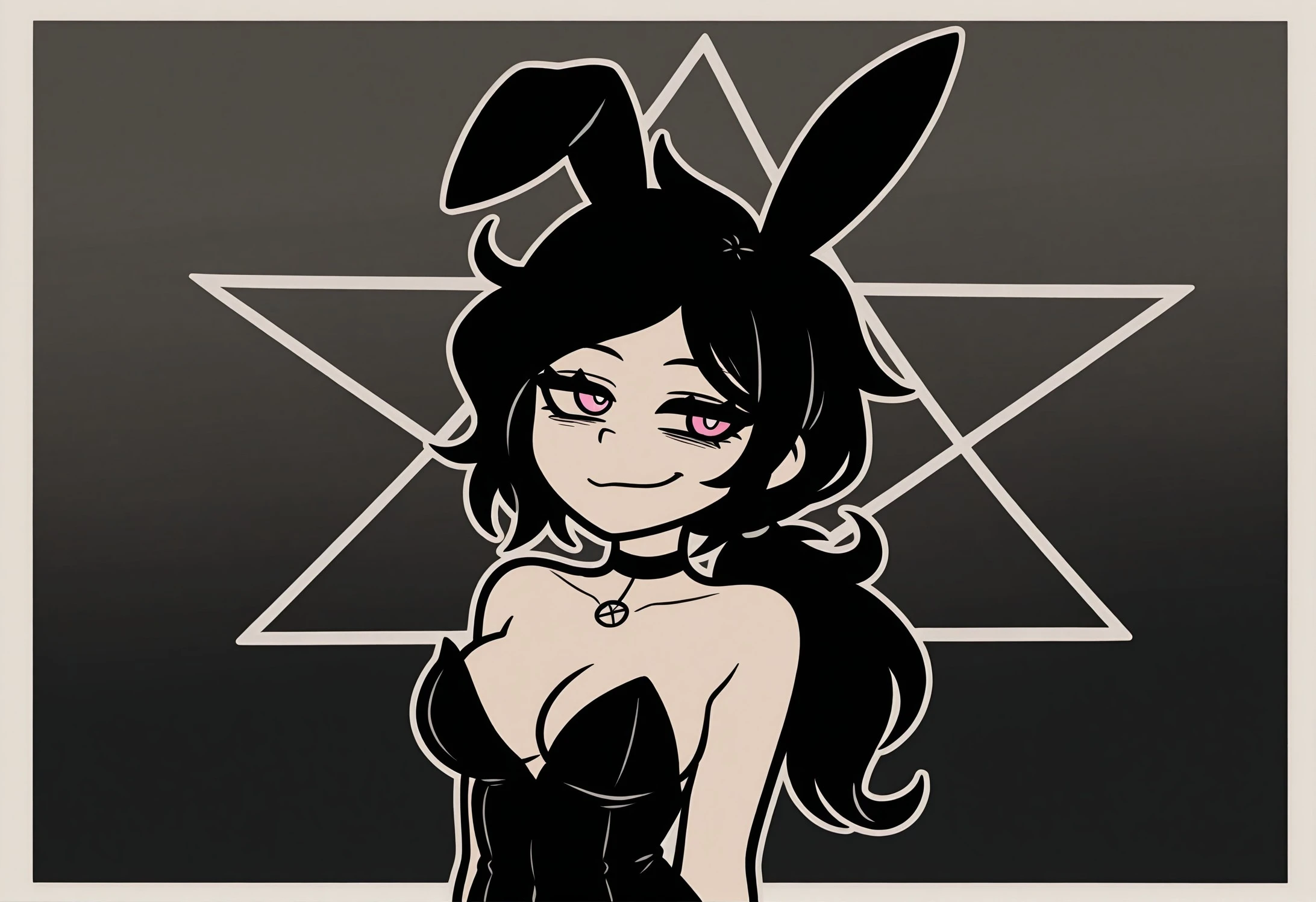 • Ashley, pink eyes, black hair, monochrome, white outline: Ensures Ashley's distinctive visual style and key features are accurately captured like in the game.