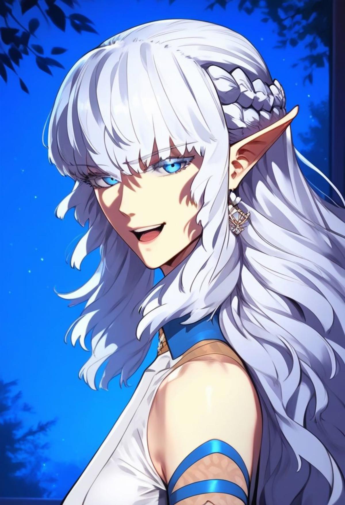 Quikantel, ice blue eyes, white hair, long hair, french braid, dragon uniform, bridal gauntlet, pointy ears