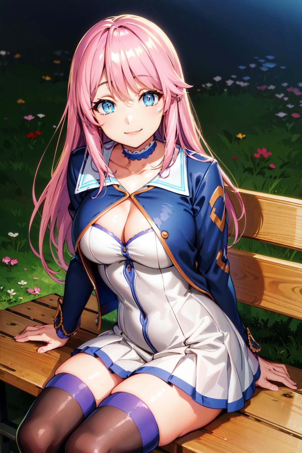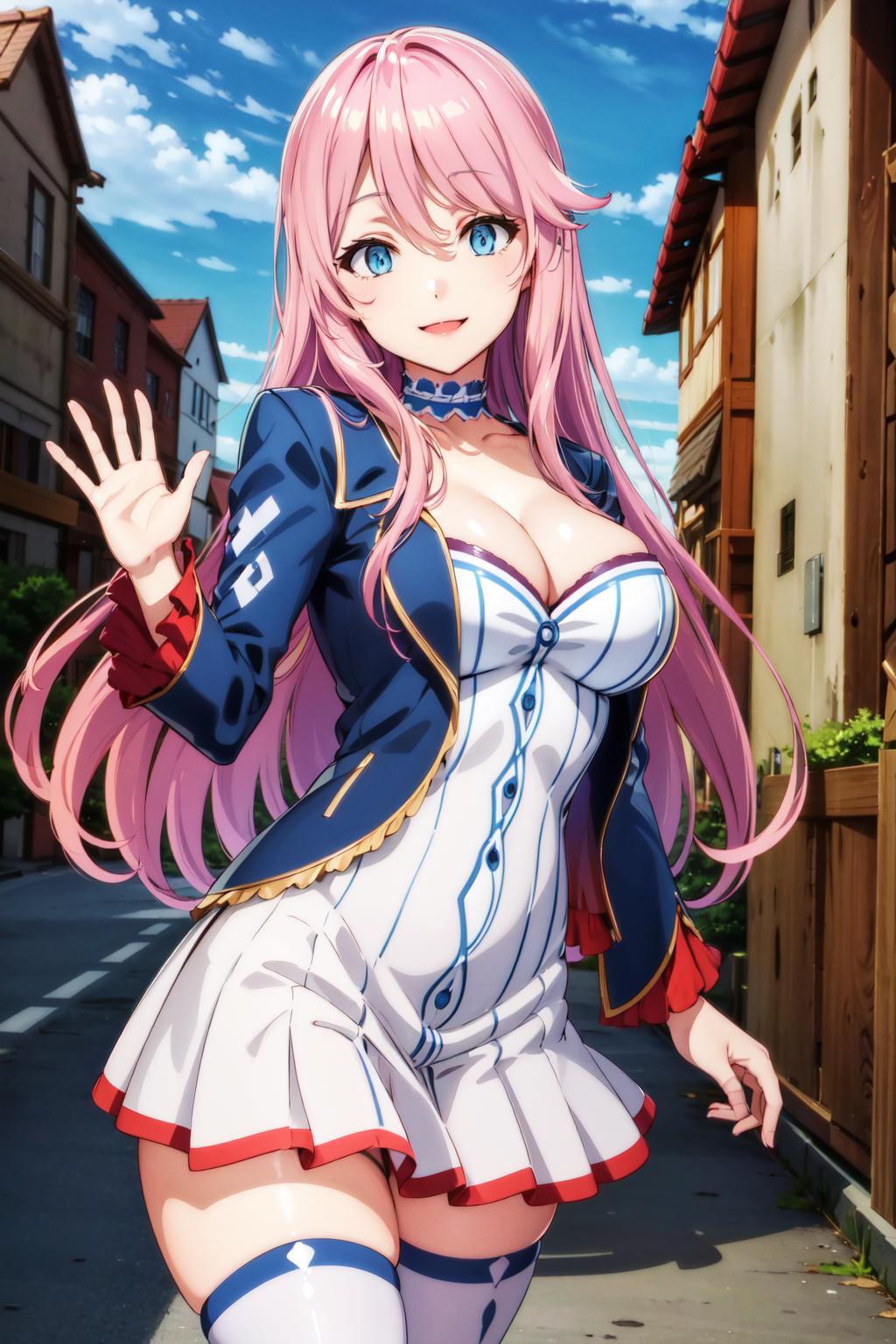 outfit2aaflare, long hair, blue eyes, thighhighs, dress, choker, blue jacket, cleavage cutout