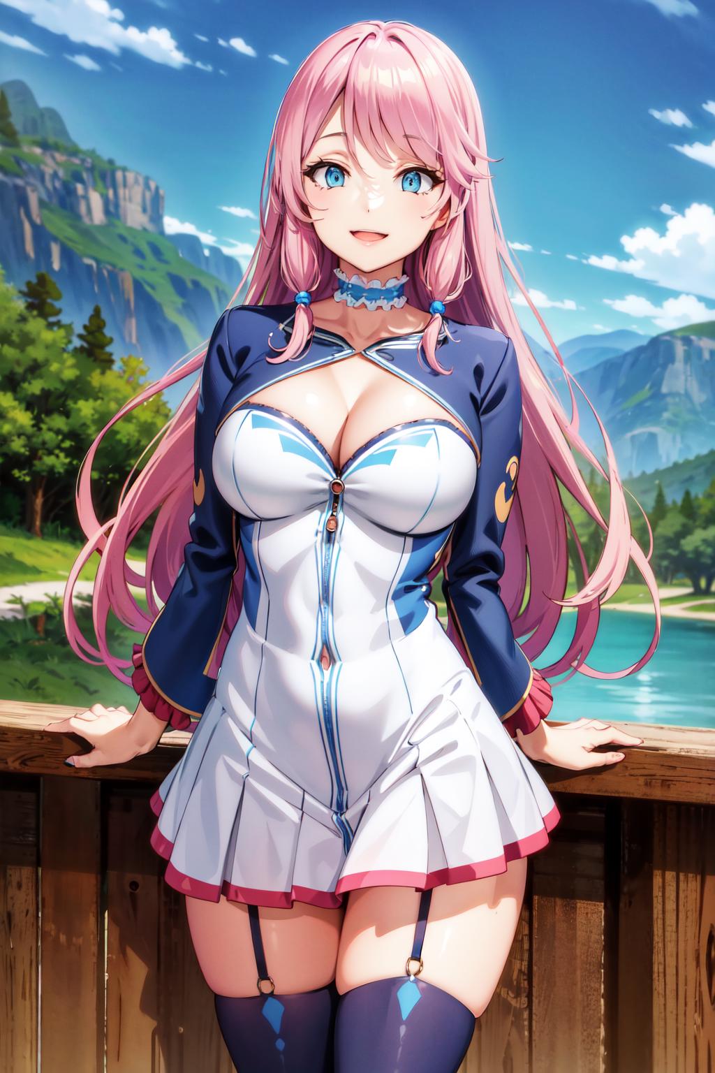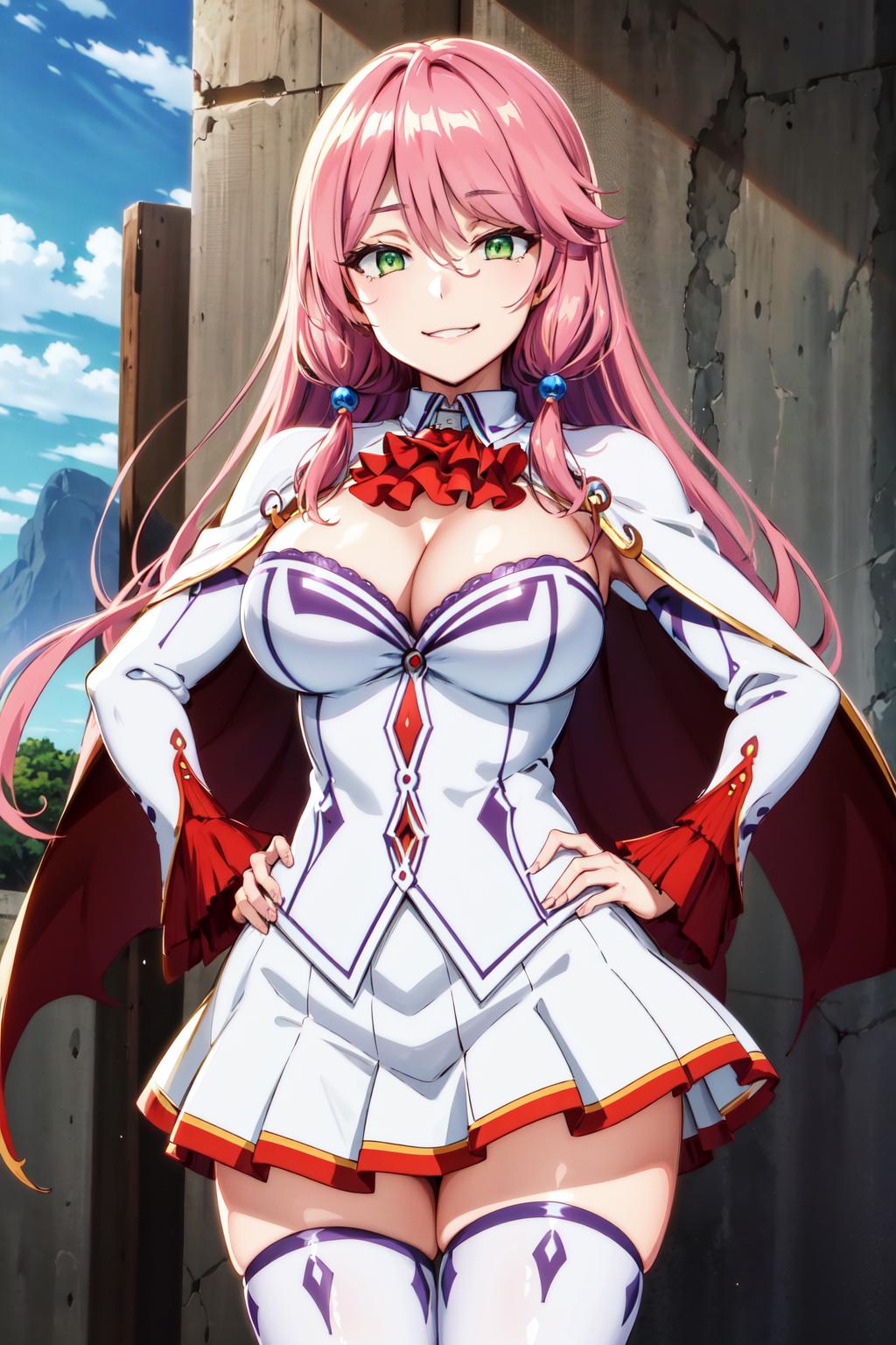 outfit1aaflare, long hair, hair bobbles, bangs, green eyes, red ascot, white capelet, cleavage, white dress, long sleeves, white thighhighs