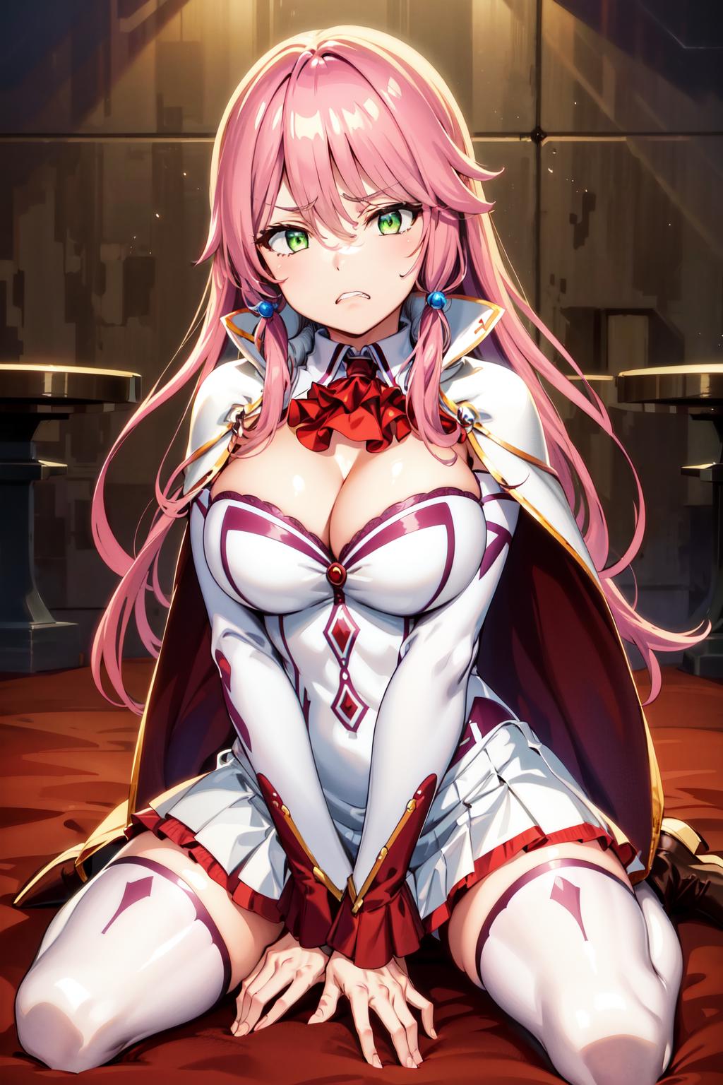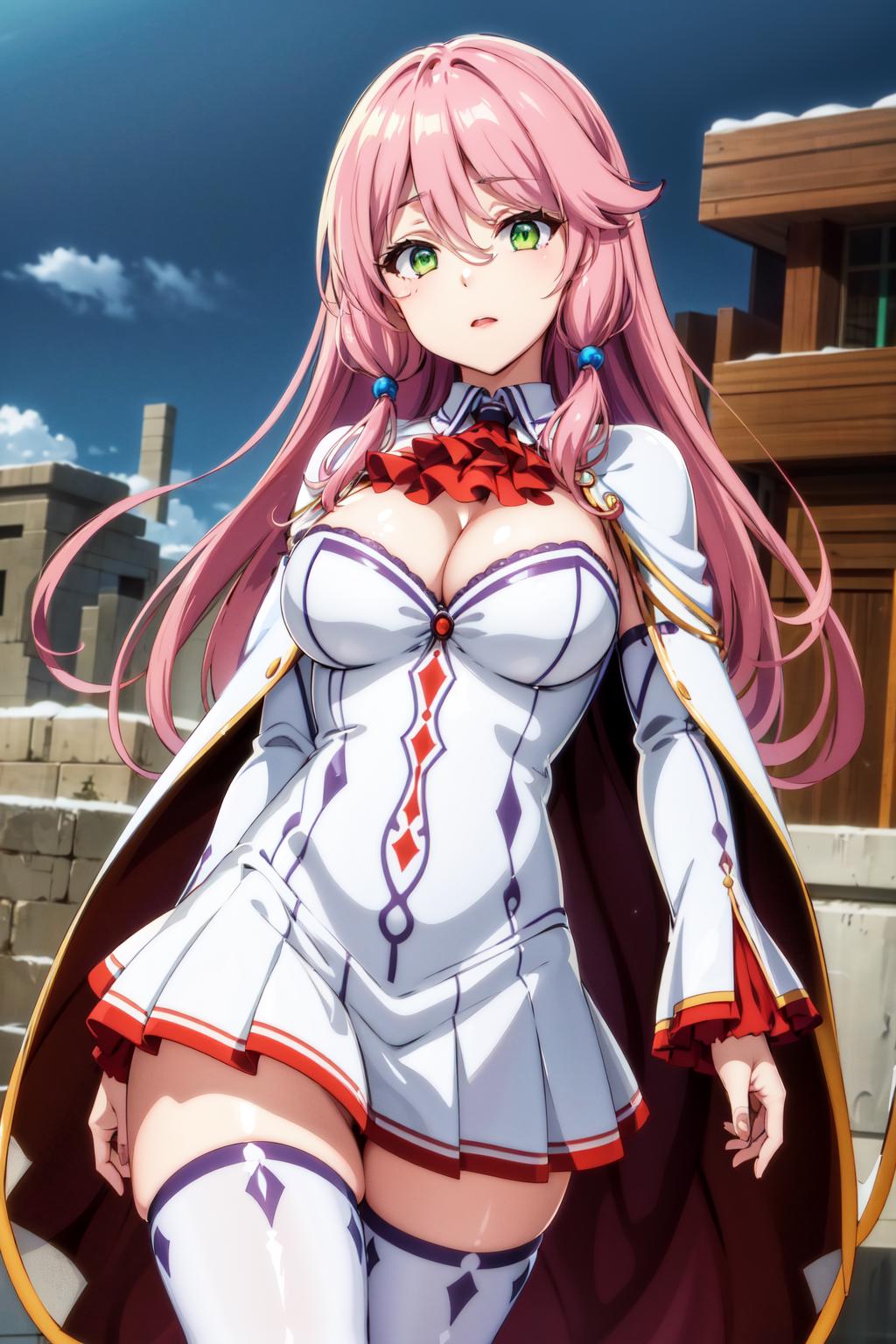 aaflare, long hair, hair bobbles, bangs, green eyes, red ascot, white capelet, cleavage, white dress, long sleeves, white thighhighs
