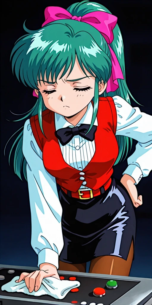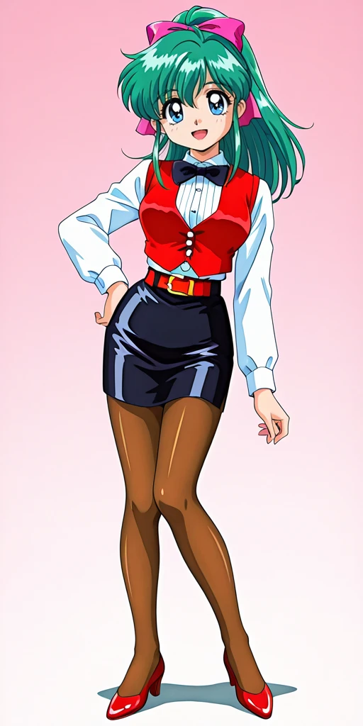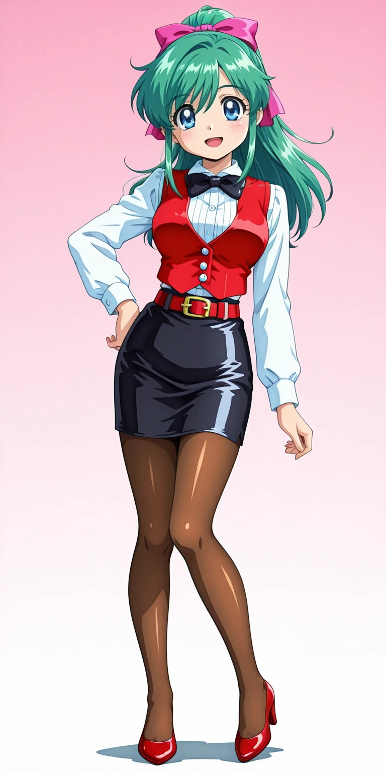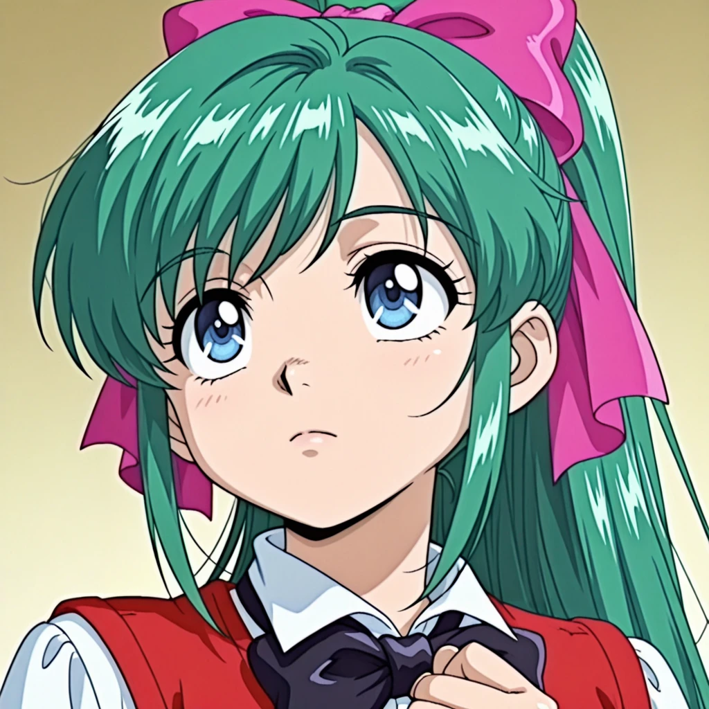 long hair, high ponytail, wide ponytail, sidelocks, swept bangs, hair between eyes, pink hair ribbon, green hair,