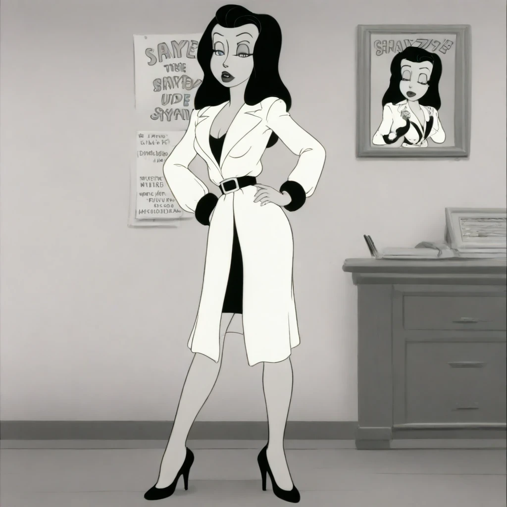 Monochrome, greyscale, 1980s styles, 2D cartoon styles, cartoon styles, Garfield Styles, Tanya O'Tabby, black hair, lipstick, makeup, long hair, half closed eyes, Belt, long sleeves, coat, long sleeved coat, black dress under the coat, dress under the coat, off-shoulder dress, pencil dress, high heels, black high heels