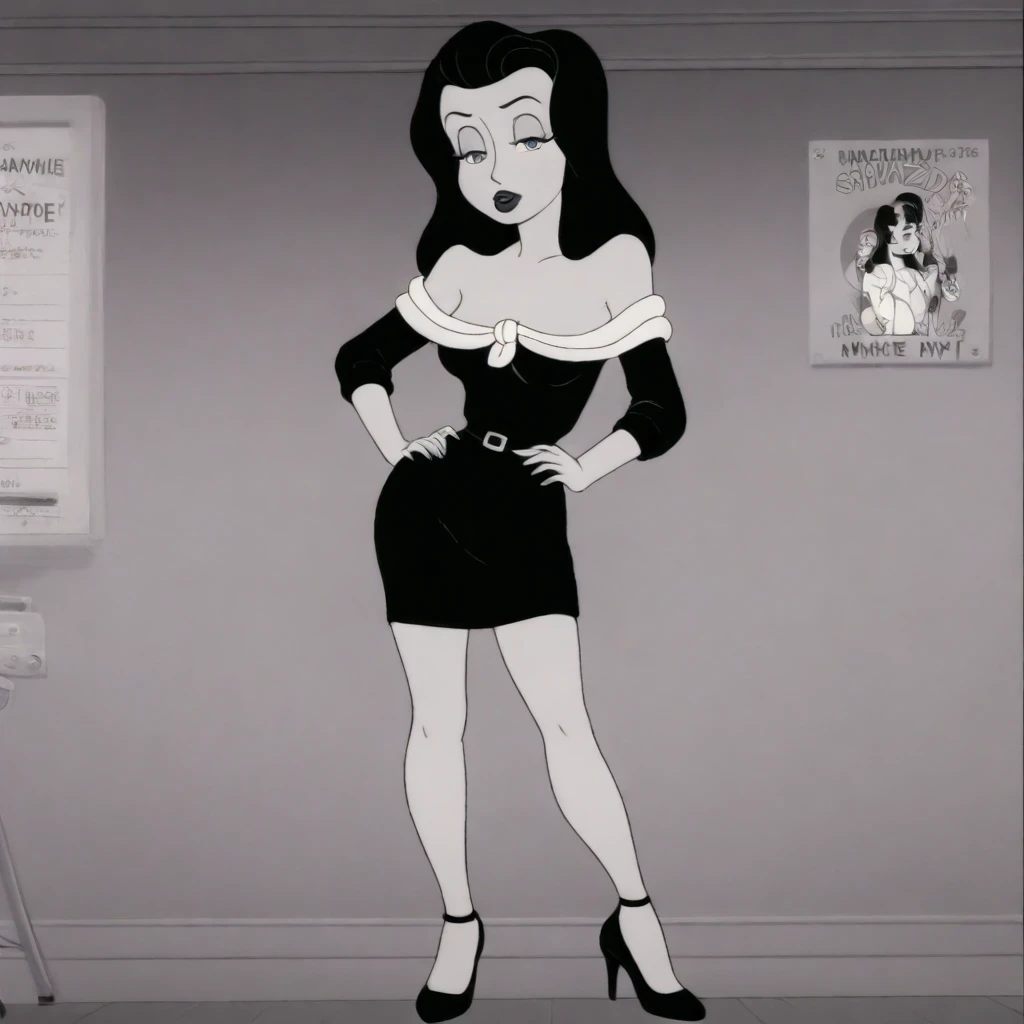 Monochrome, greyscale, 1980s styles, 2D cartoon styles, cartoon styles, Garfield Styles, Tanya O'Tabby, black hair, lipstick, makeup, long hair, half closed eyes, shoulders, off-shoulder dress, pencil dress, black dress, high heels, black high heels