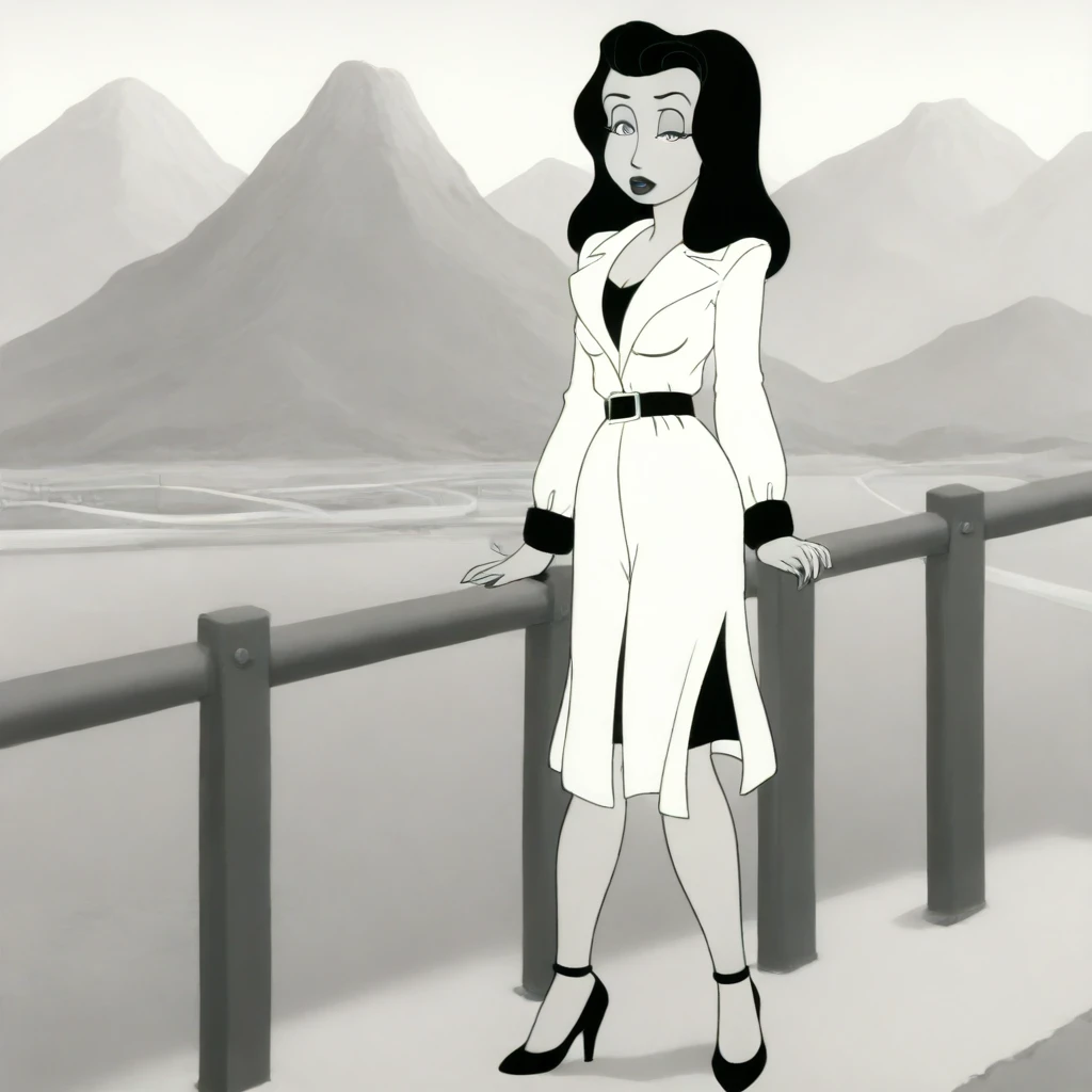 Dress With Coat: (Monochrome, greyscale, 1980s styles, 2D cartoon styles, cartoon styles, Garfield Styles, Tanya O'Tabby, black hair, lipstick, makeup, long hair, half closed eyes, Belt, long sleeves, coat, long sleeved coat, black dress under the coat, dress under the coat, off-shoulder dress, pencil dress, high heels, black high heels)