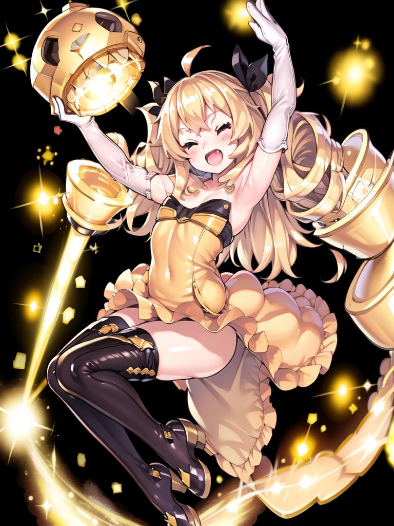 Prompts: Bulin, 1girl, BulinMK2, blonde hair, eyes closed. driller gloves, MK2_outfit, knee high stockings, yellow cat tail, carrying_rigging_machine