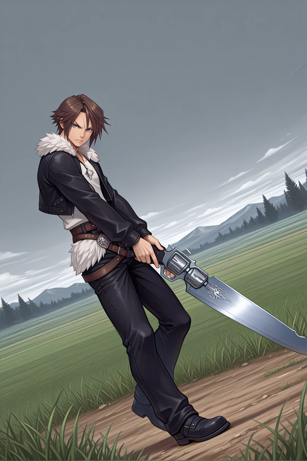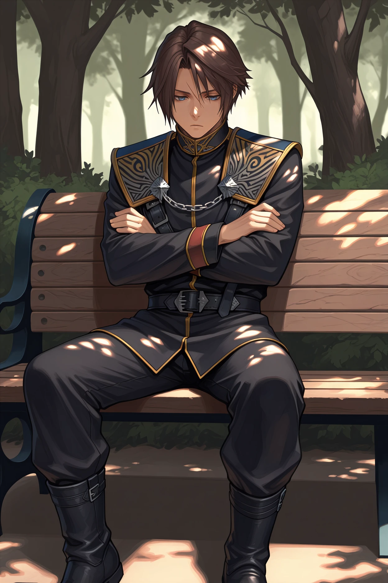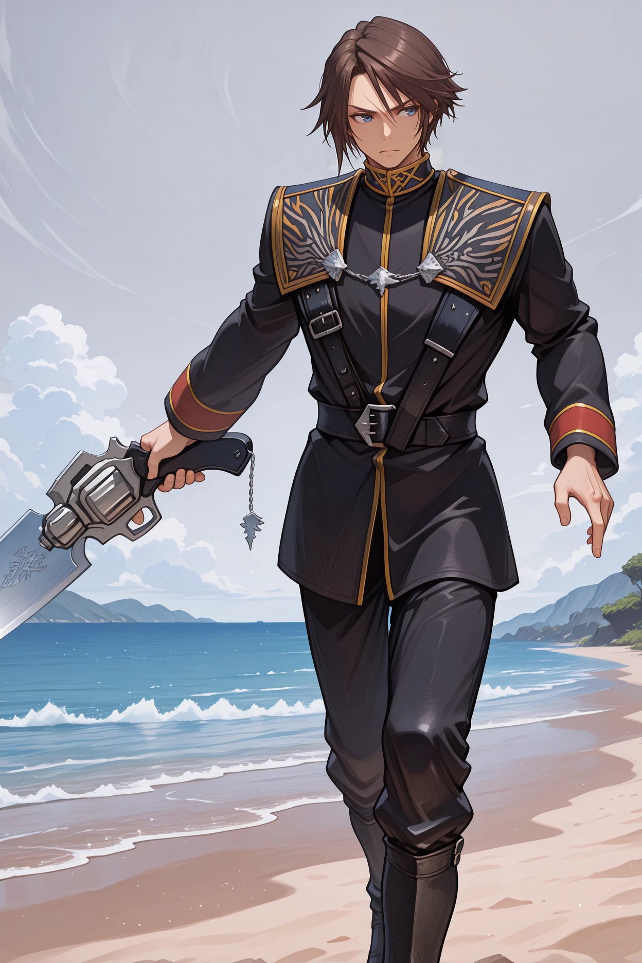 Add "chain, black uniform, military uniform, long sleeves, black belt, black pants, black boots" for his SeeD uniform.