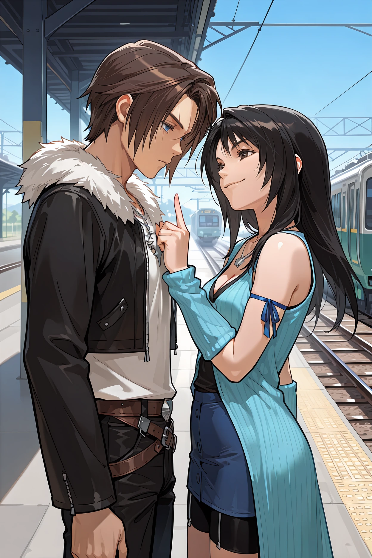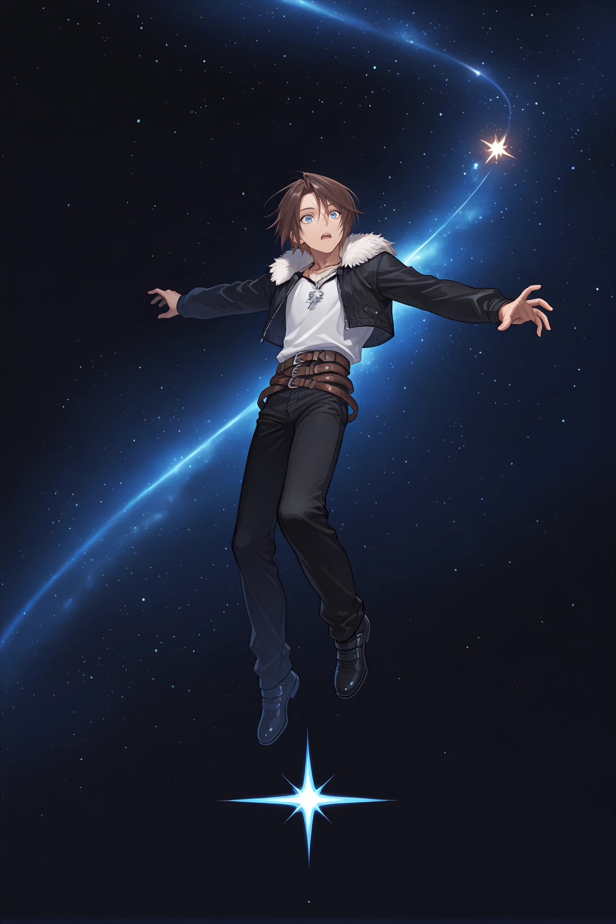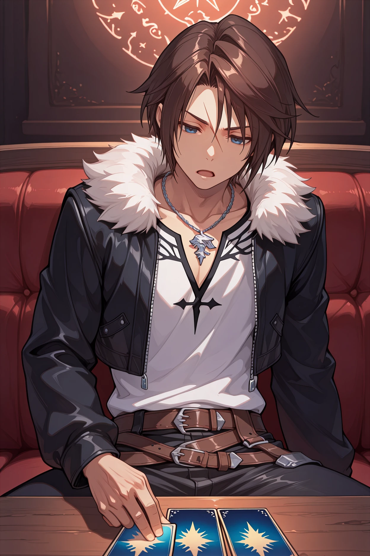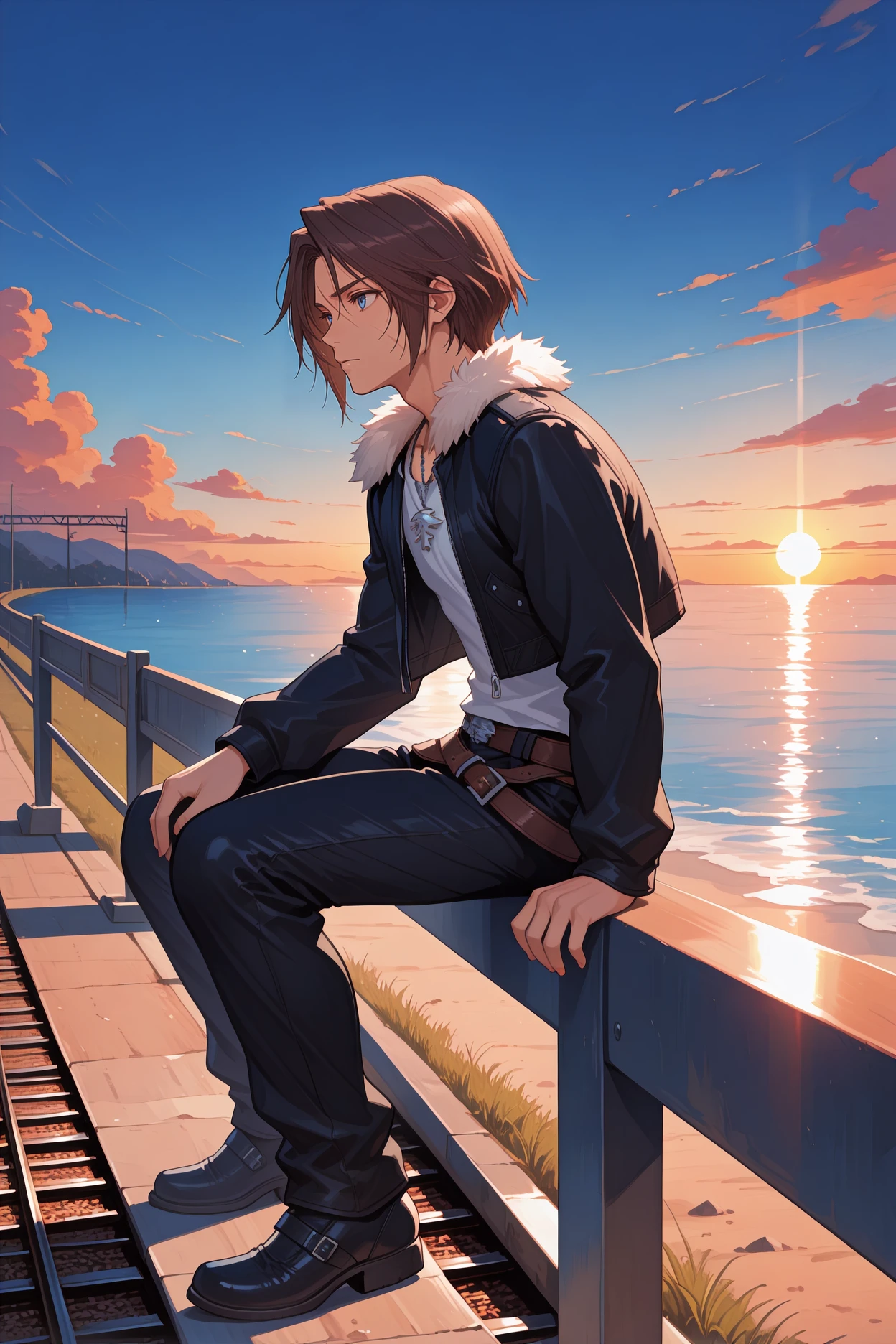 Add "chain, black uniform, military uniform, long sleeves, black belt, black pants, black boots" for his SeeD uniform.