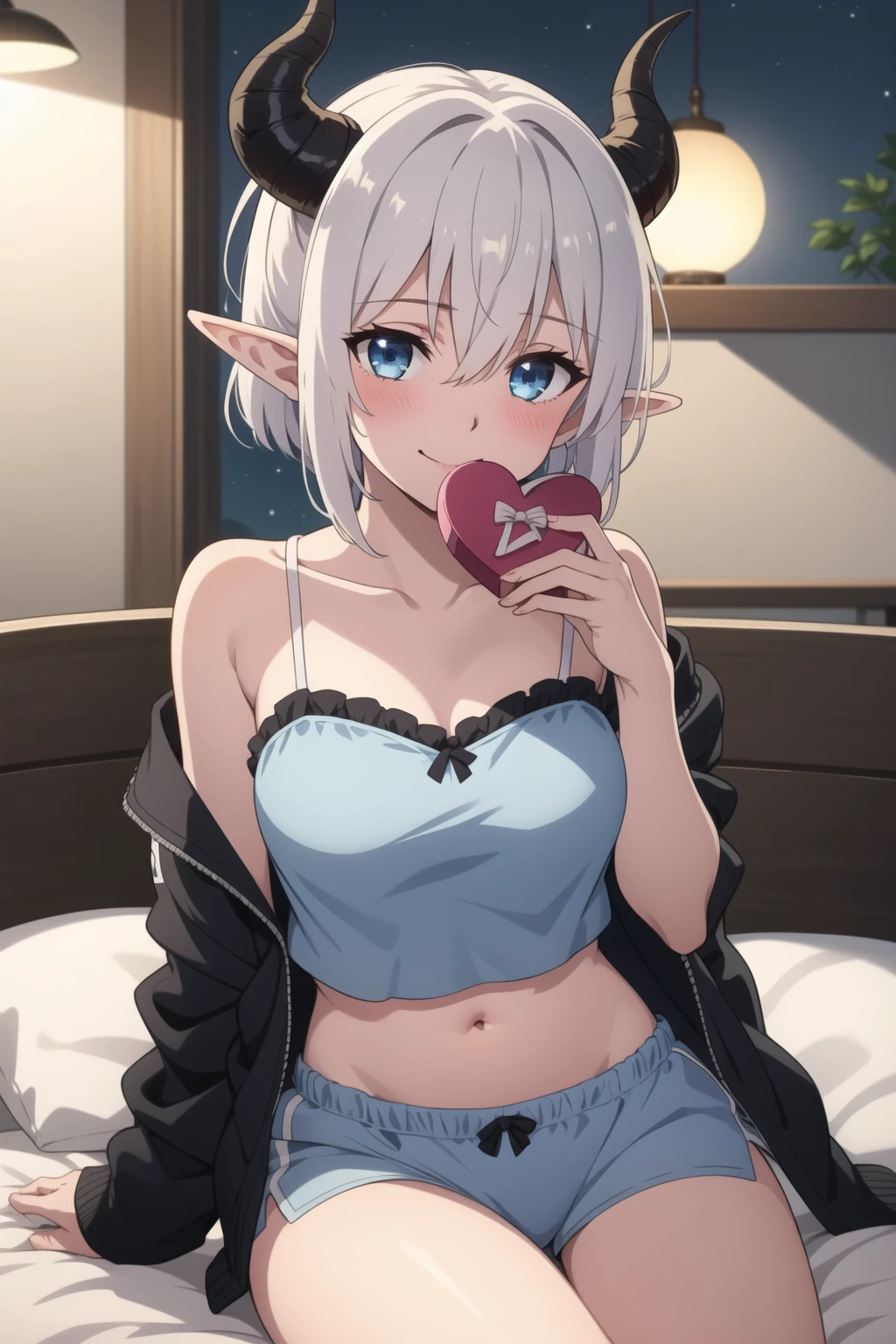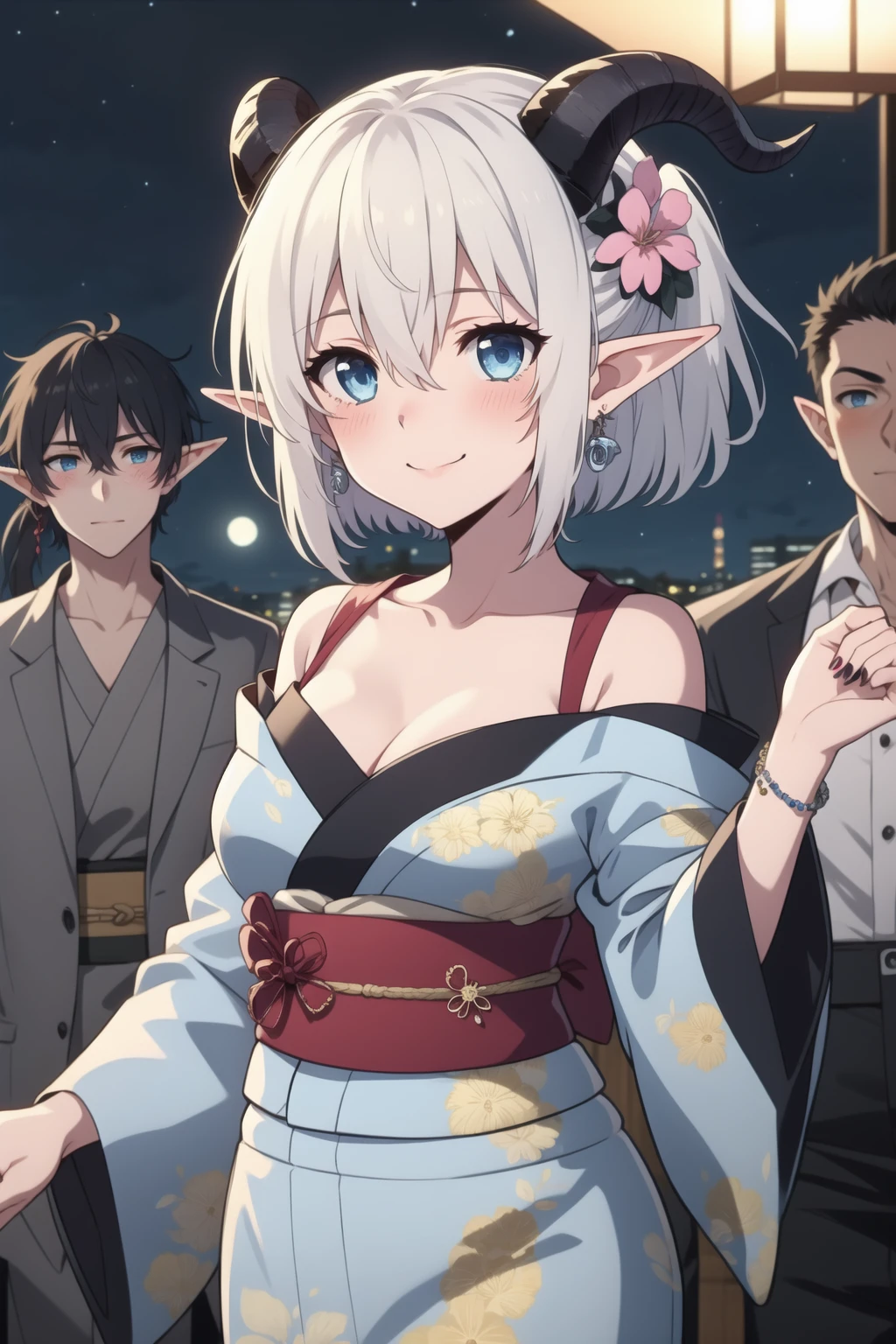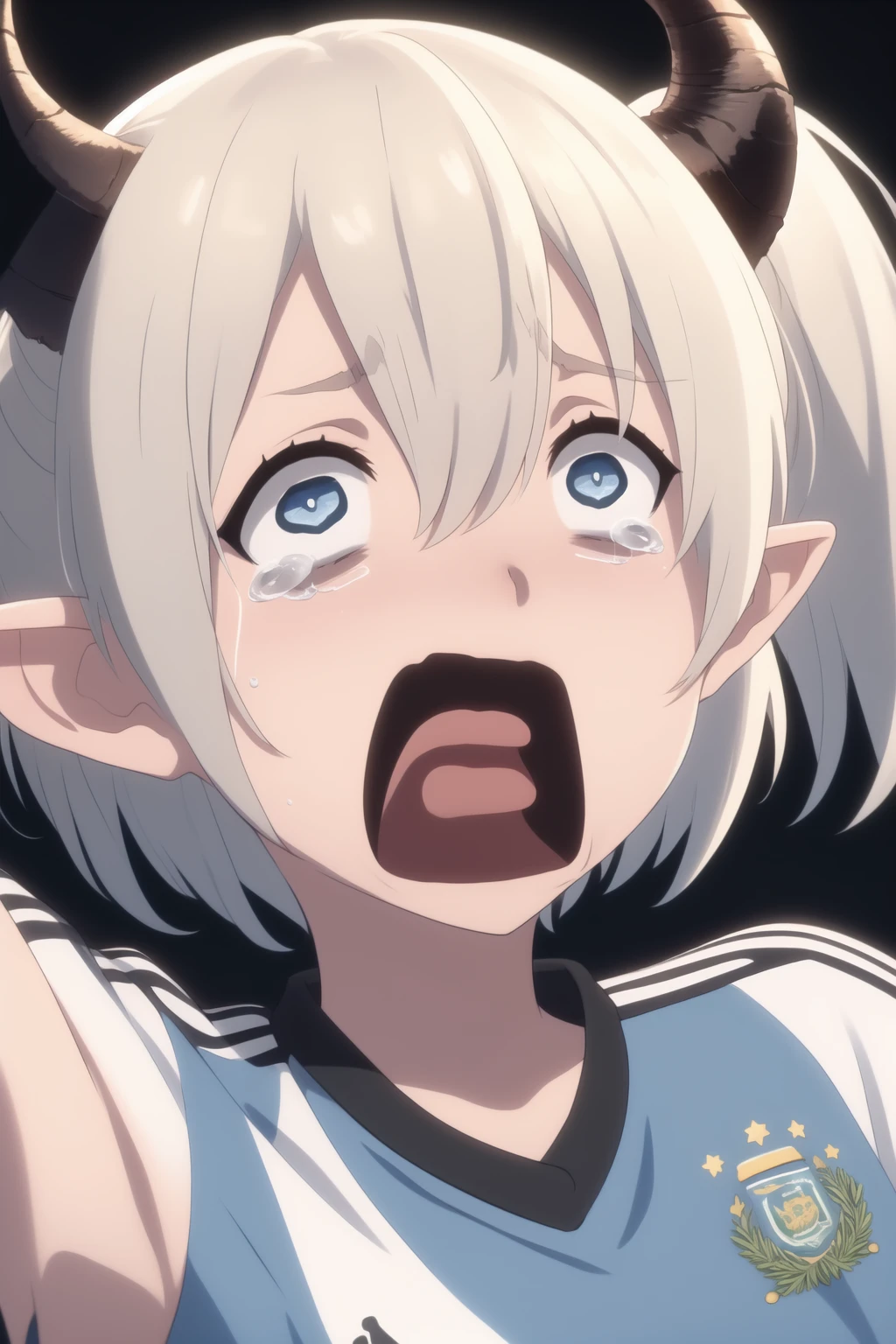 Trigger words: Mialygosa <lora:Mialygosa-10:1>, short hair, blue eyes, hair between eyes, ponytail, white hair, horns, pointy ears, demon horns, double pigtail,