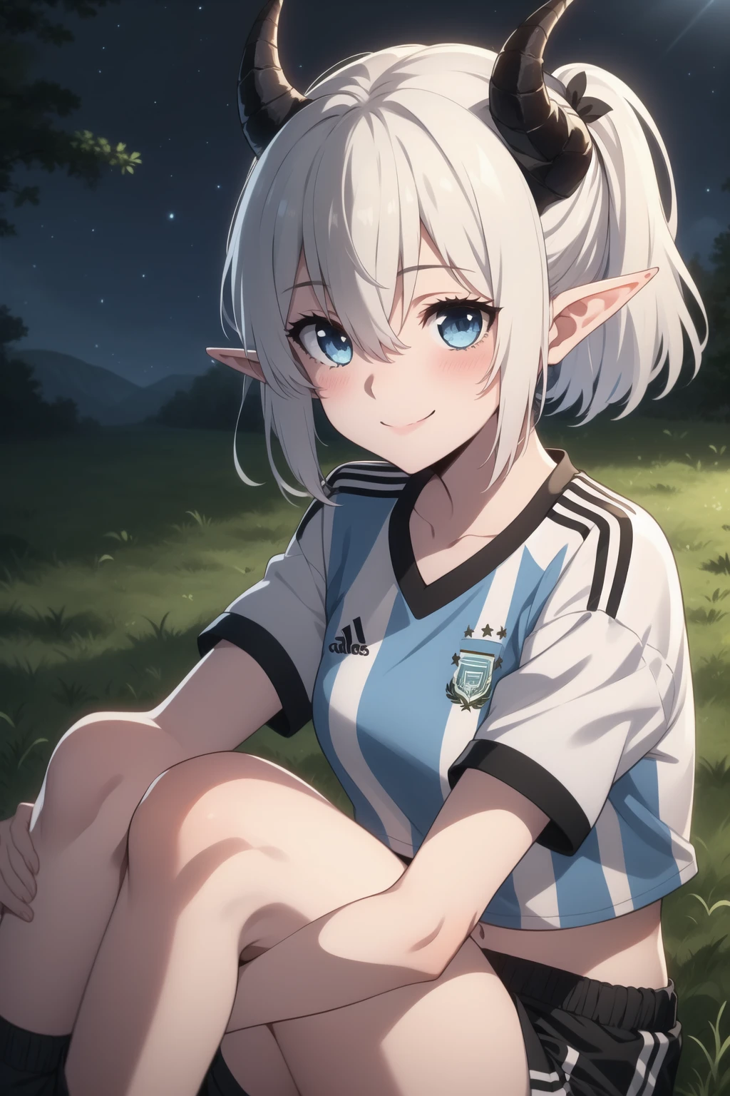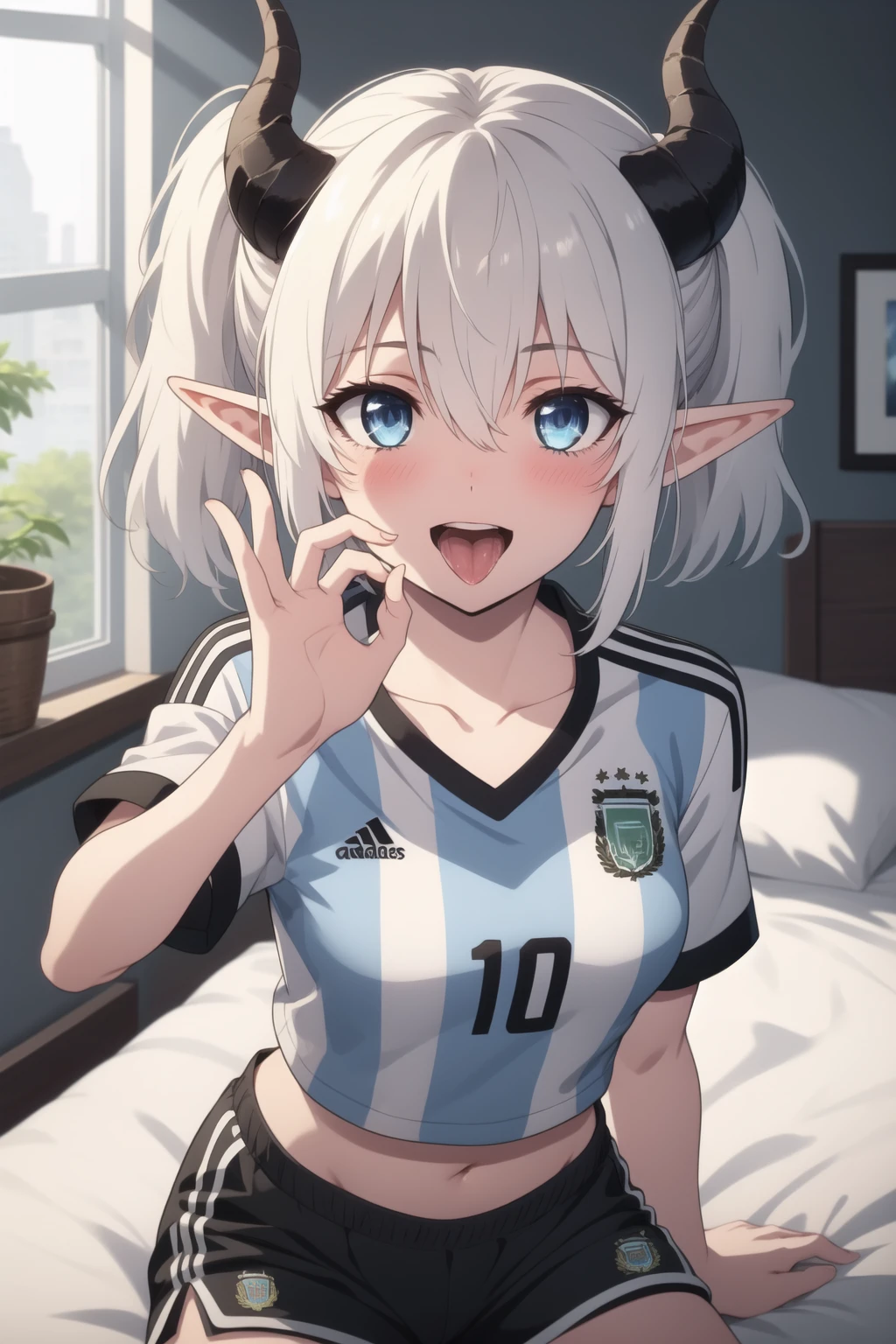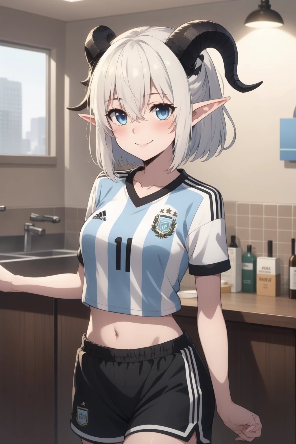 With sportswear: Mialygosa <lora:Mialygosa-10:1>, short hair, blue eyes, shirt, navel, hair between eyes, medium breasts, collarbone, ponytail, number 10, white hair, short sleeves, thighs, horns, shorts, pointy ears, midriff, short shorts, black shorts, blue shirt, demon horns, sportswear, soccer uniform, double pigtail