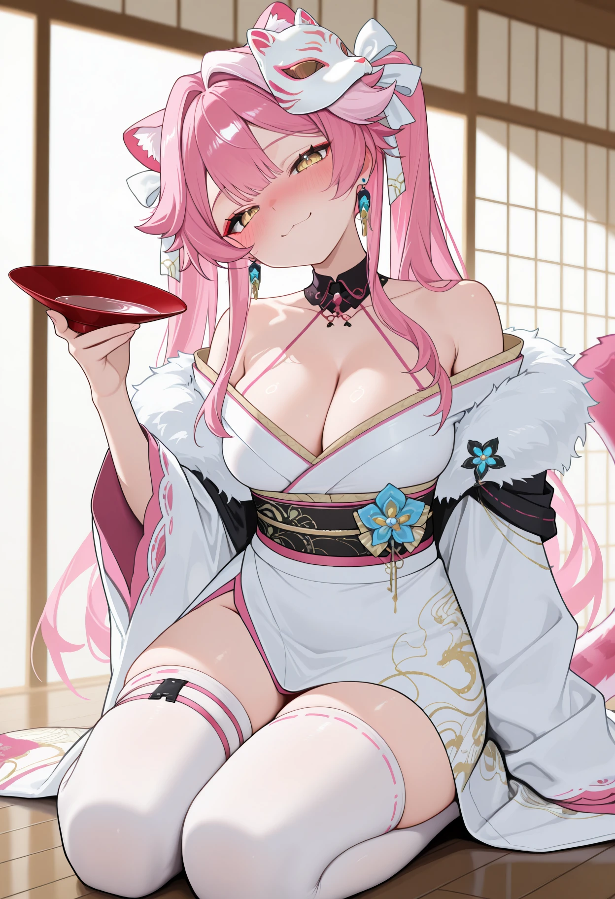 Ra0raNwYrs, yellow eyes, cat ears, pink hair, single white streak, long hair, twintails, cat tail, hair ribbon, white ribbon, fox mask, mask on head, earrings, detached collar, halterneck, off-shoulder kimono, white kimono, print kimono, fur trim, black sash, side slit, pink thigh strap, white thighhighs