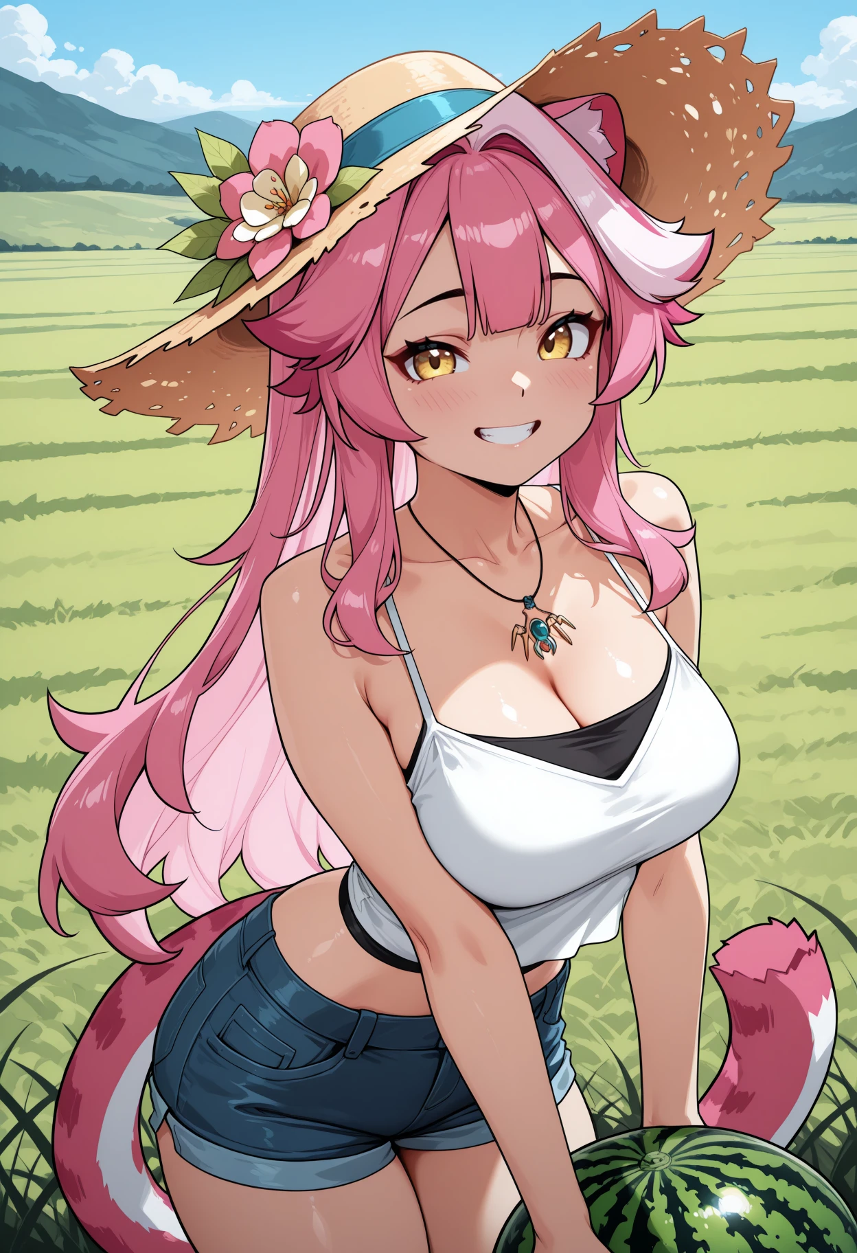 RaoraSummer, yellow eyes, cat ears, pink hair, single white streak, long hair, high ponytail, cat tail, sunglasses, eyewear on head, black choker, pink bikini, leopard print bikini, pink thigh strap