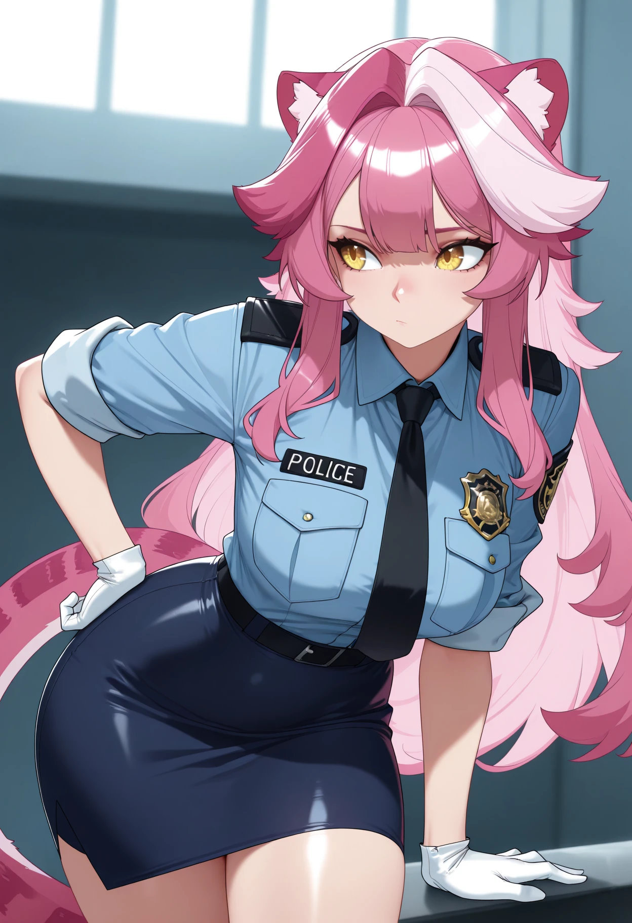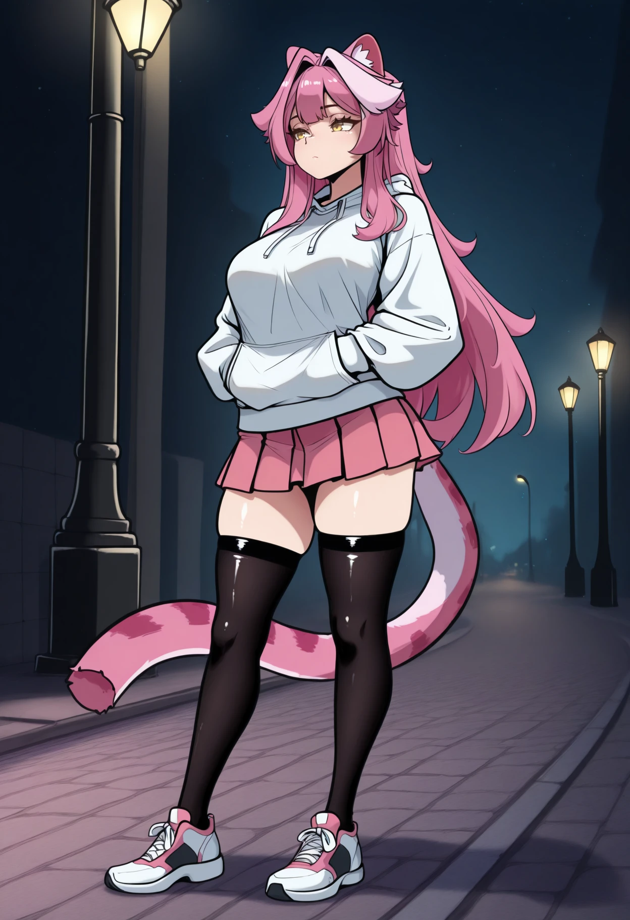 RaoraPanthera, yellow eyes, cat ears, pink hair, single white streak, long hair, cat tail