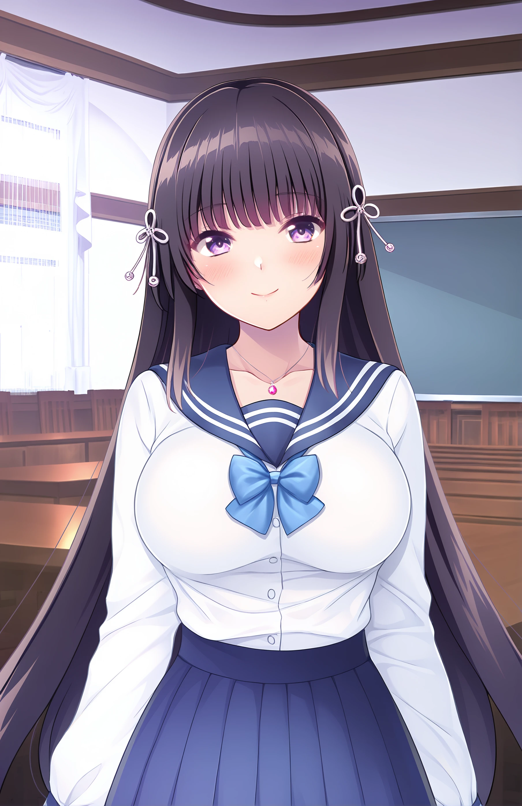 NorikaSakuya, long hair, , bangs, skirt, , shirt, black hair, hair ornament, long sleeves, bow, ribbon, jewelry, very long hair, school uniform, purple eyes, collarbone, hair ribbon, white shirt, pleated skirt, serafuku, bowtie, sailor collar, necklace, blue skirt, blue bow, blue sailor collar