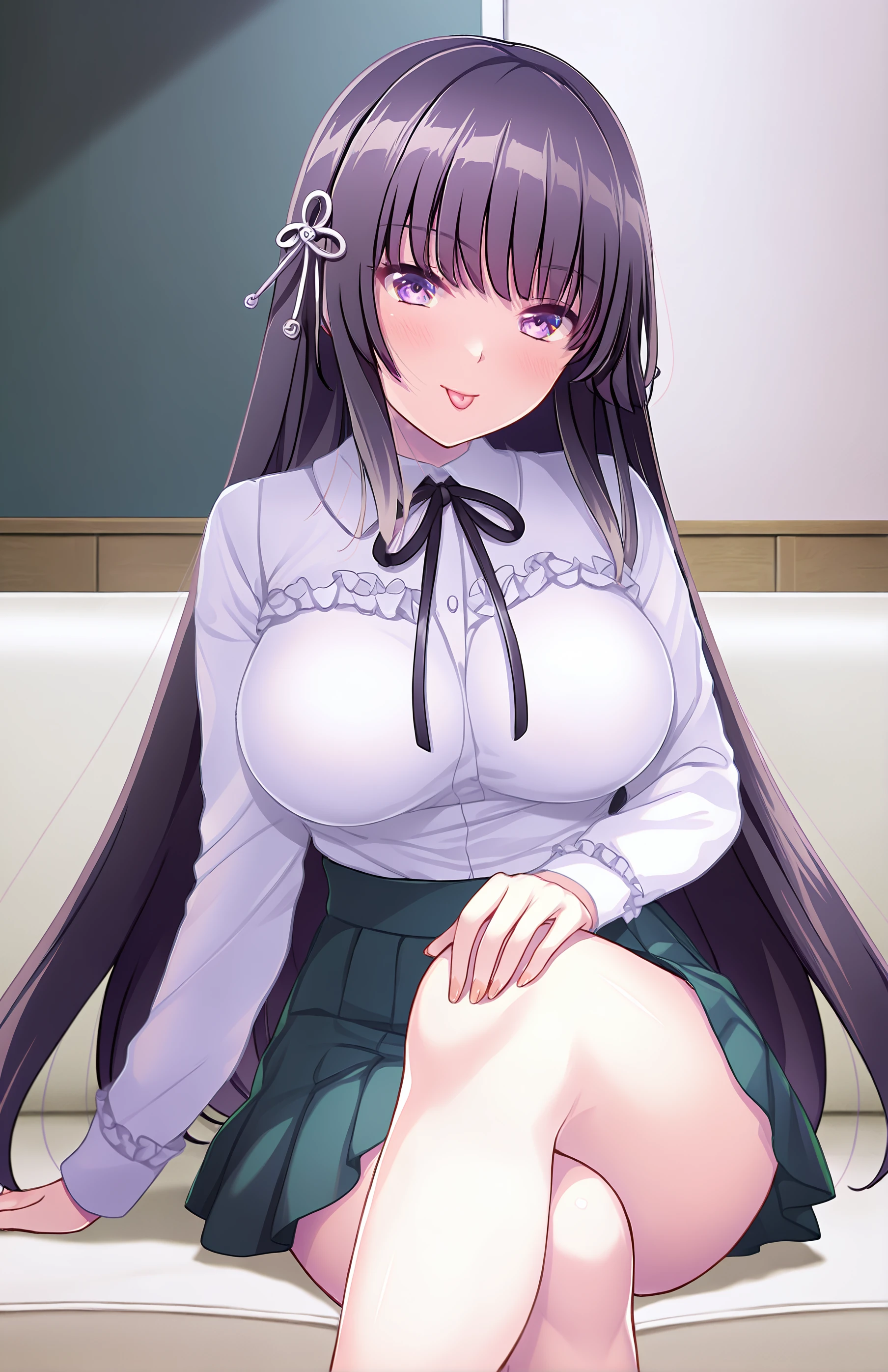 NorikaSakuya, long hair, , bangs, skirt, , shirt, black hair, hair ornament, long sleeves, ribbon, purple eyes, white shirt, pleated skirt, frills, black ribbon, neck ribbon, green skirt