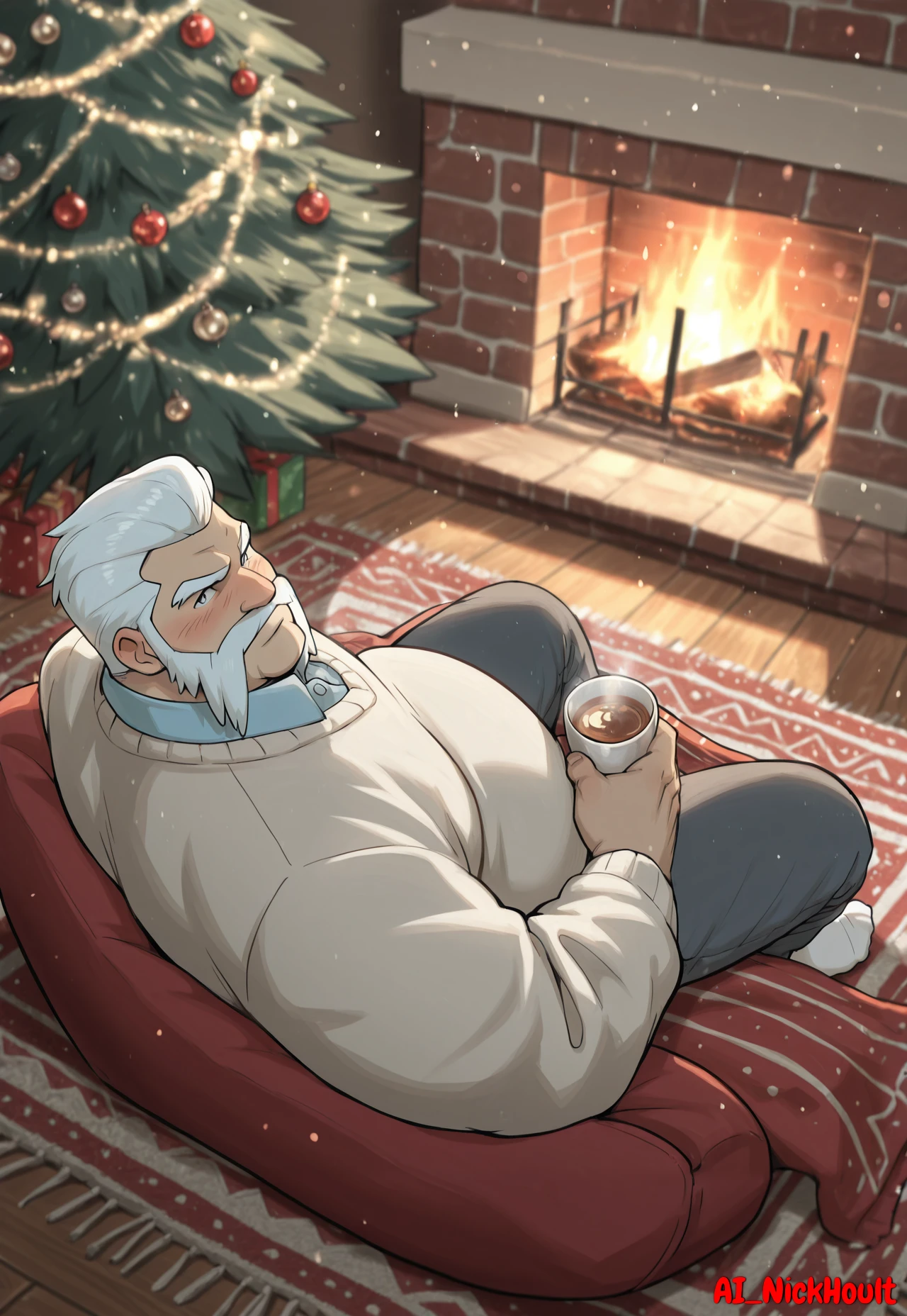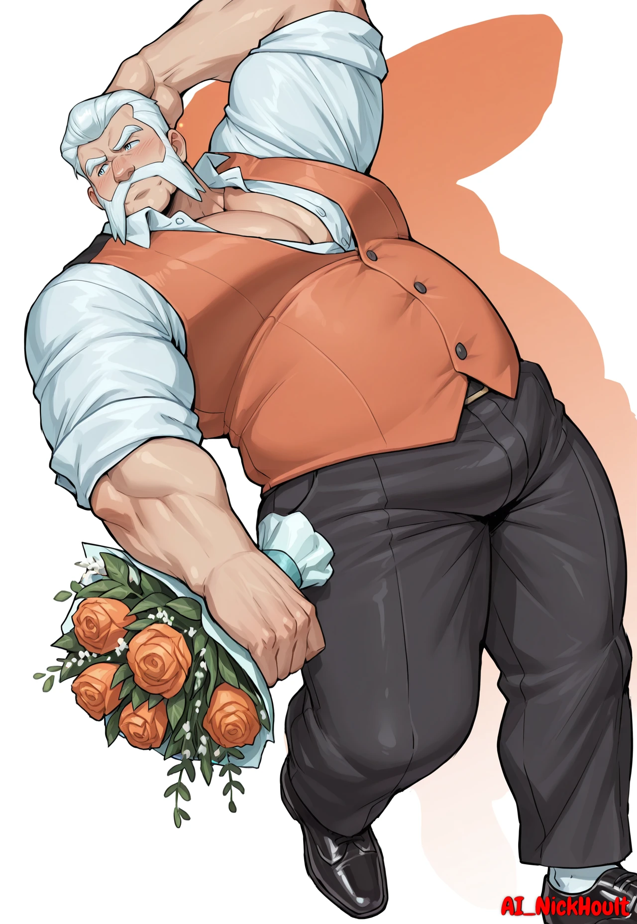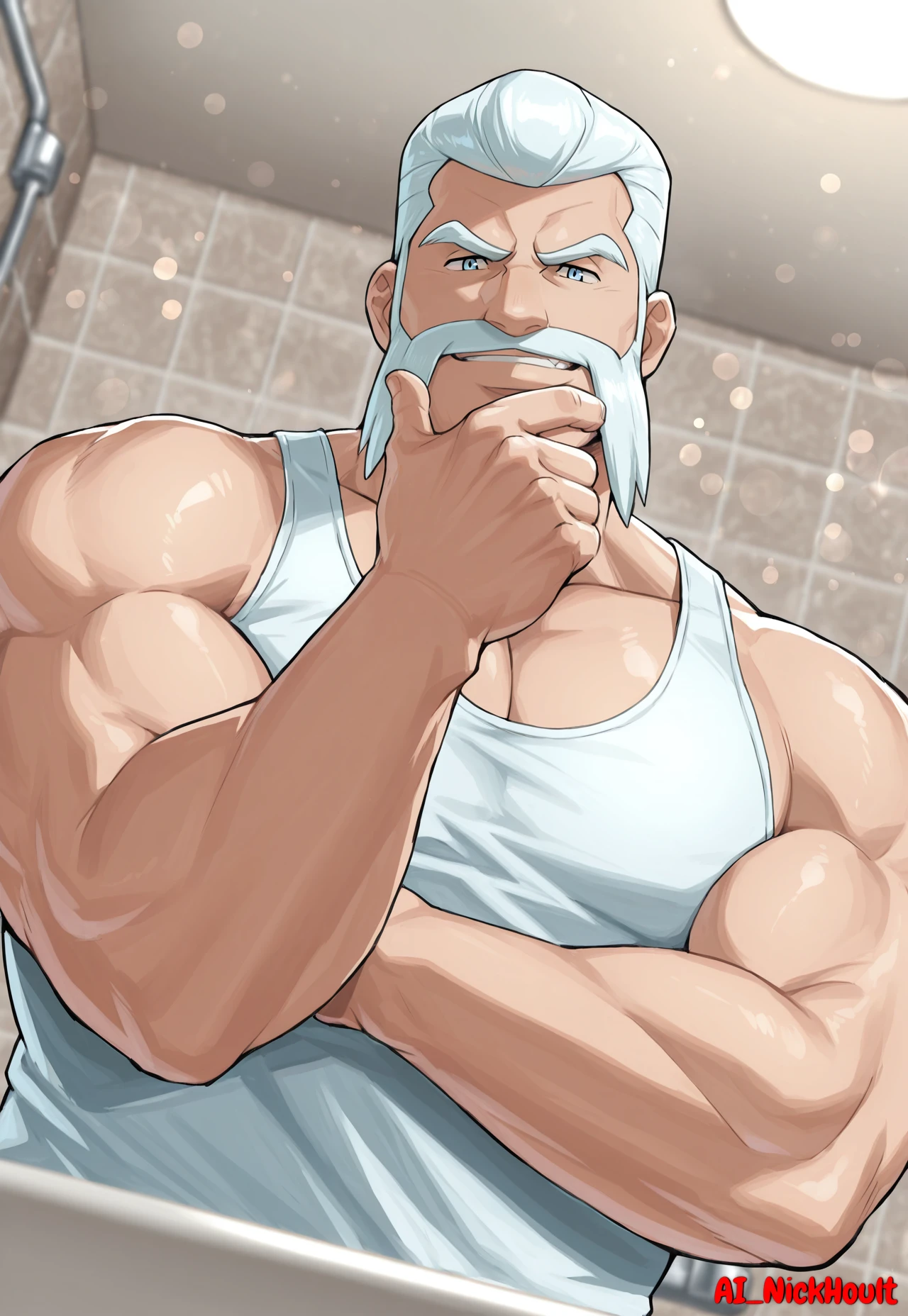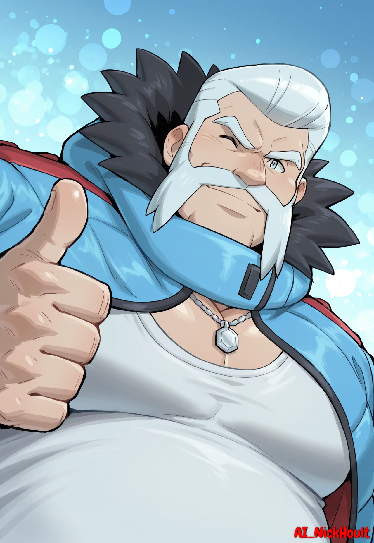Wulfric, mature man, white hair, Short hair, hair combed back, Friendly Mutton Chops, light blue eyes, thick eyebrows, chubby,