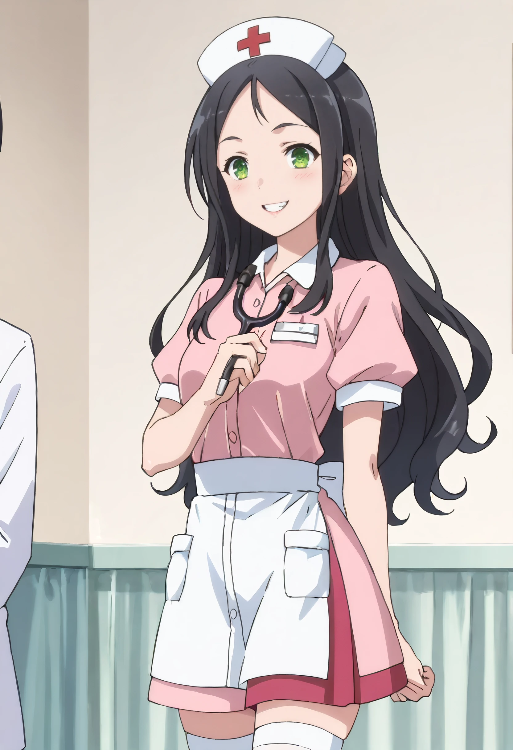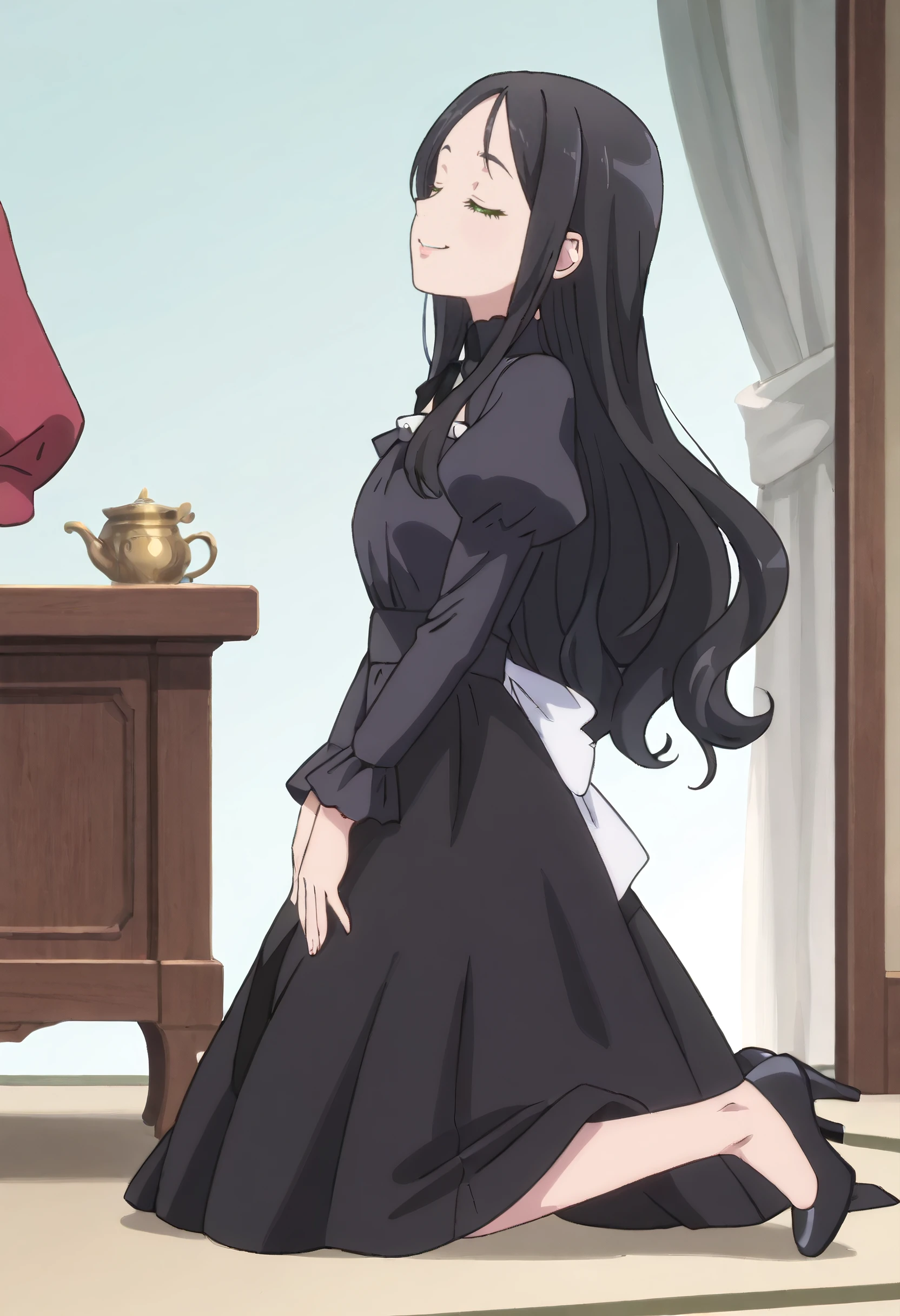 IAWAer, black hair, long hair, green eyes, bangs, forehead,