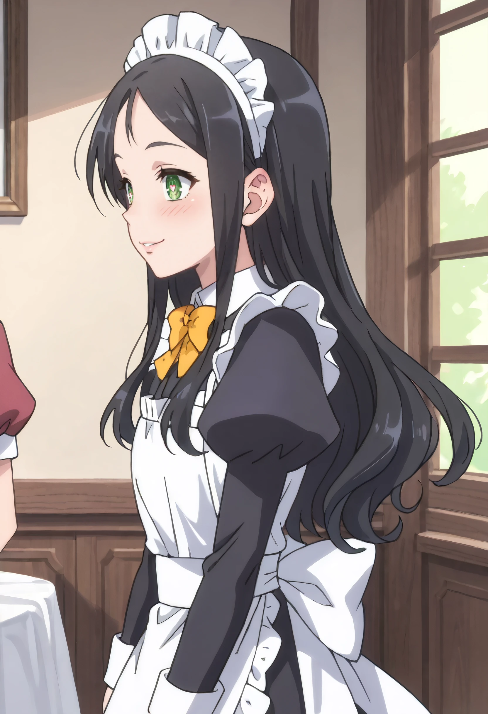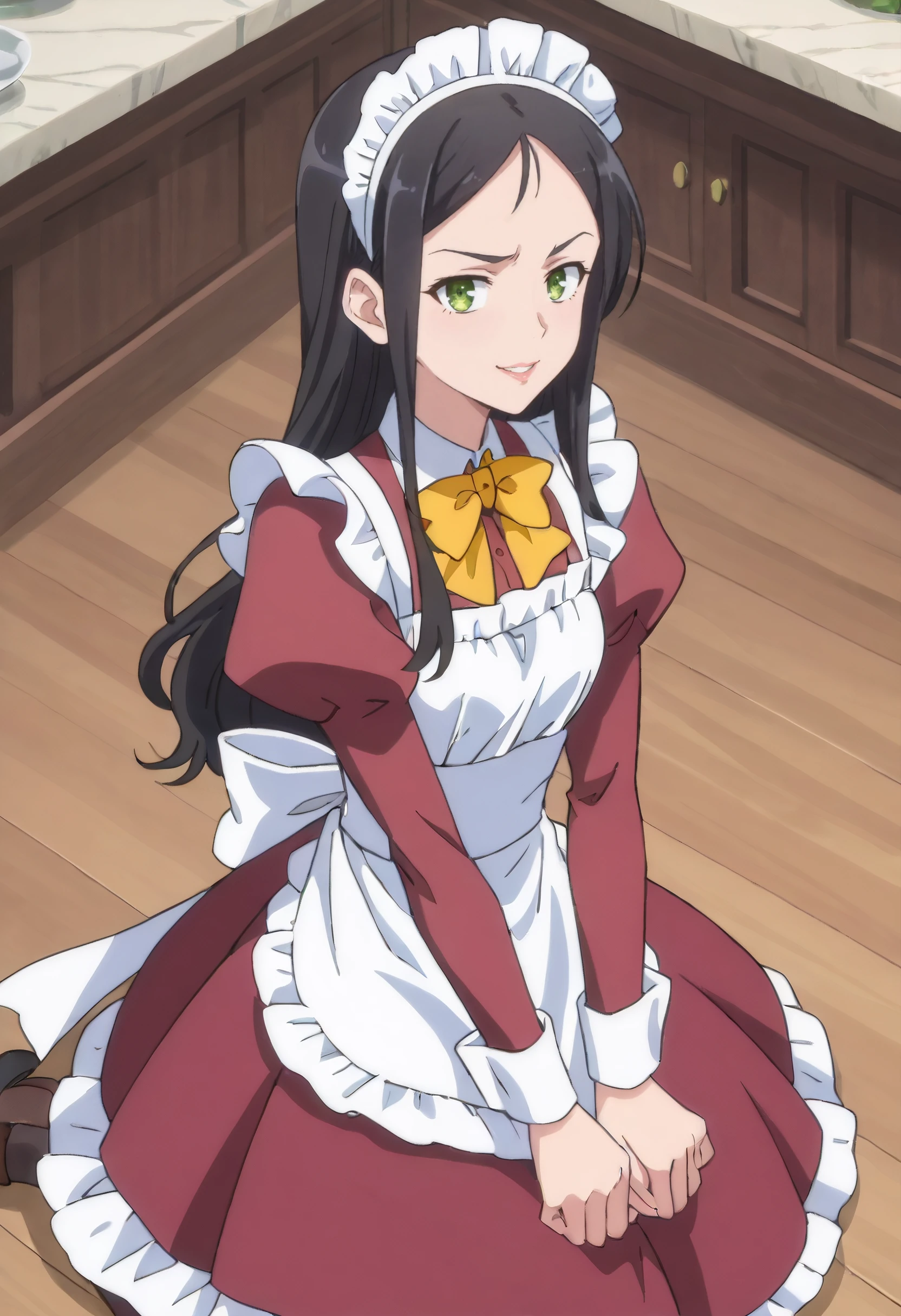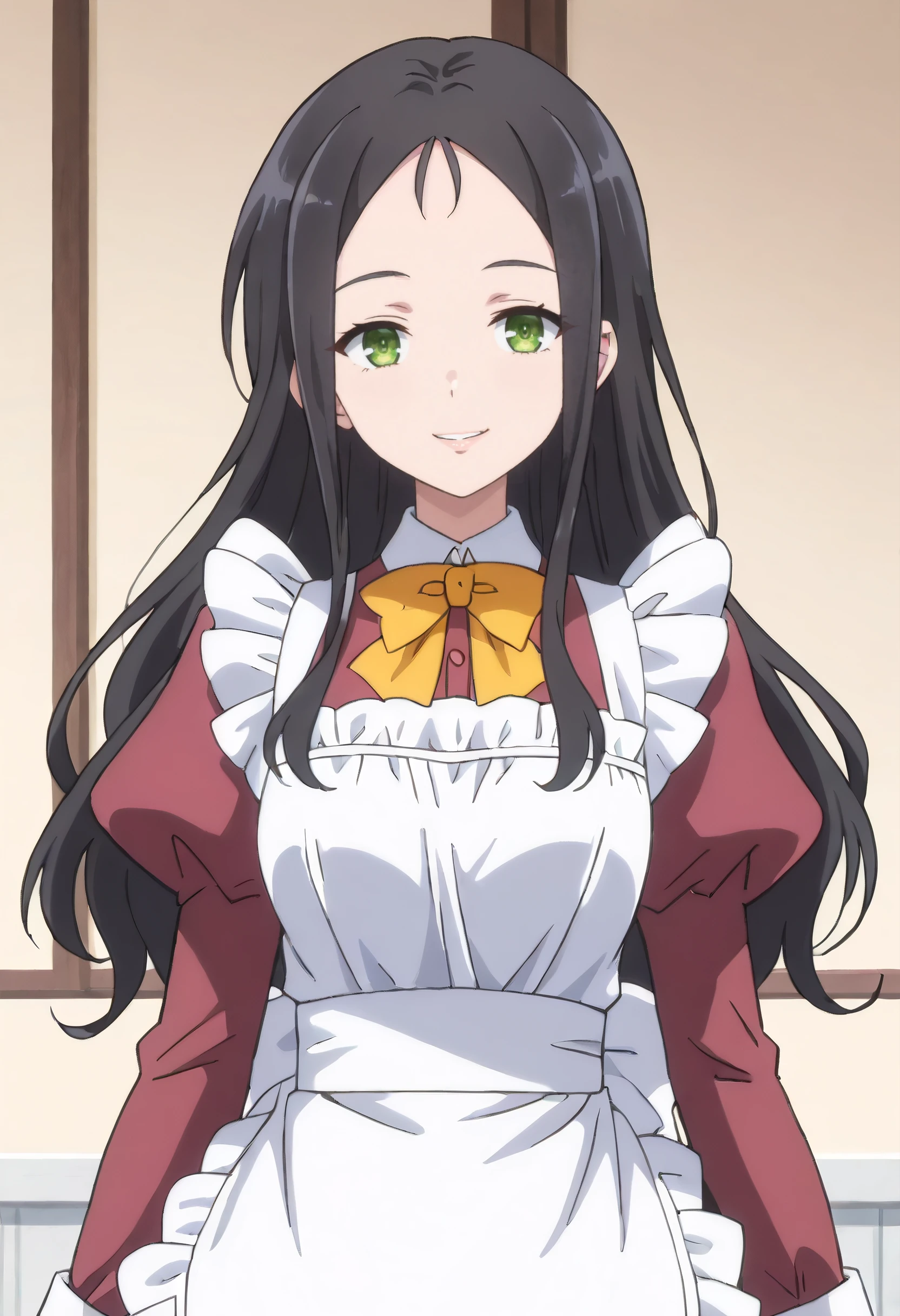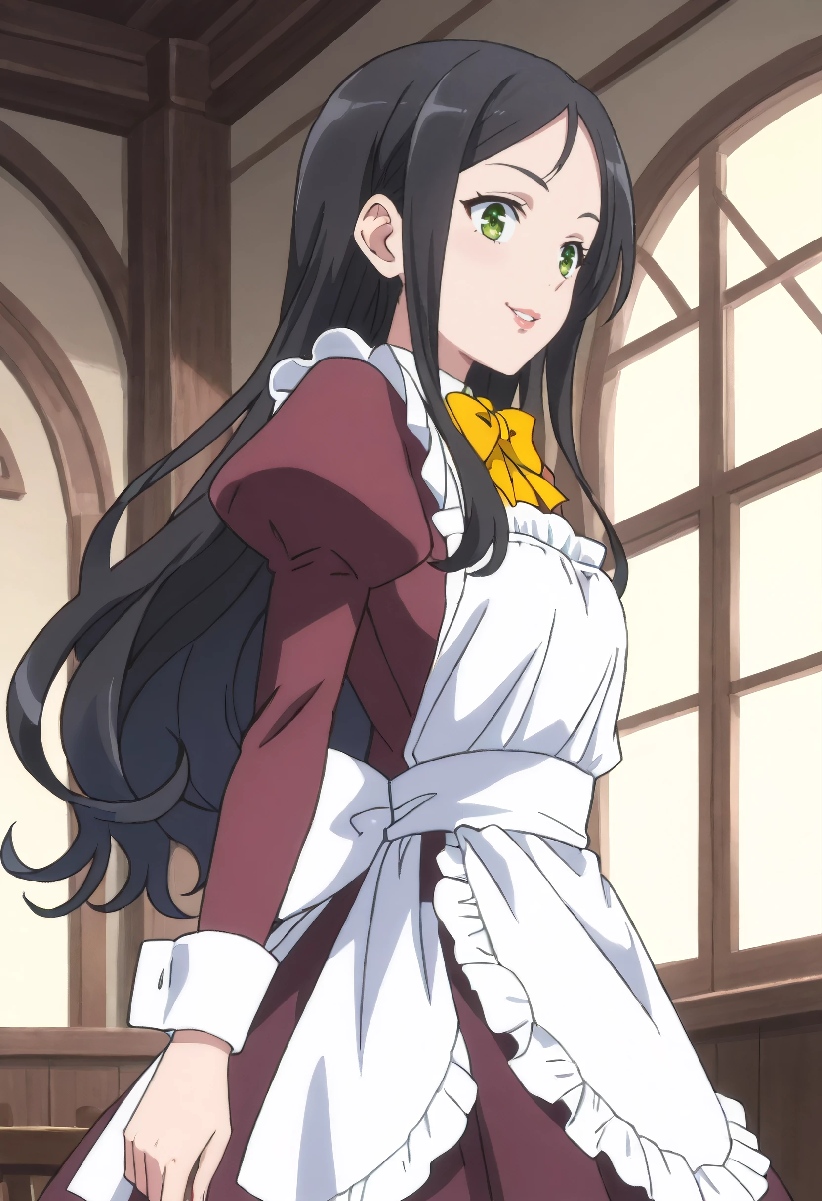 bow, yellow bow, yellow bowtie, puffy sleeves, long sleeves, bowtie, yellow neckwear, apron, maid, juliet sleeves, dress, maid apron, white apron, frilled apron, enmaided,